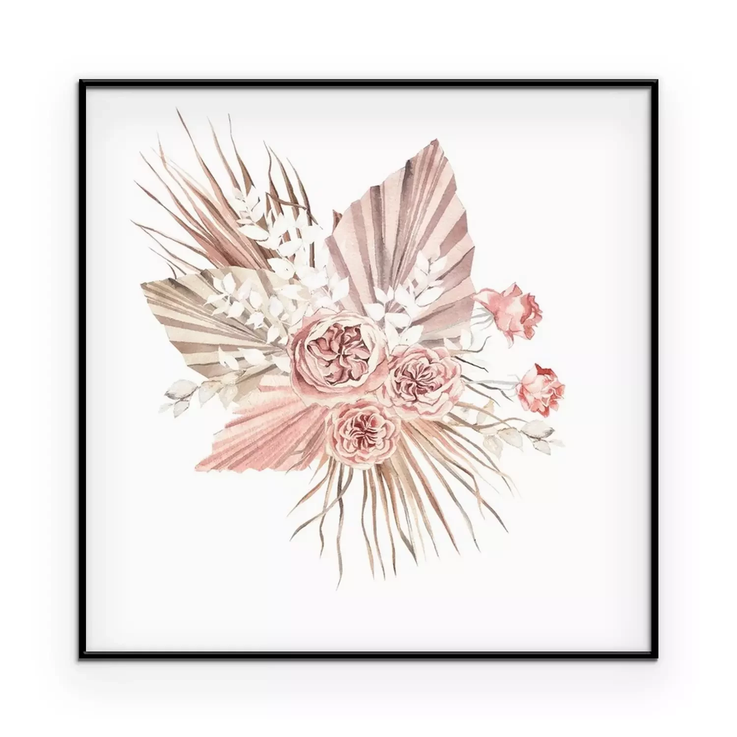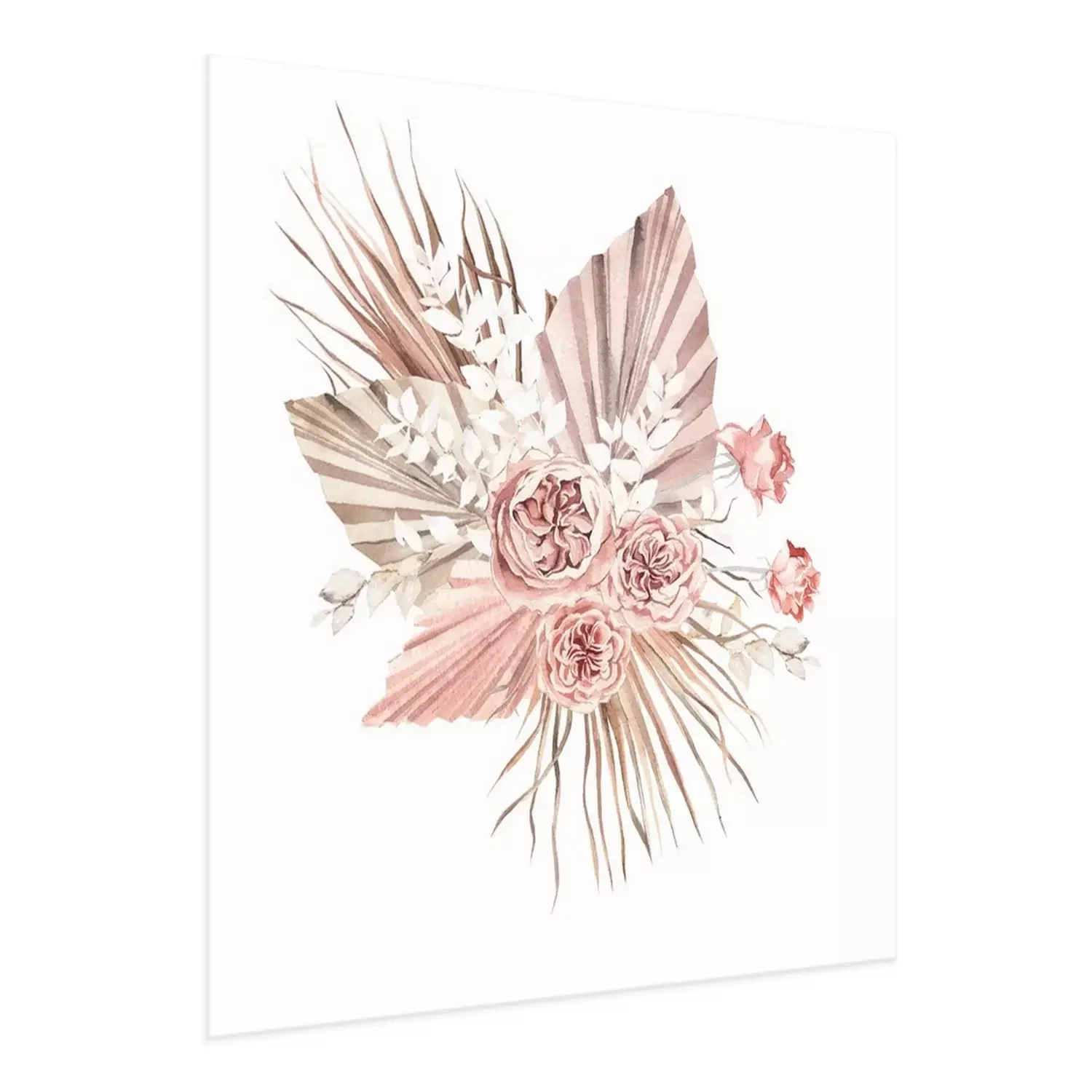 Poster : watercolor illustration. Wedding bouquet in boho style, peony roses, pampas grass, palm leaves, dried flowers. Design for invitations, weddings, baptism