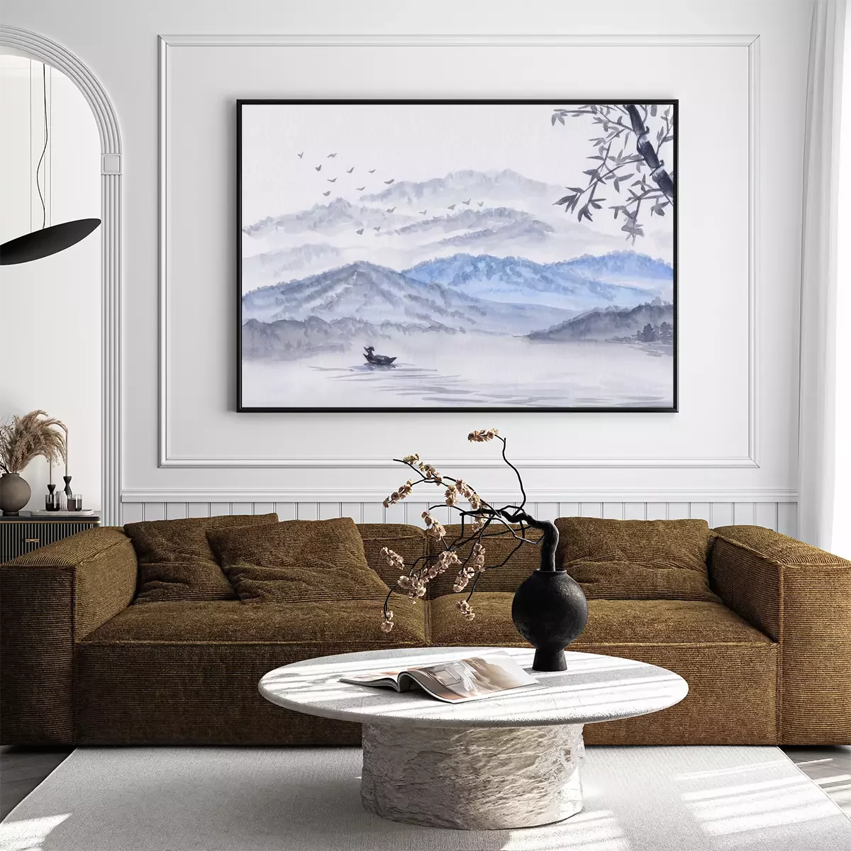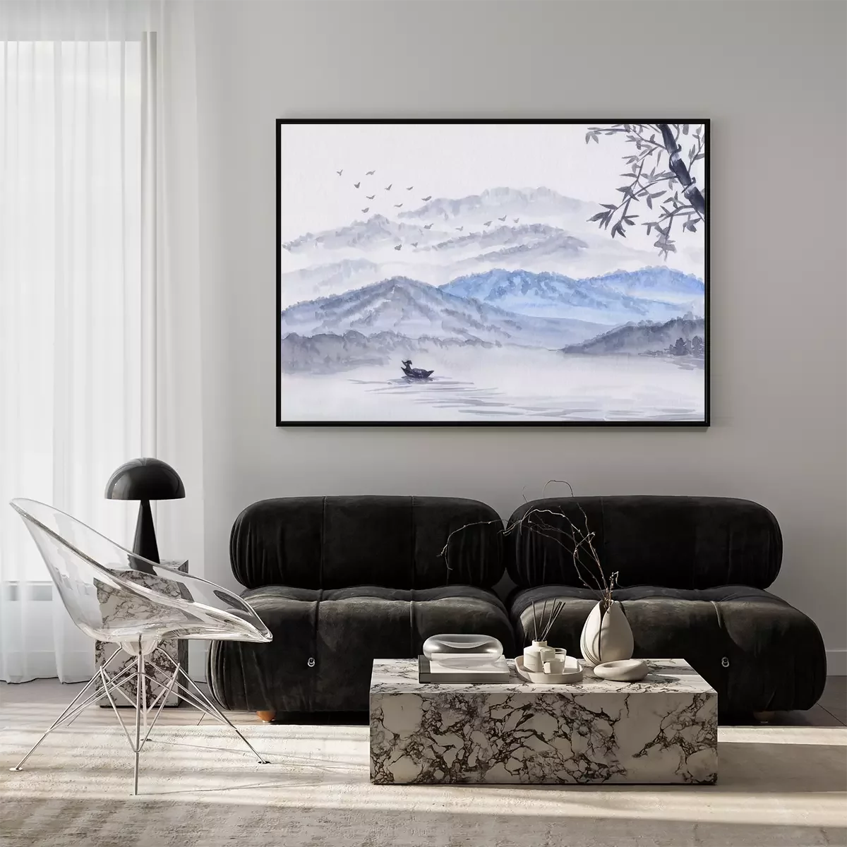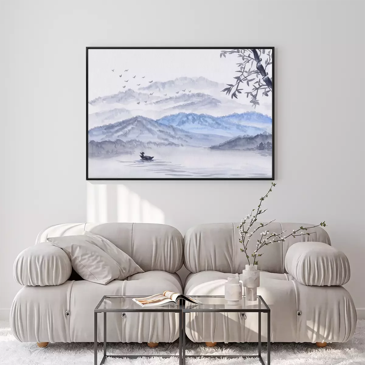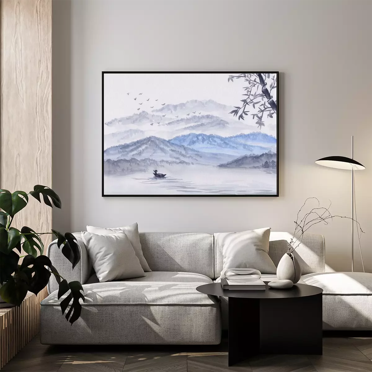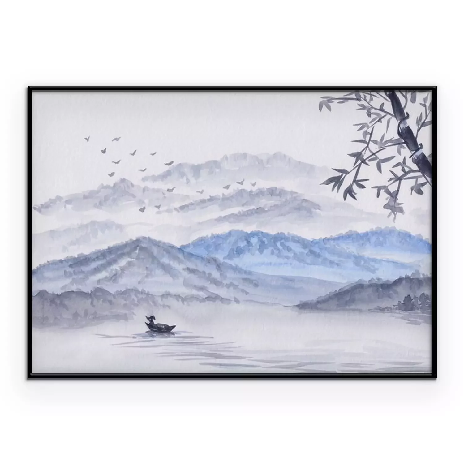 Poster : Watercolor Illustration with mountains, river & fisherman boat. Asian serene landscape with bamboo. Oriental style painting with layers of rocks & birds. Concept for restore meditation background.