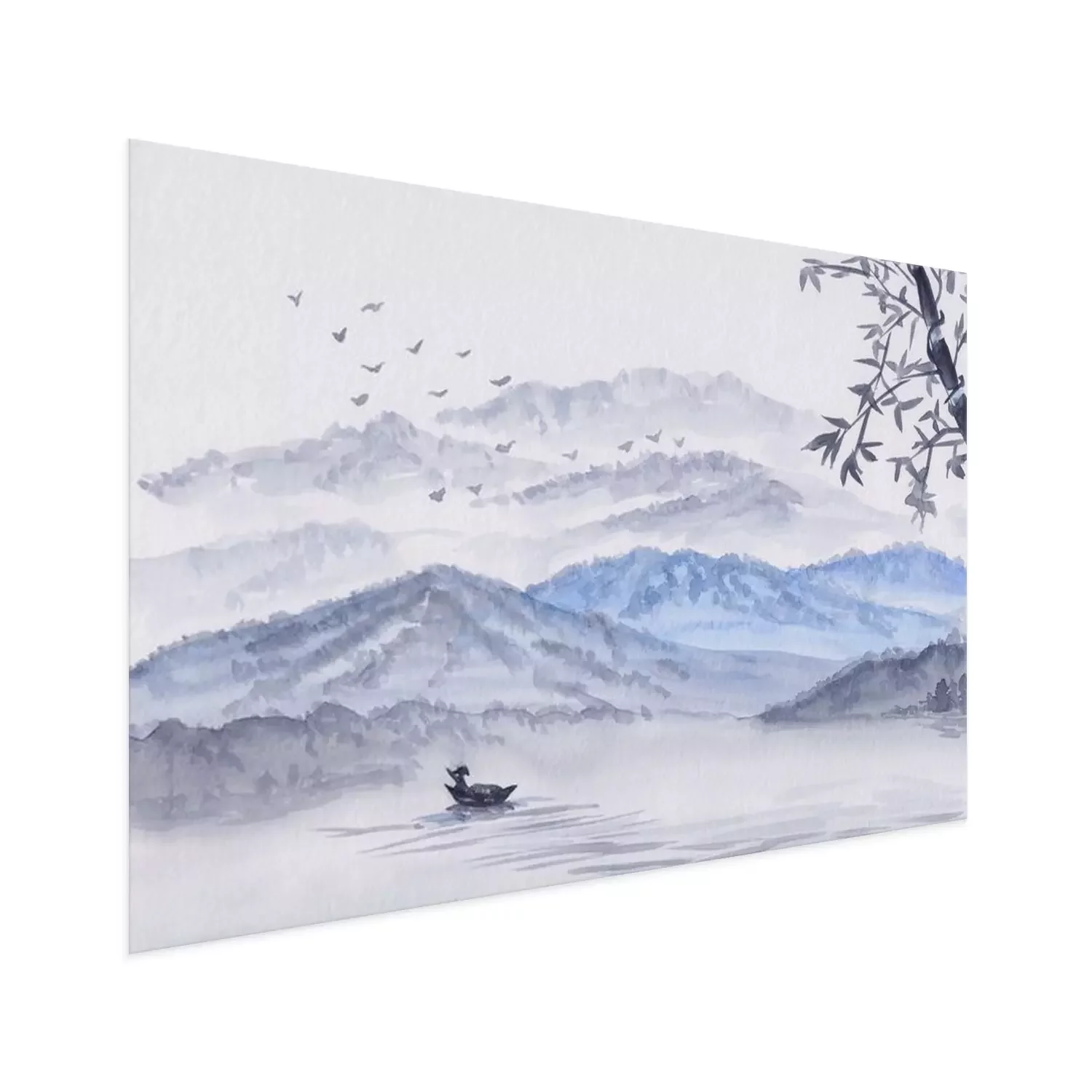 Poster  Watercolor Illustration with mountains, river & fisherman boat. Asian serene landscape with bamboo. Oriental style painting with layers of rocks & birds. Concept for restore meditation background.
