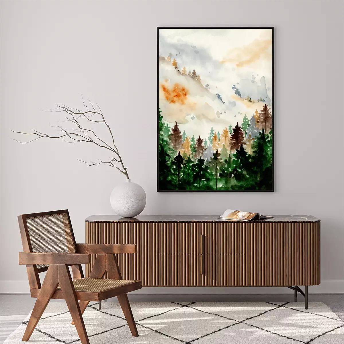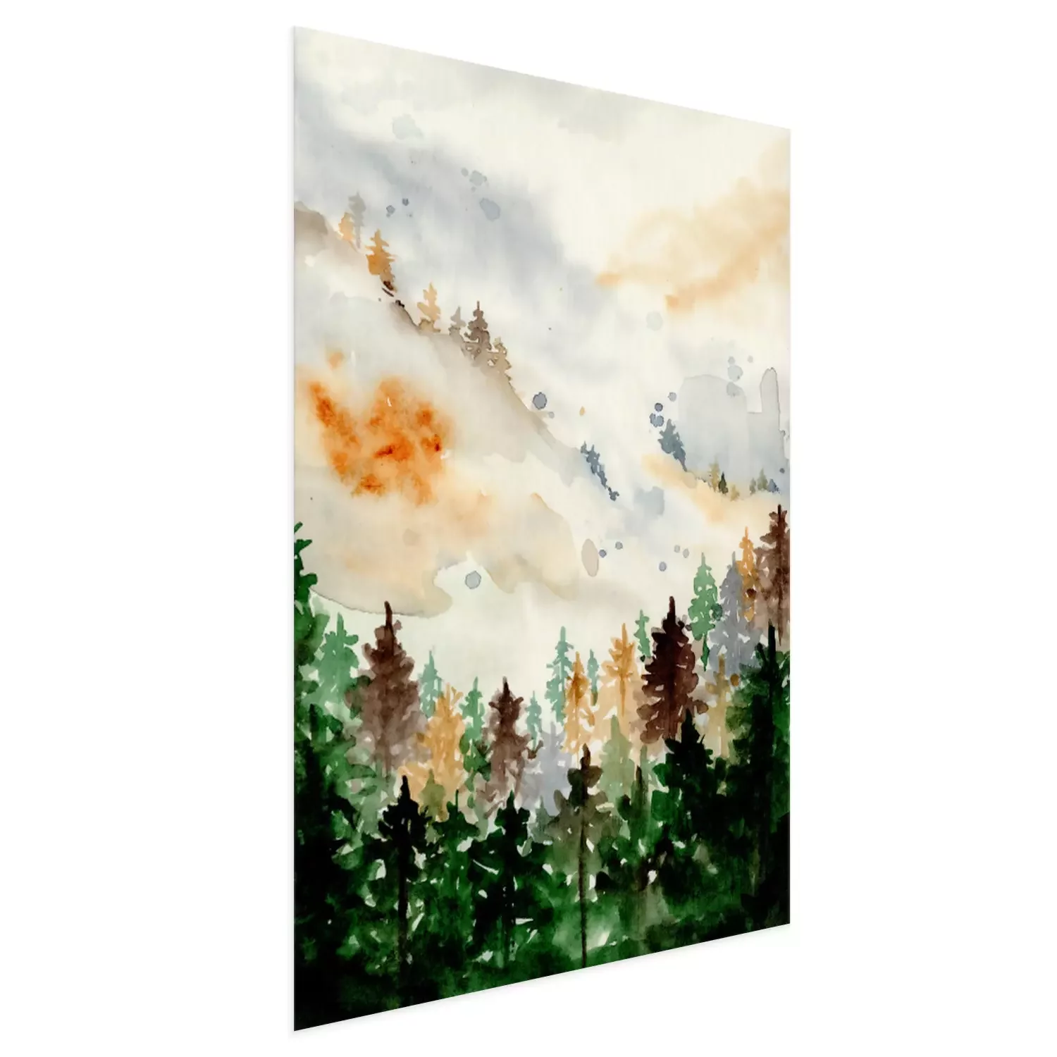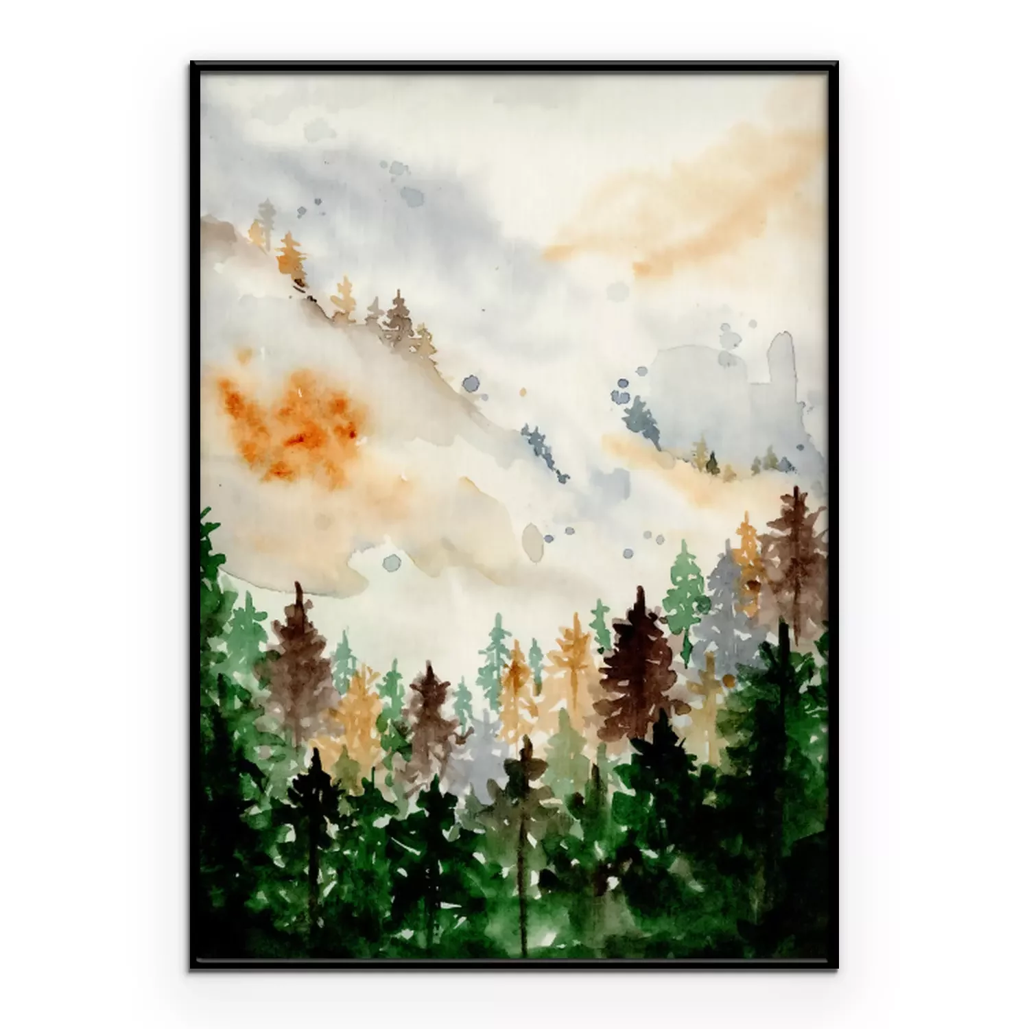 Poster  watercolor landscape with pine and fir trees and mountains abstract nature background
