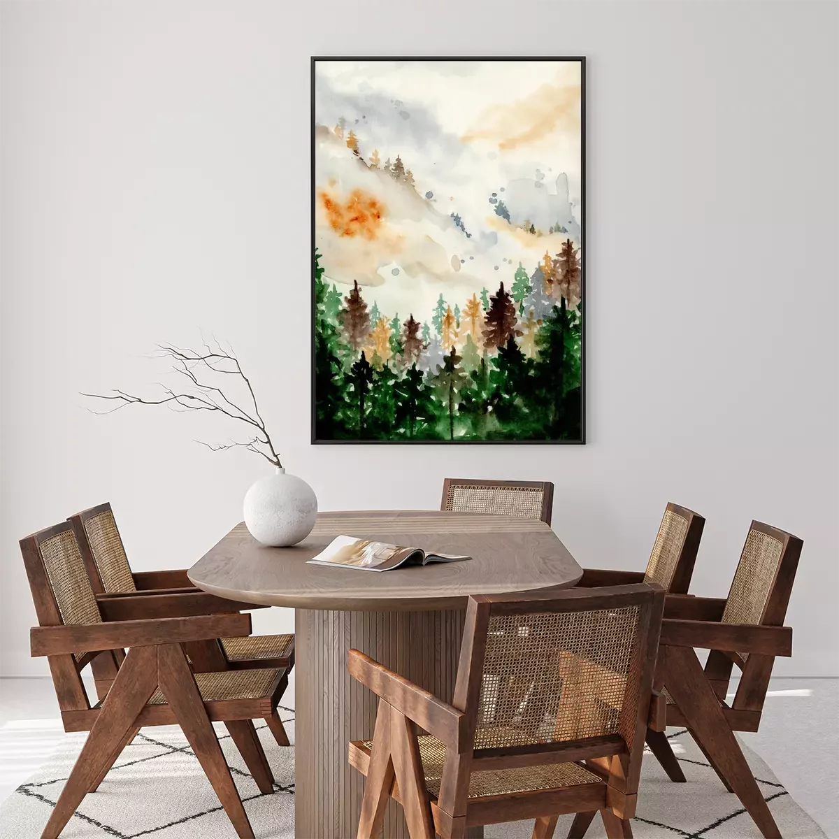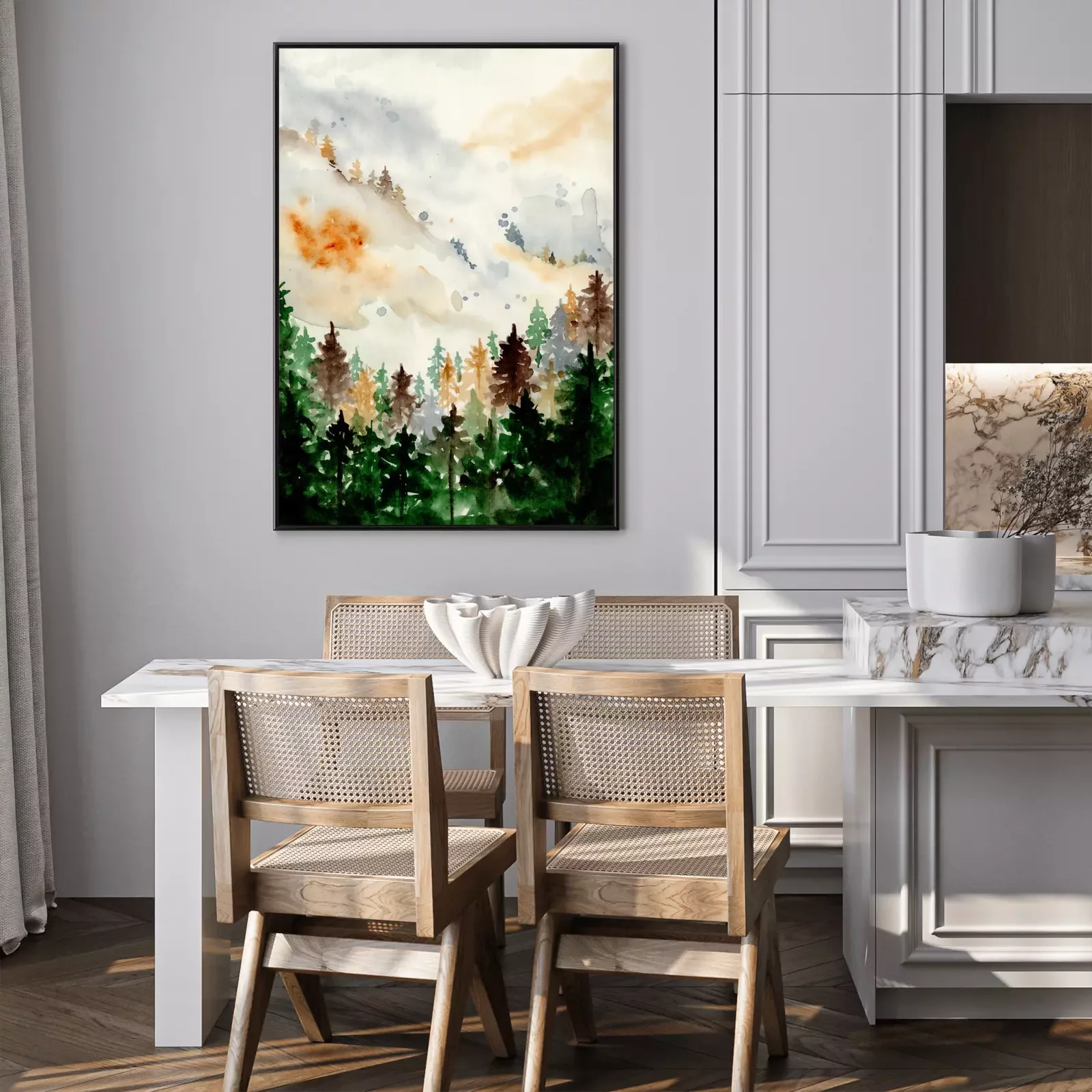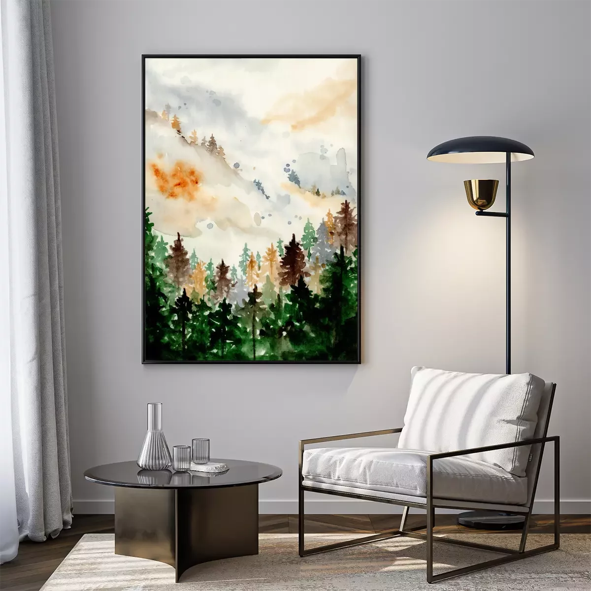 Poster  watercolor landscape with pine and fir trees and mountains abstract nature background