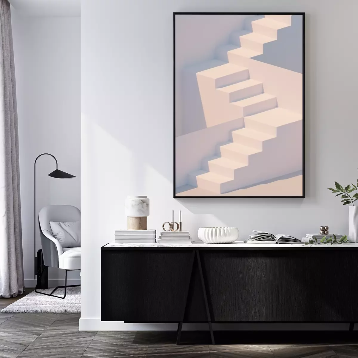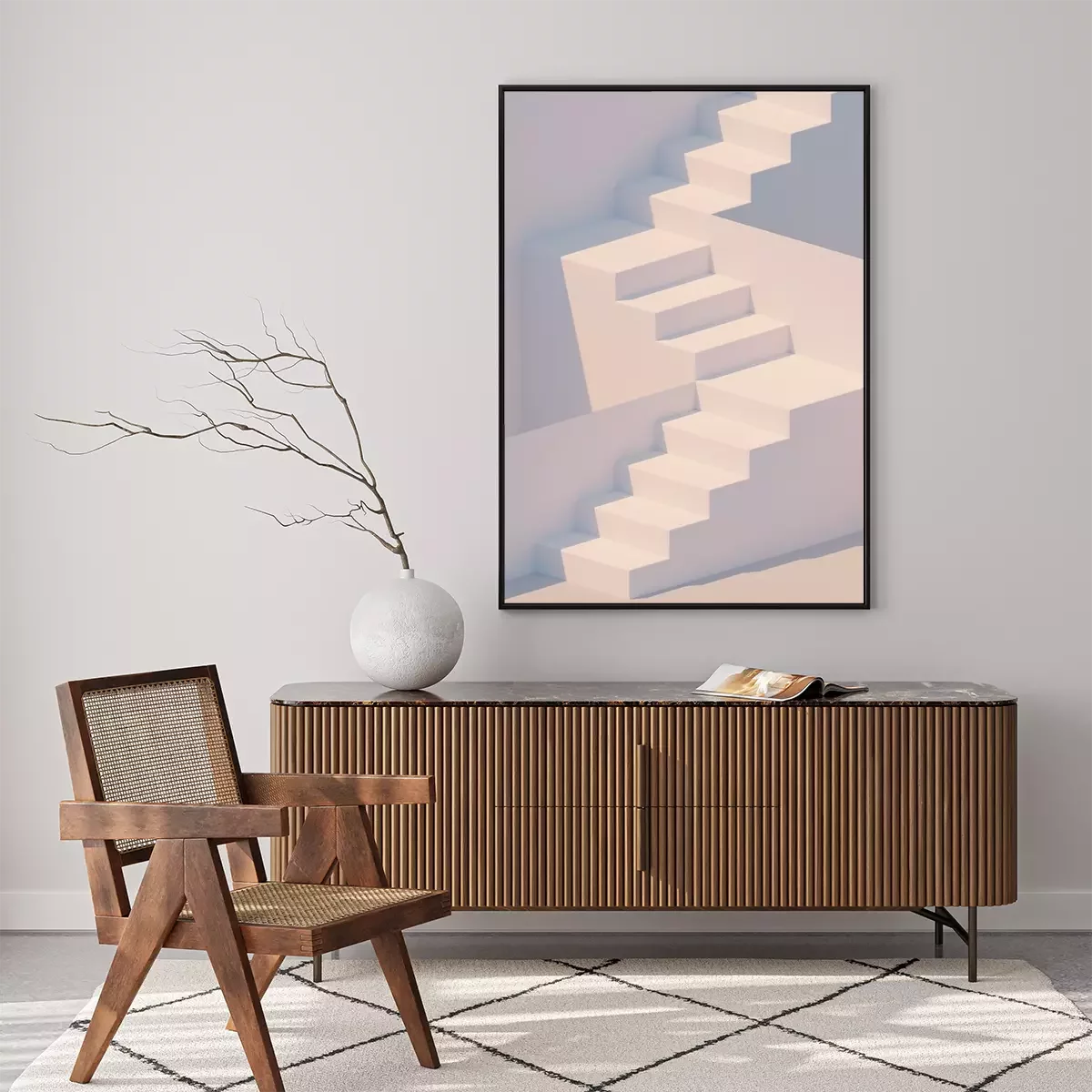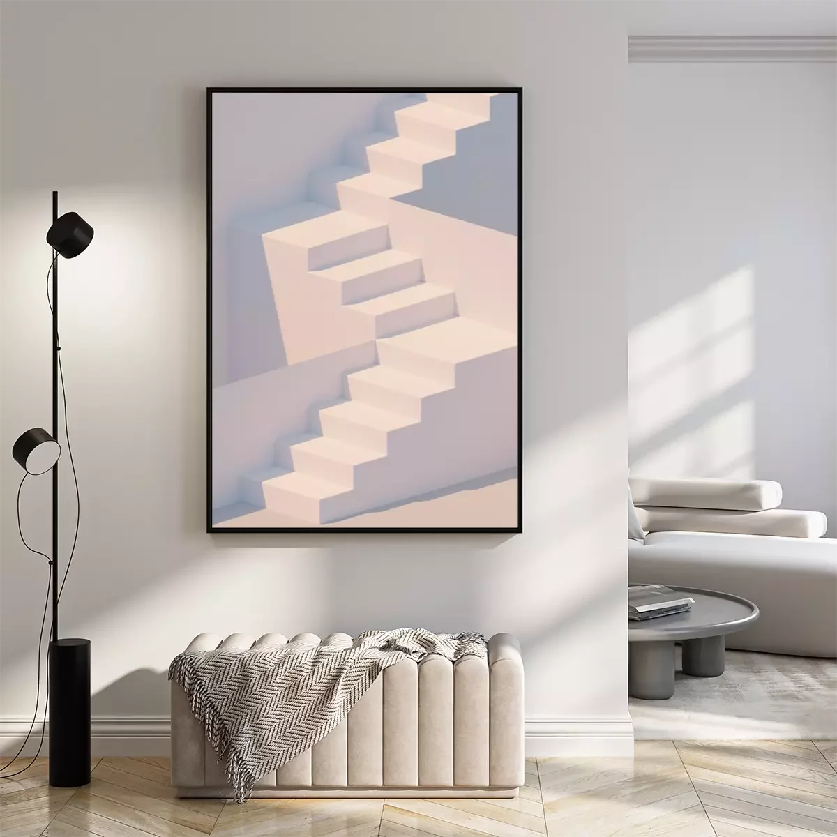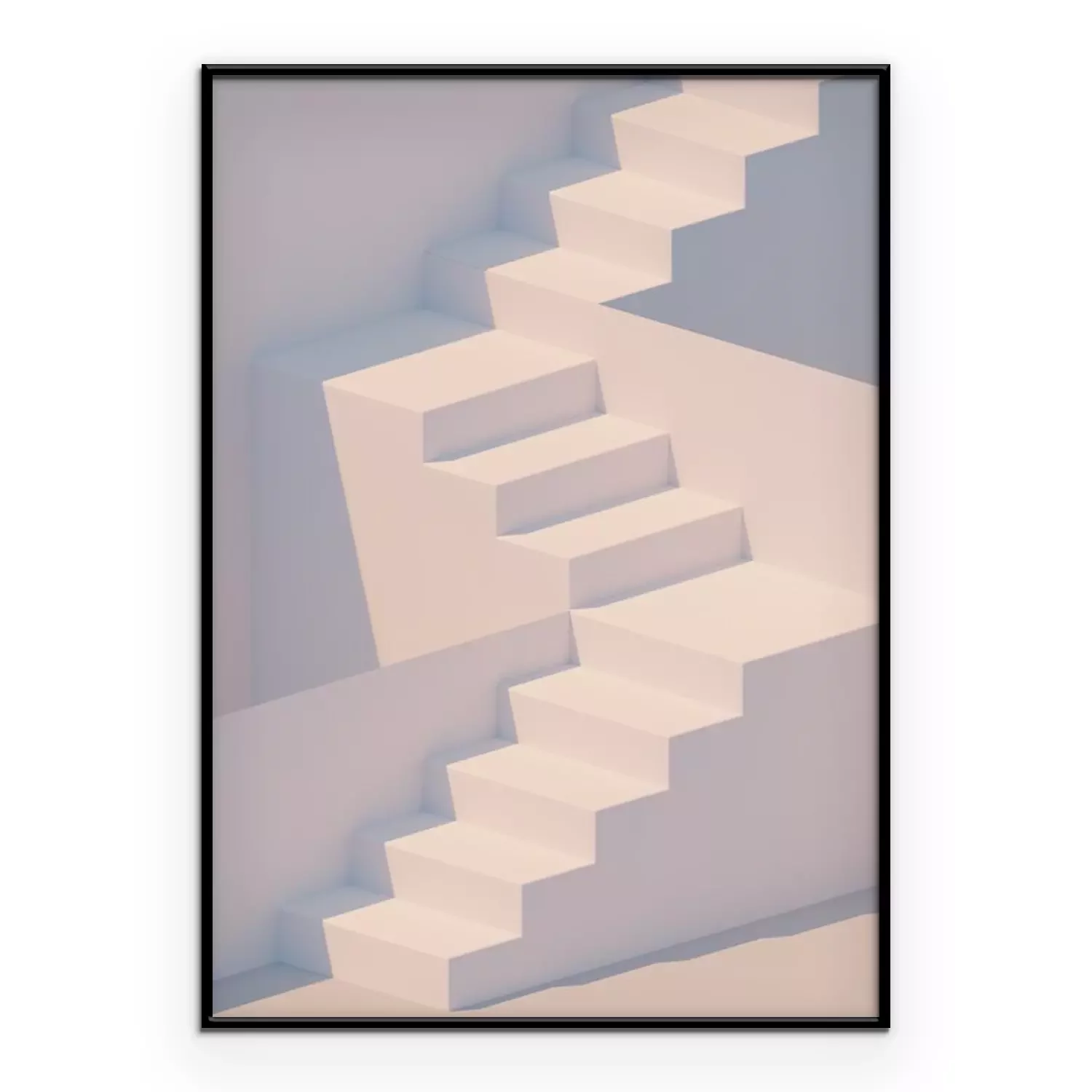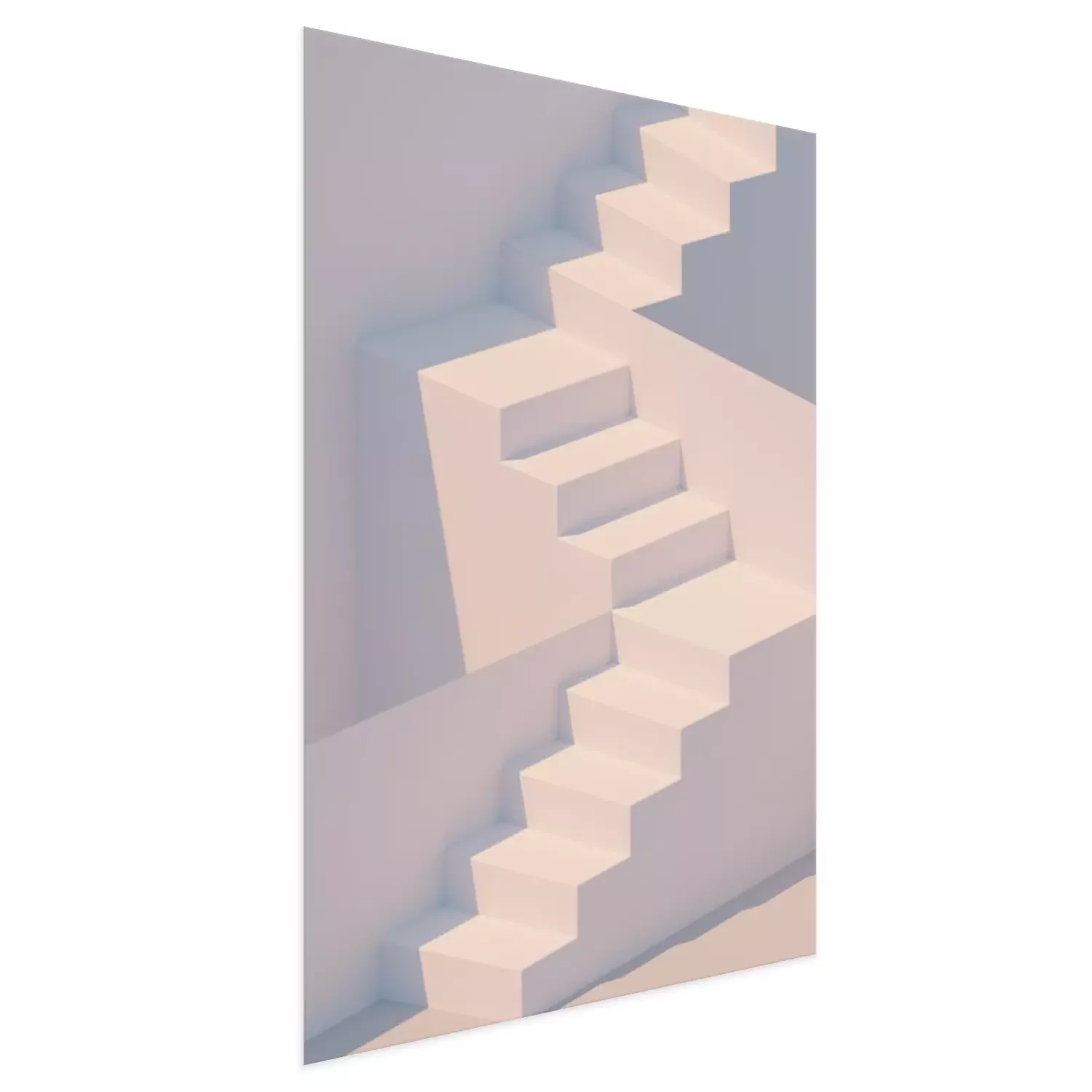 Poster  White stairs 3d rendering. Staircase minimal background.