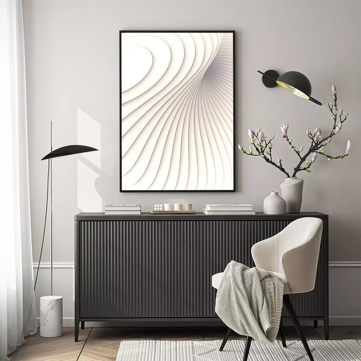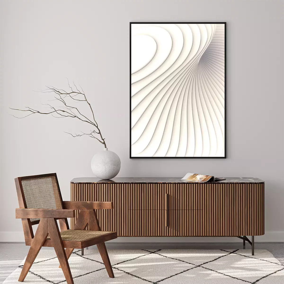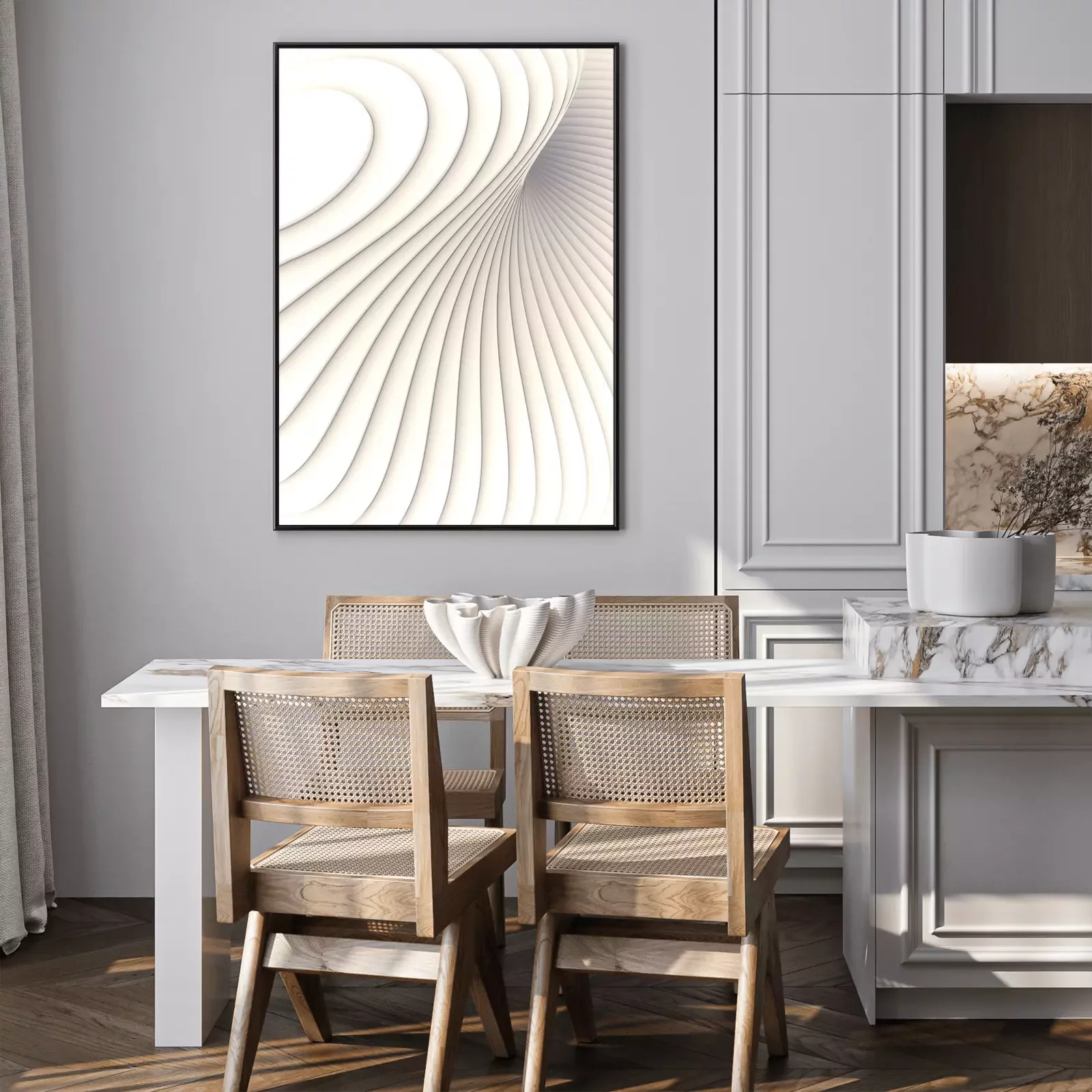 Poster  White striped futuristic pattern surrounded by light mist. Computer generated geometric shape. 3d render illustration