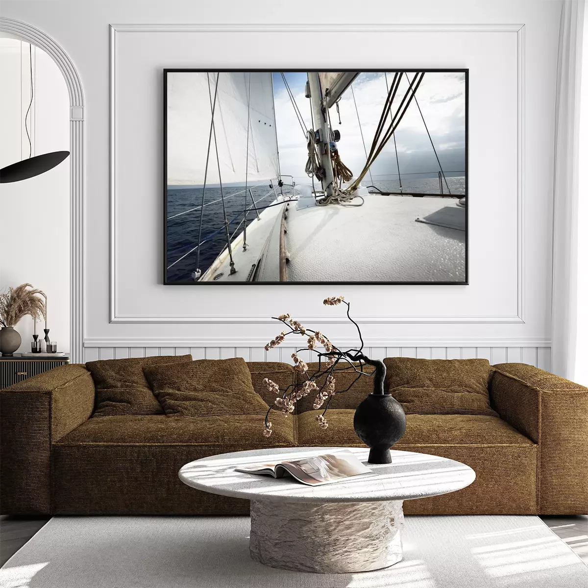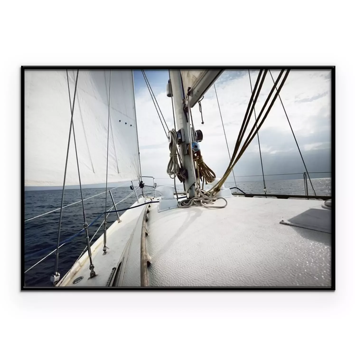 Poster  White yacht sailing on a sunny summer day. Close-up view from the deck to the bow, mast and sails. Waves and water splashes. Clear blue sky. Gulf of Finland