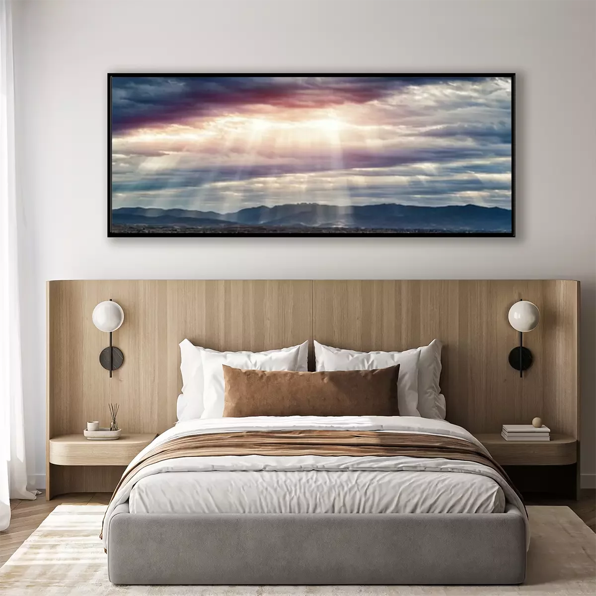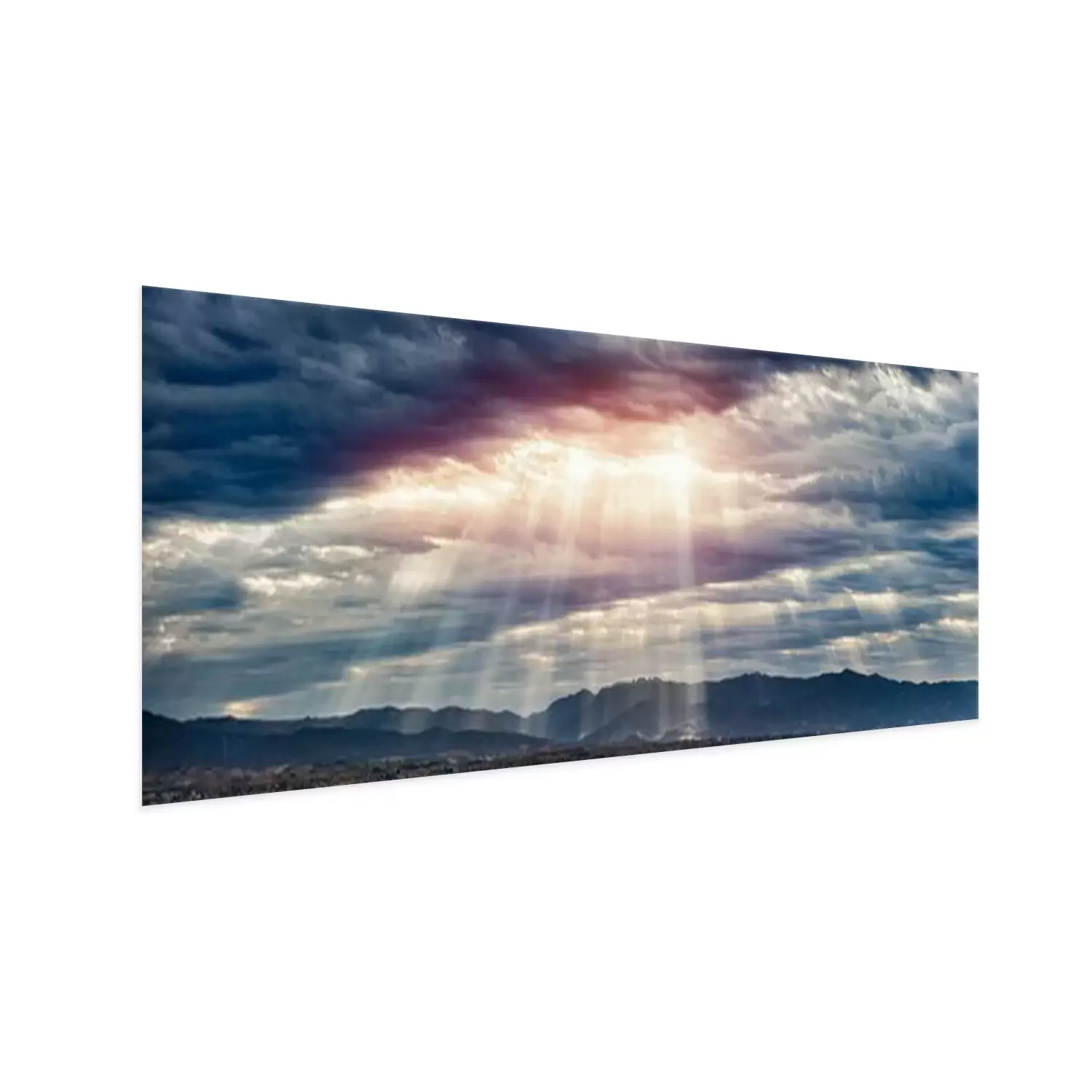Poster : Feu de lumière à travers les nuages ​​sur les montagnes - Des rayons de lumière qui brillent à travers des nuages ​​sombres, un ciel dramatique avec un nuage