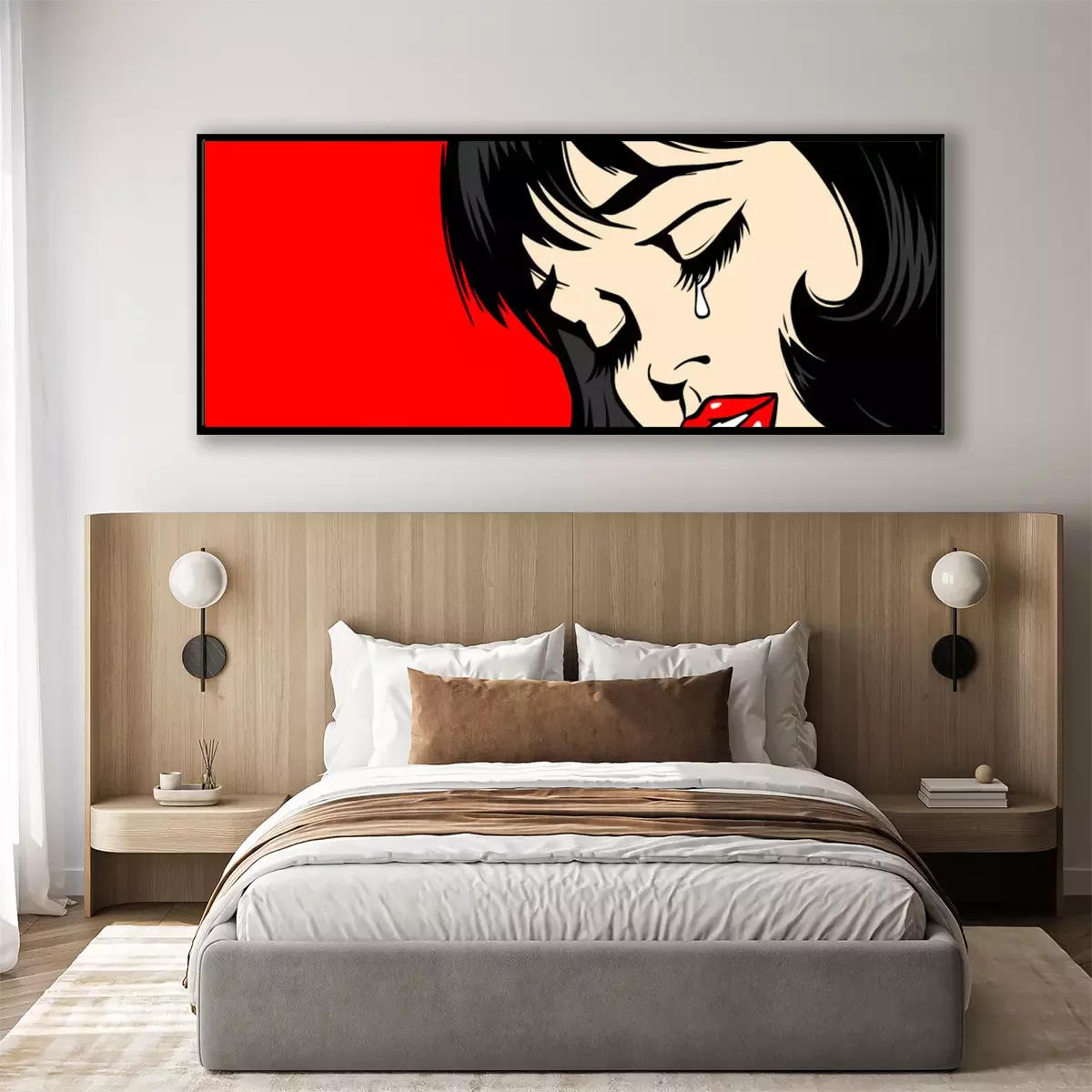 Poster  Pop Art Woman сlose-up. beautiful girl in pop art style crying. tear on the lady's face. The lush red lips of a sexy brunette. Vector. Illustration on red background. Women Health. Menstruation.