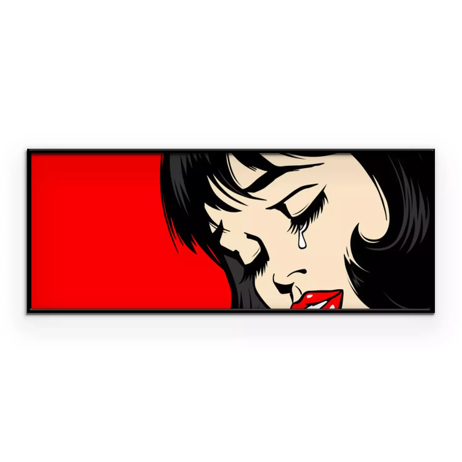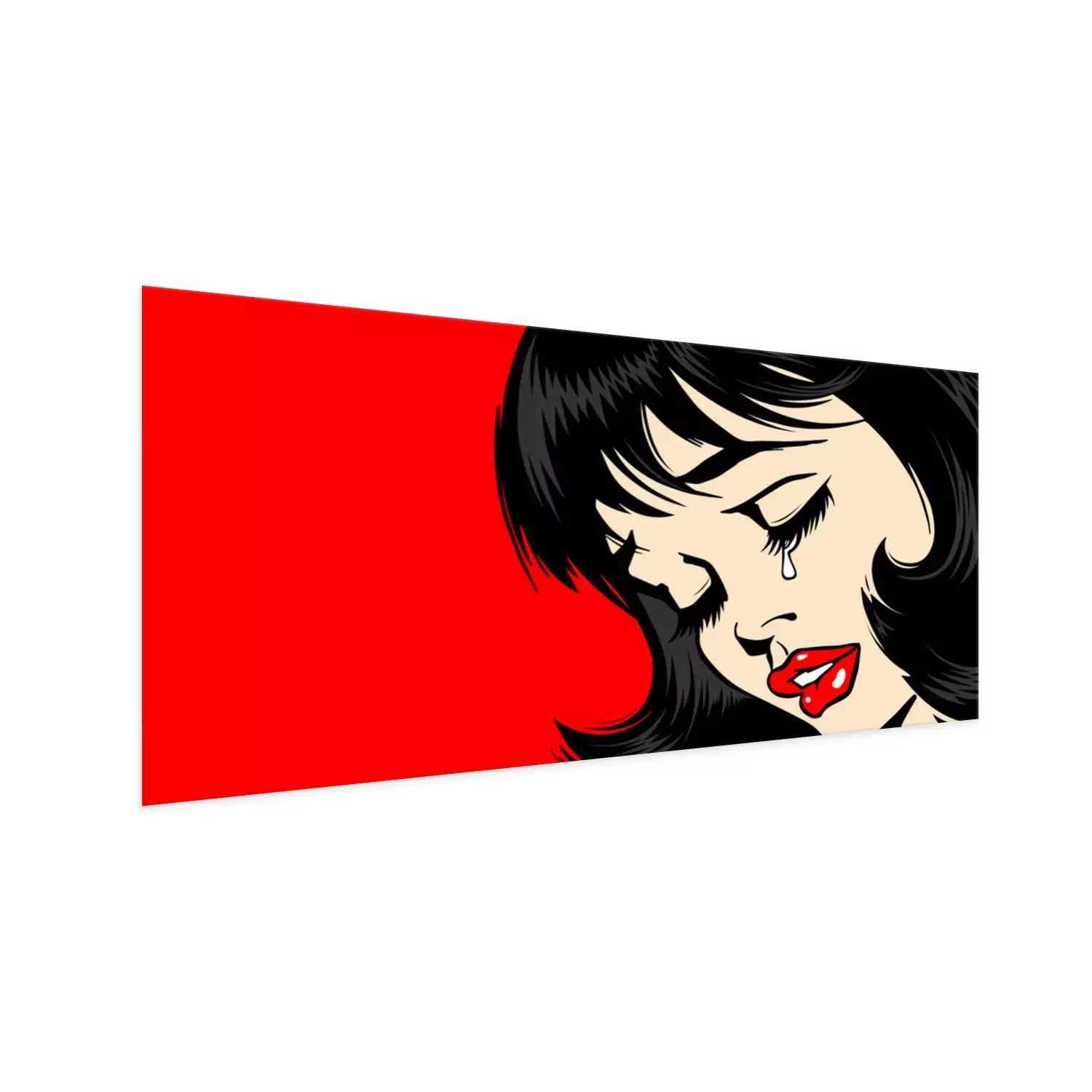 Poster : Pop Art Woman сlose-up. beautiful girl in pop art style crying. tear on the lady's face. The lush red lips of a sexy brunette. Vector. Illustration on red background. Women Health. Menstruation.