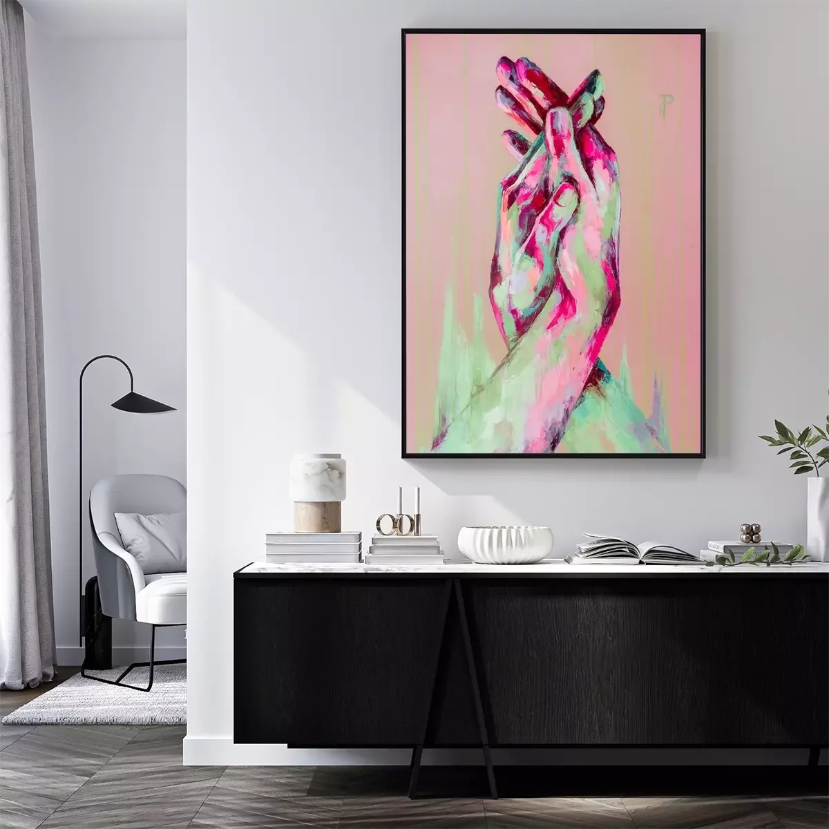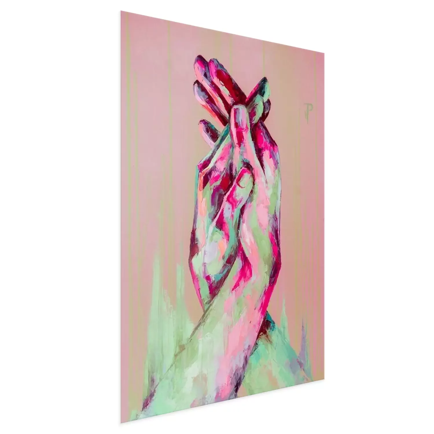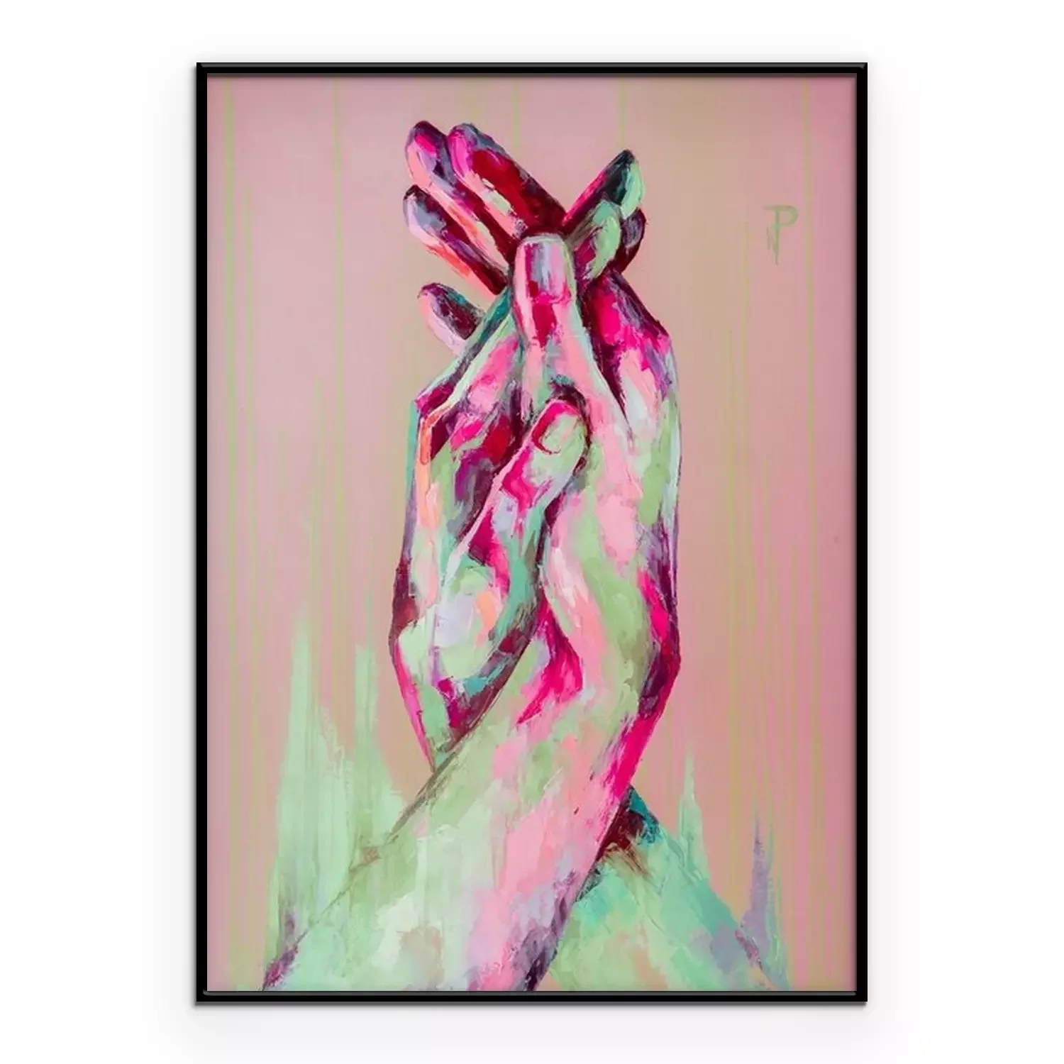 Poster  “Support” - oil painting. Conceptual abstract picture of holding hands. The background is painted with acrylic with smudges. Conceptual abstract closeup of an oil painting and palette knife on canvas.