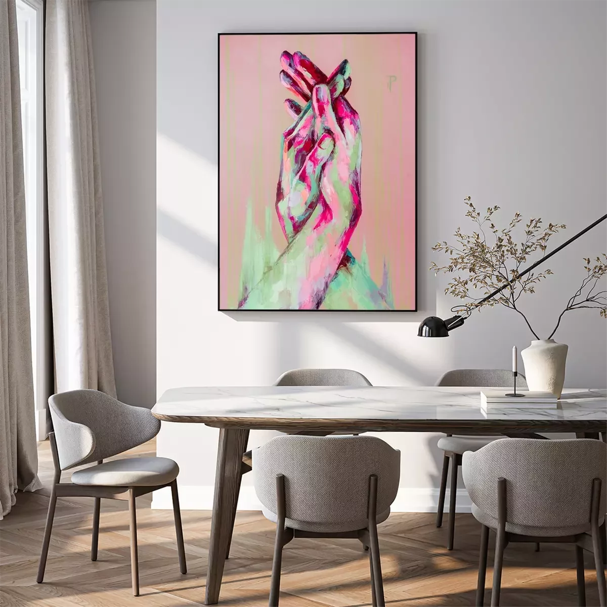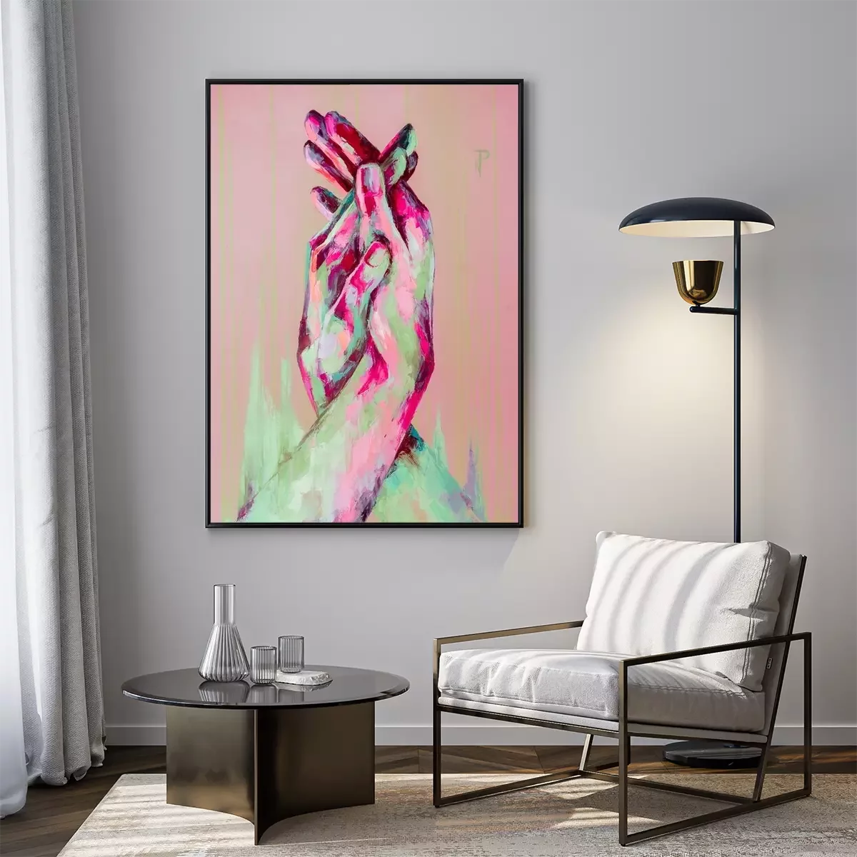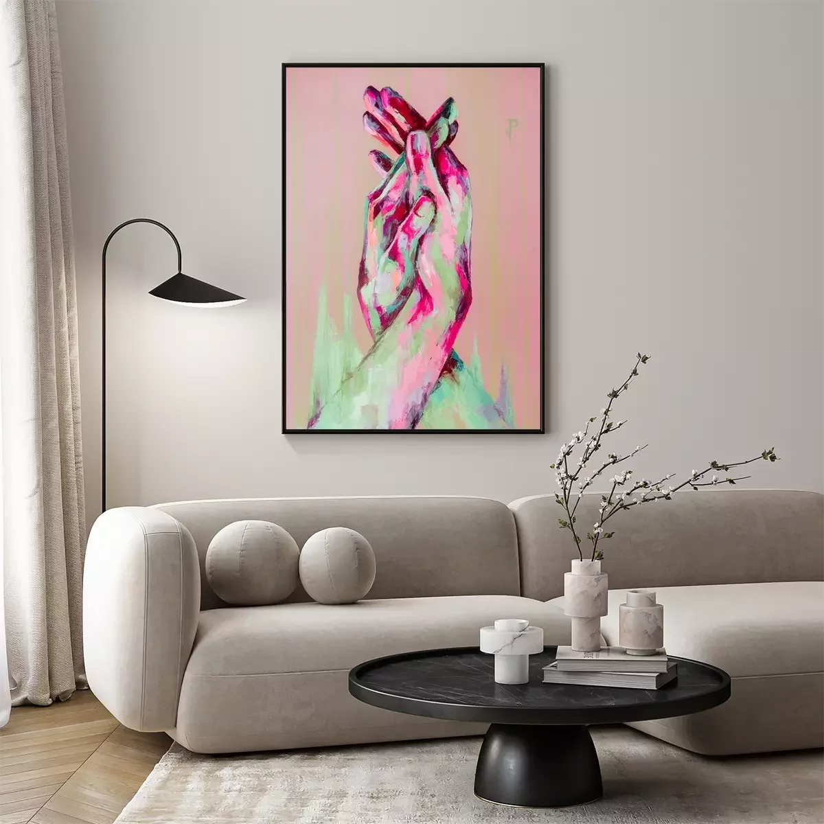 Poster  “Support” - oil painting. Conceptual abstract picture of holding hands. The background is painted with acrylic with smudges. Conceptual abstract closeup of an oil painting and palette knife on canvas.
