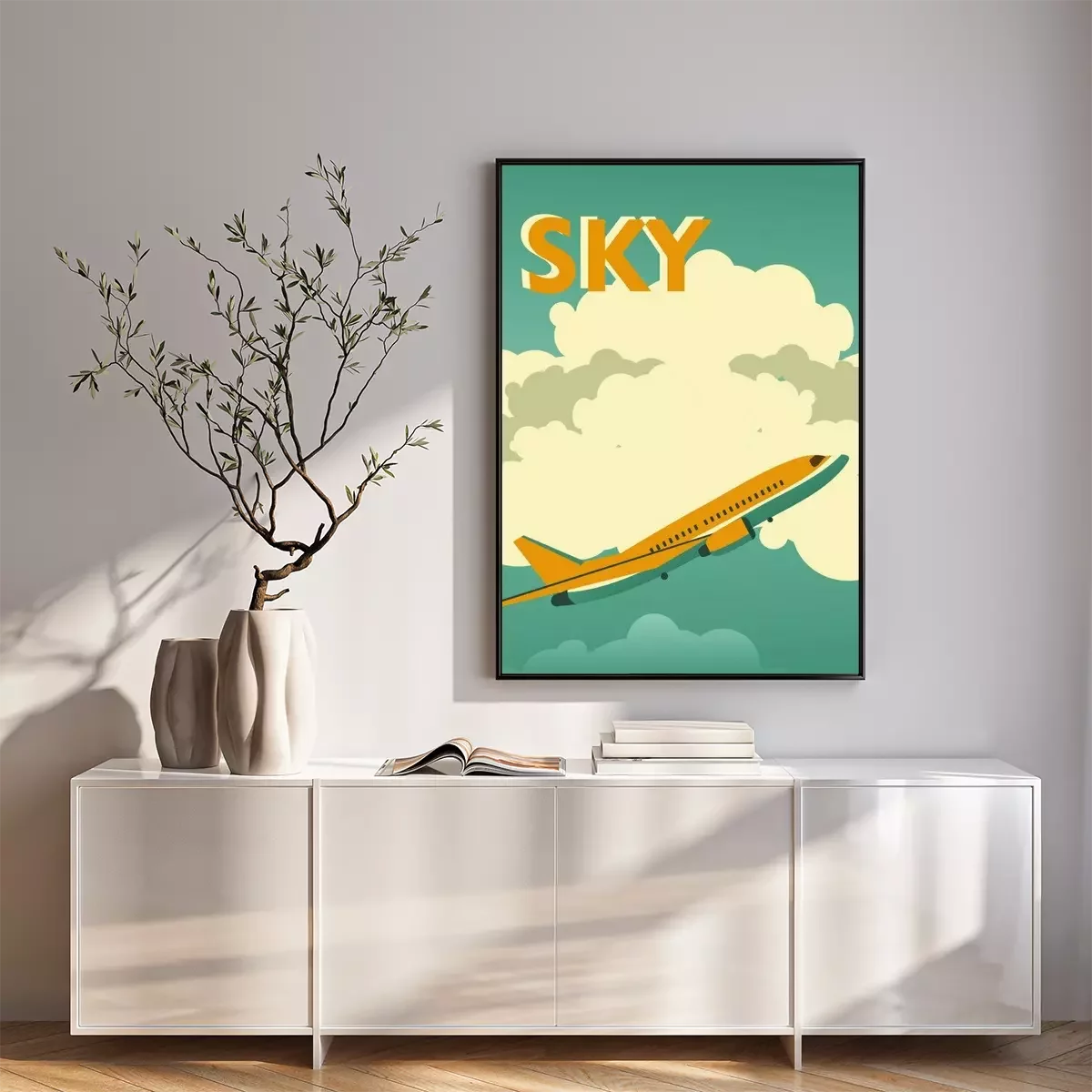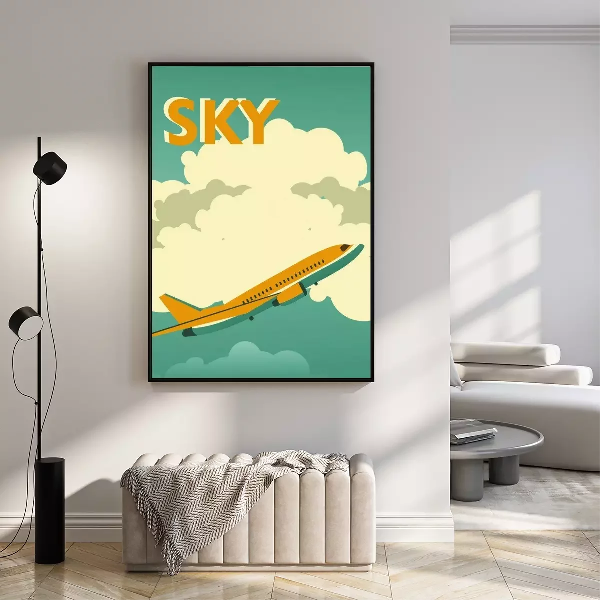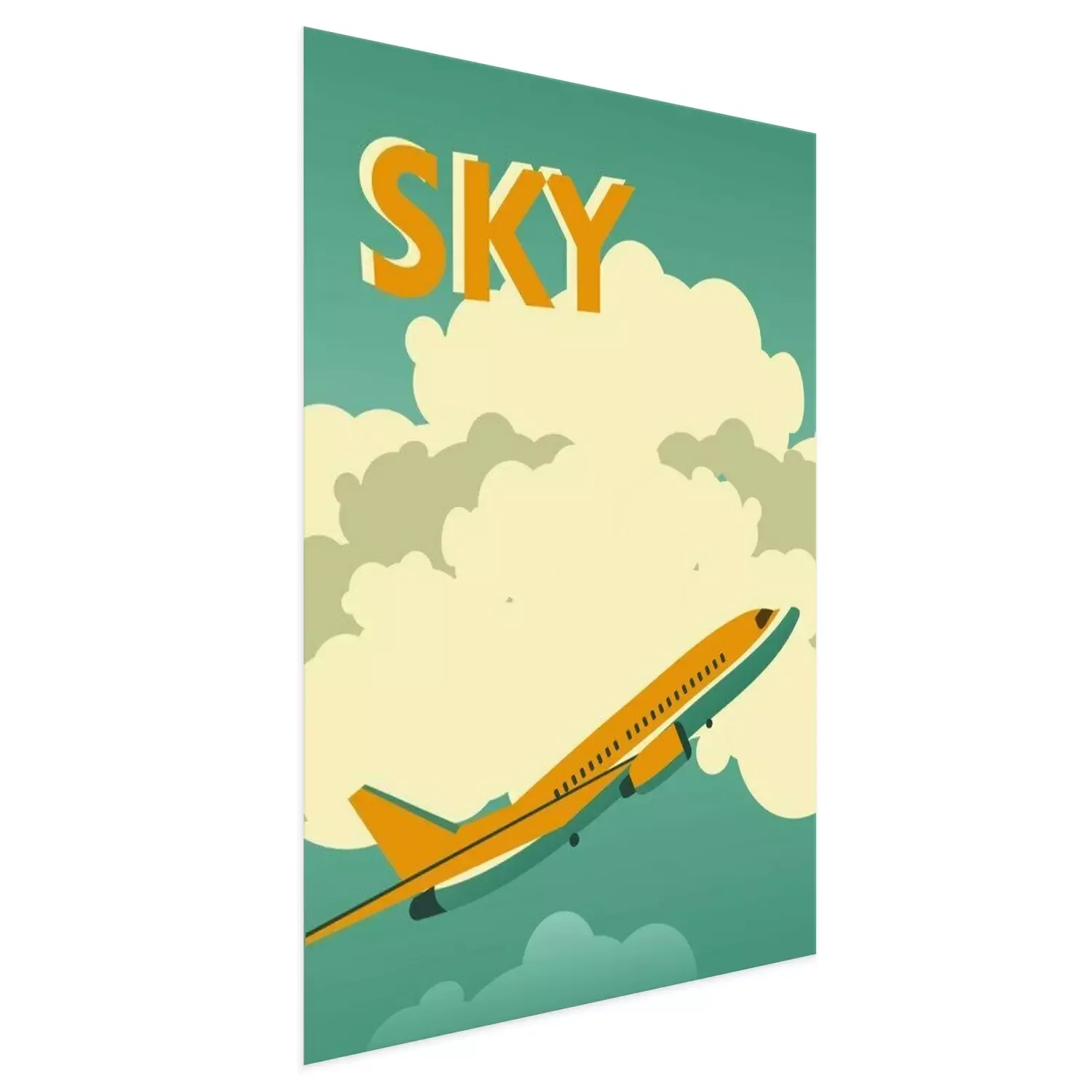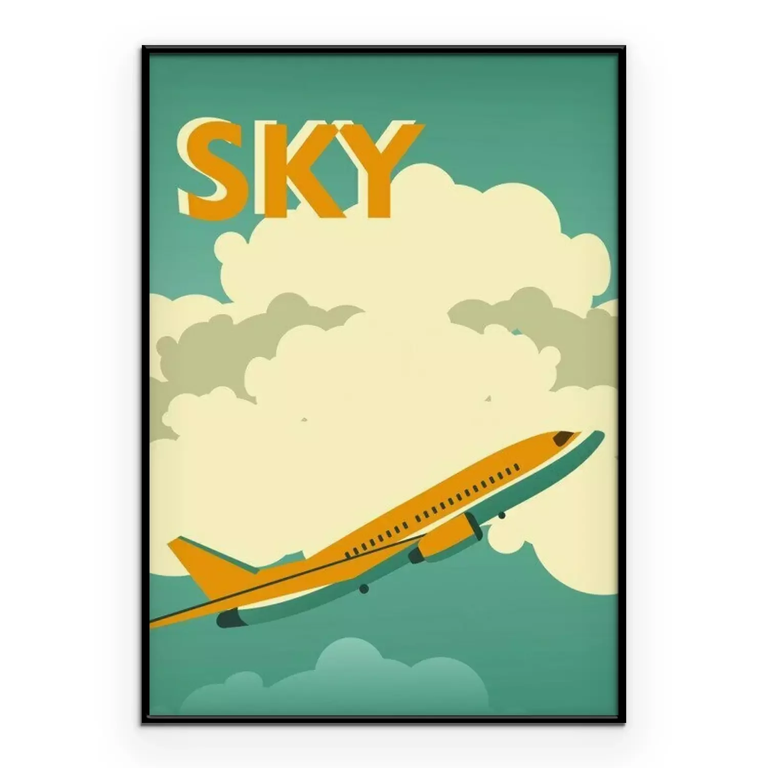 Poster : Un avion se détachant sur les nuages et le mot « Ciel » dans un style de dessin vintage