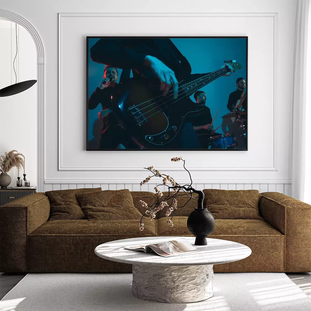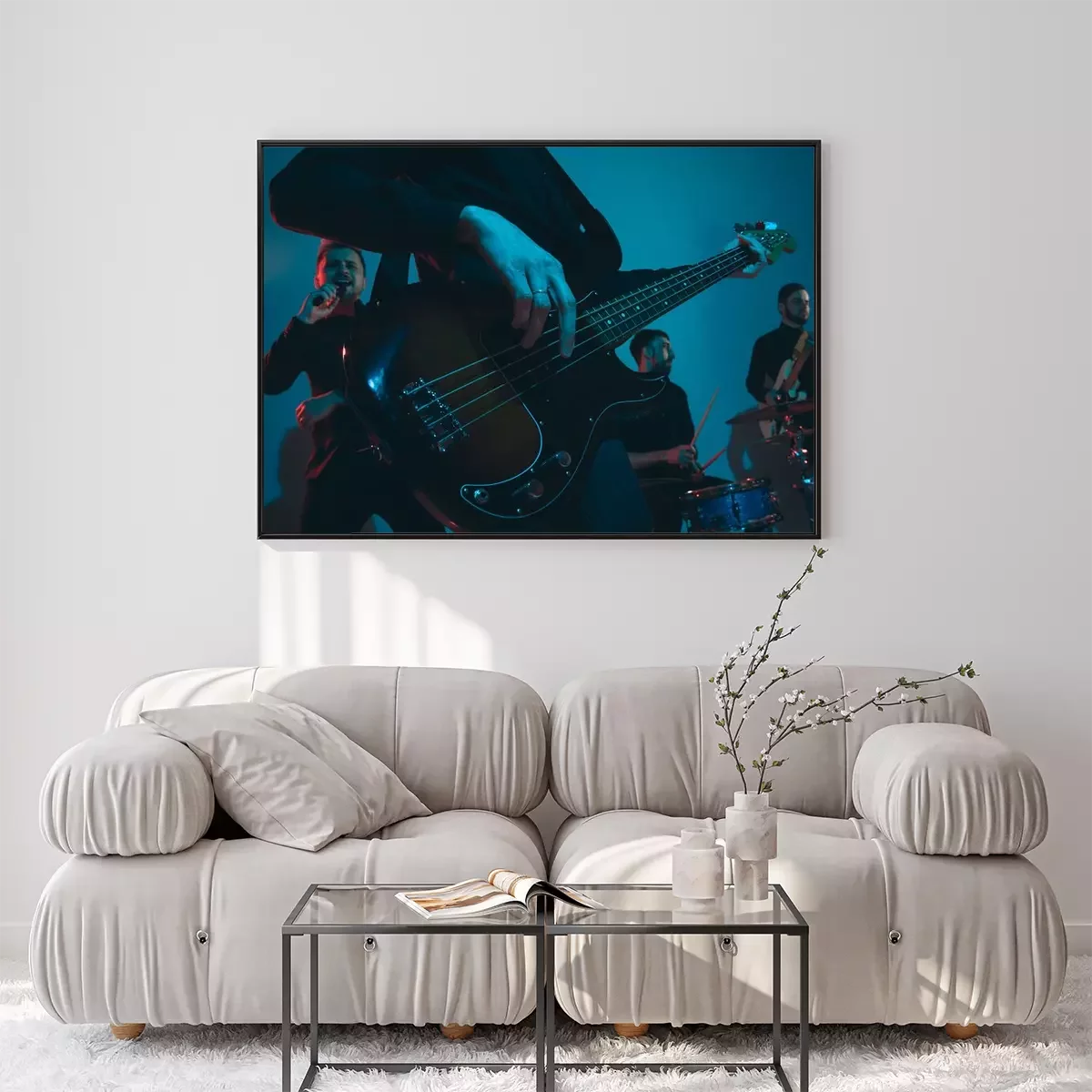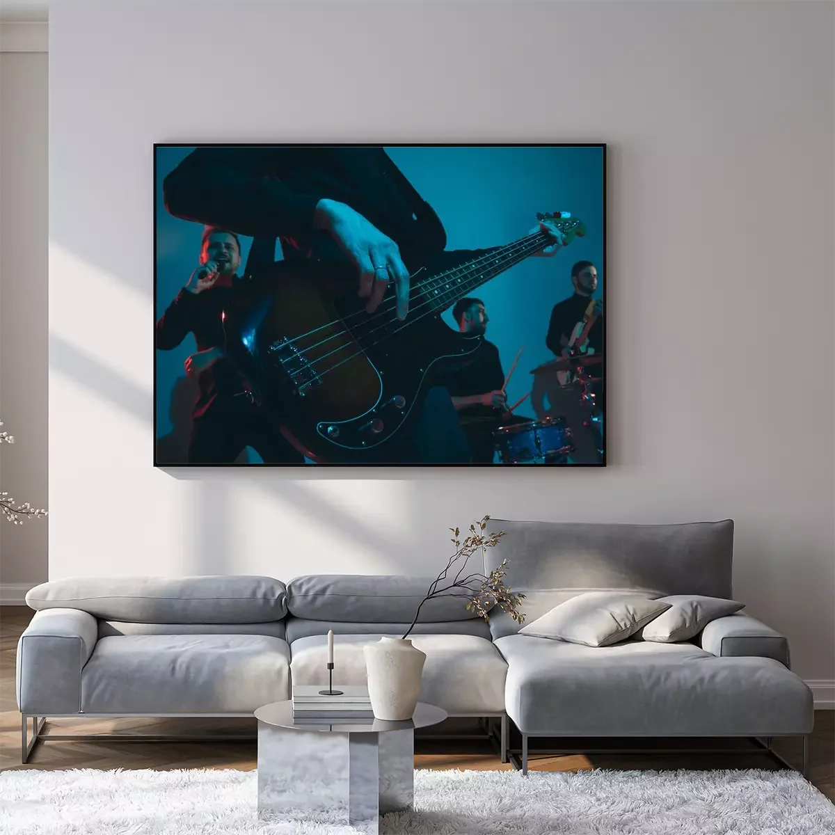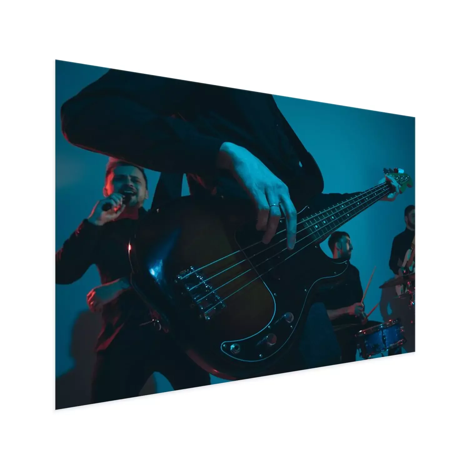 Poster : Young caucasian musicians, band performing on blue studio background in neon light. Concept of music, hobby, festival. Colorful portrait of modern artist. Attented and inspired. Art, cover band.