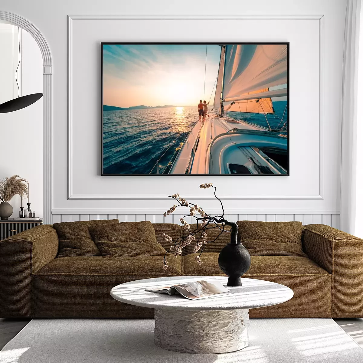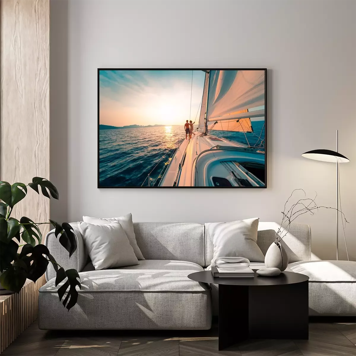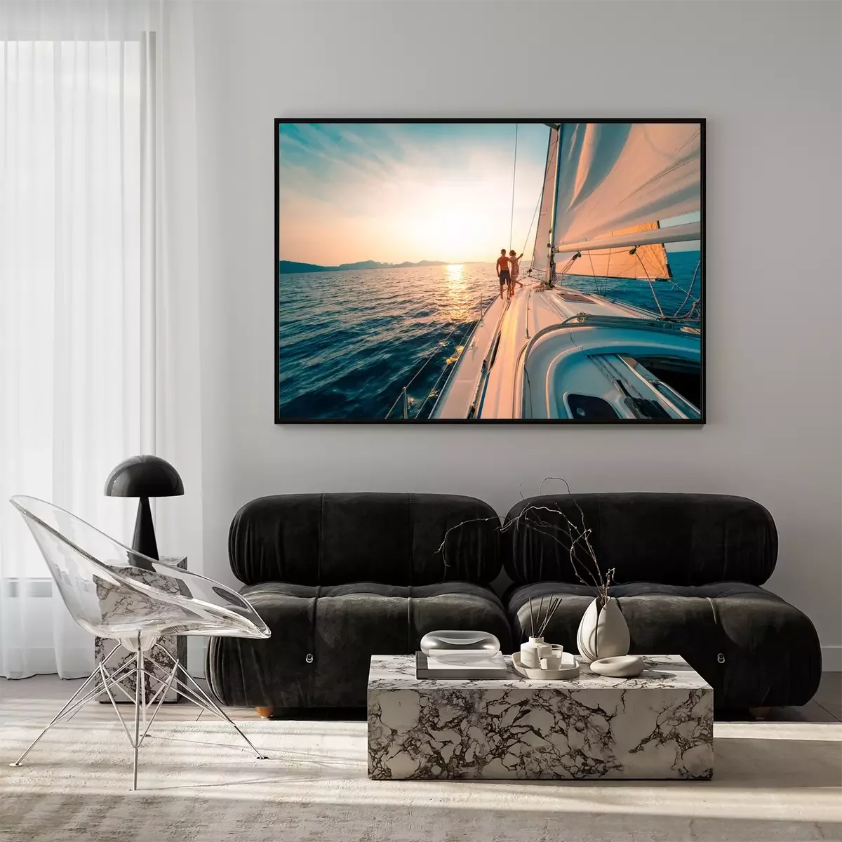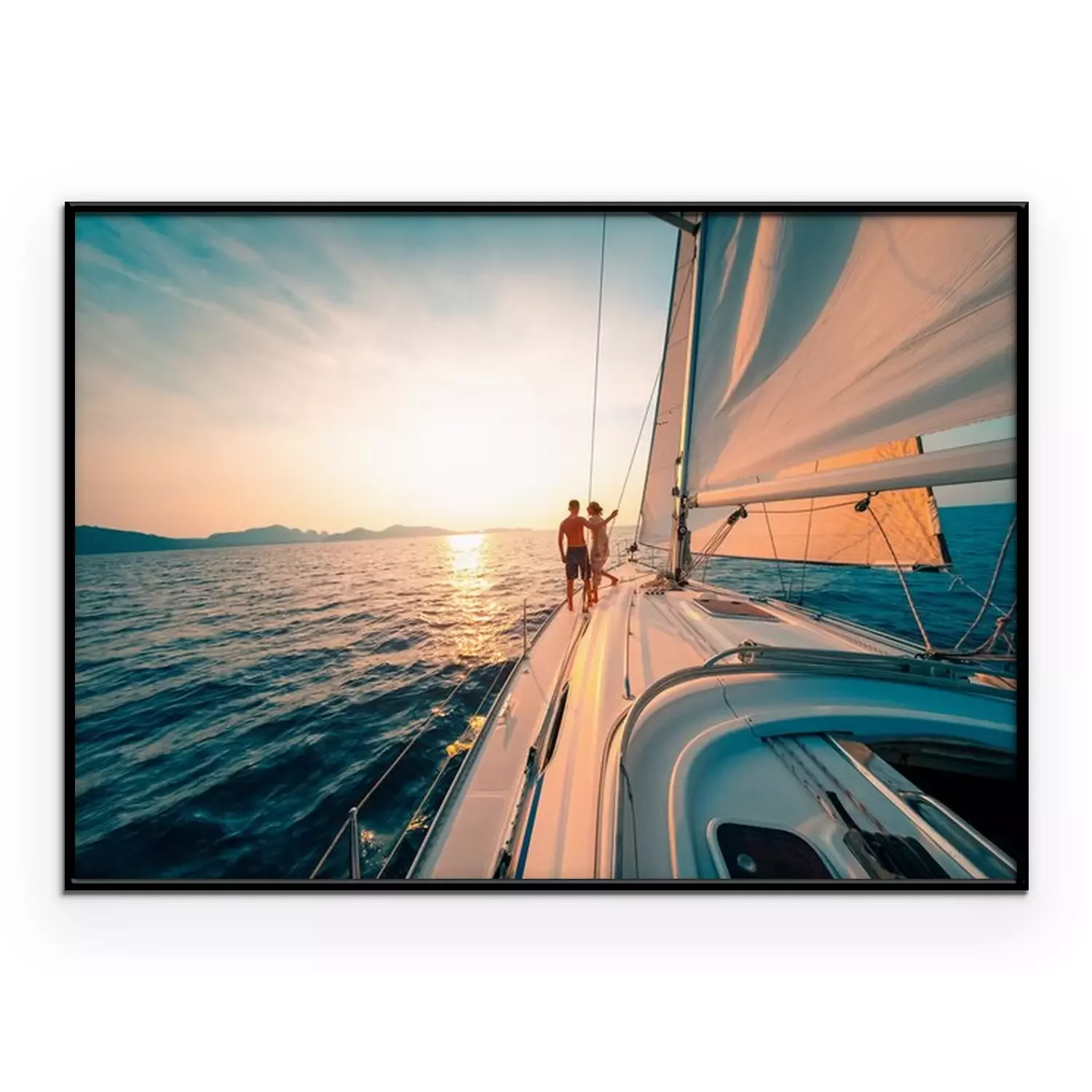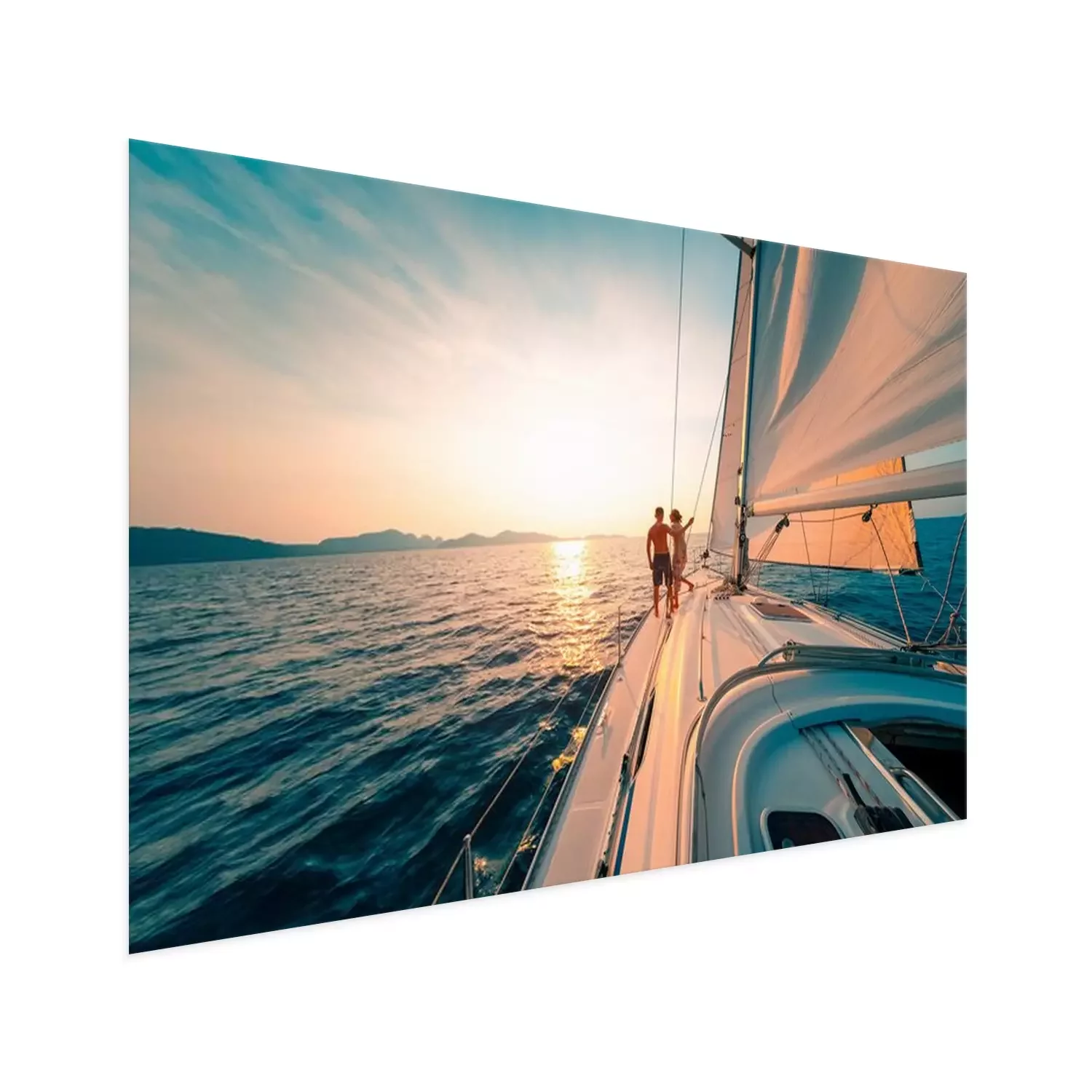 Poster : Young couple enjoys sailing in the tropical sea at sunset on their yacht.