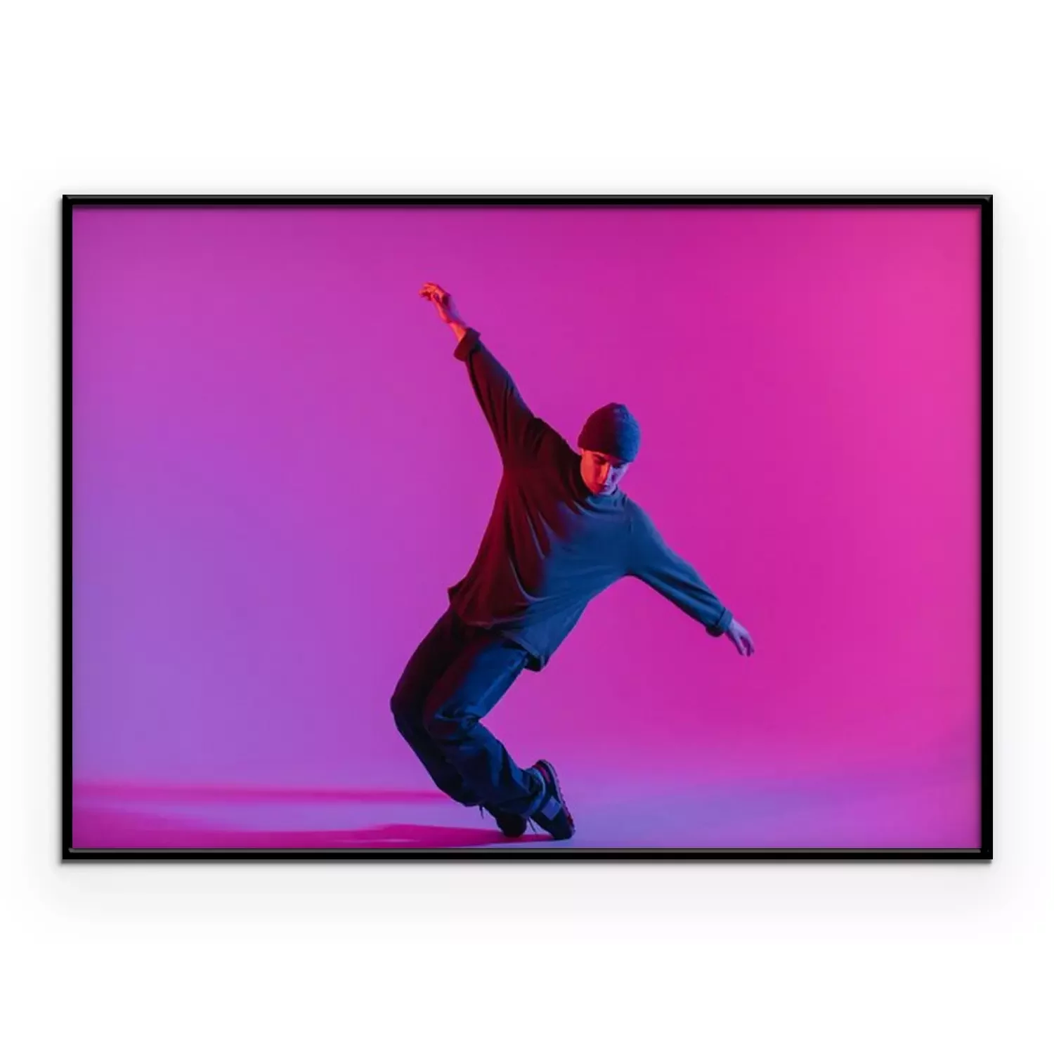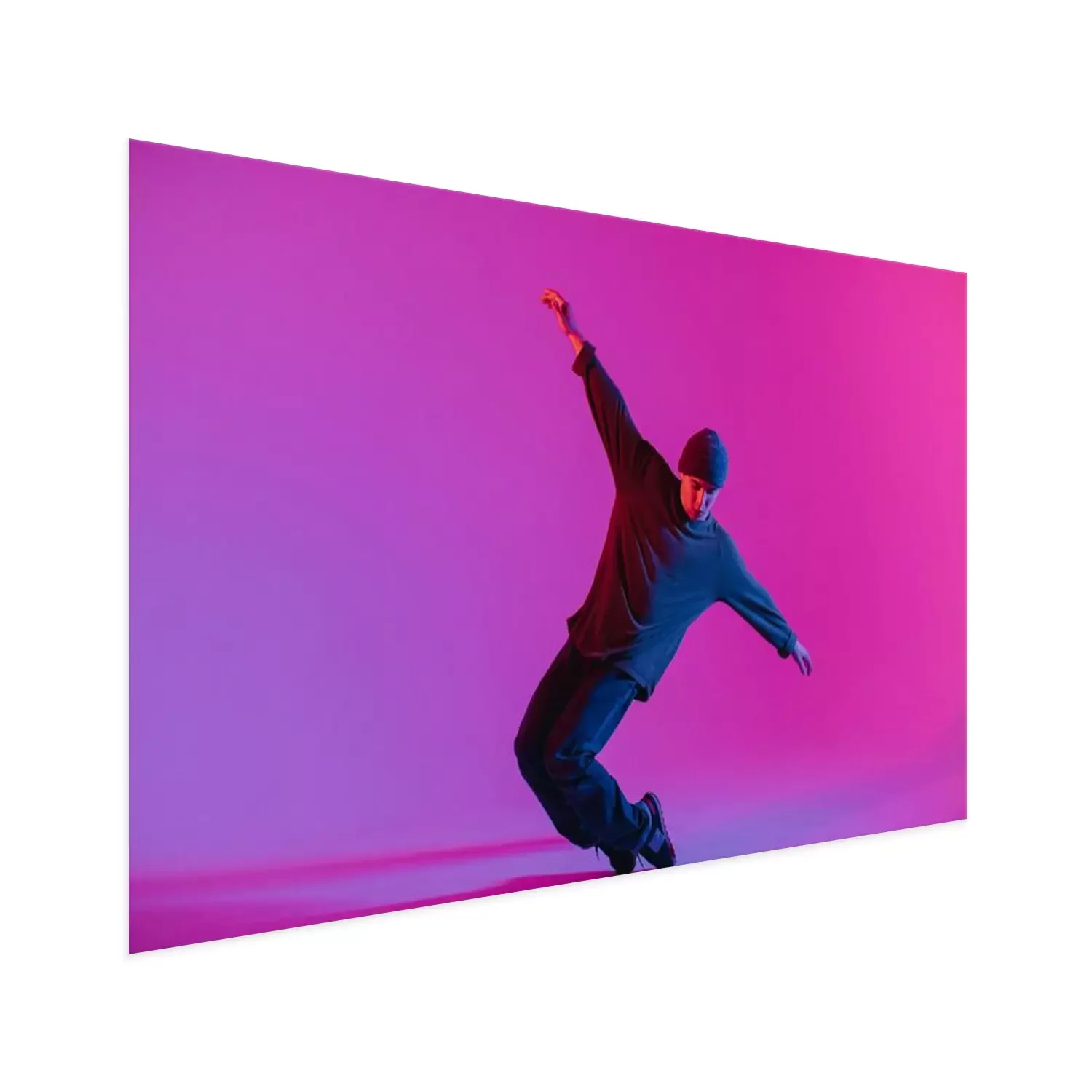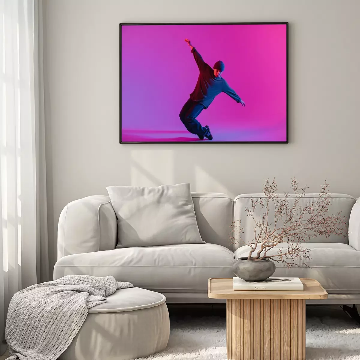 Poster : Young Man in a Jumper Dancing Contemporary Dance in Studio. Breakdancing. Dance School Poster. Copy Space. Battle competition announcement. Pink and Blue Background.