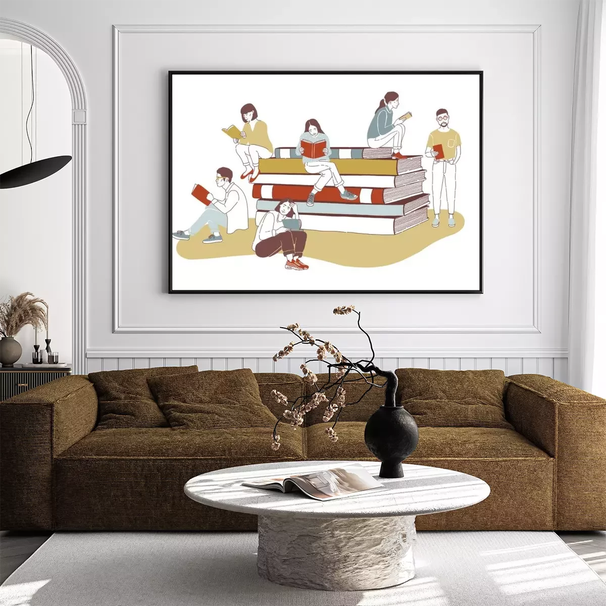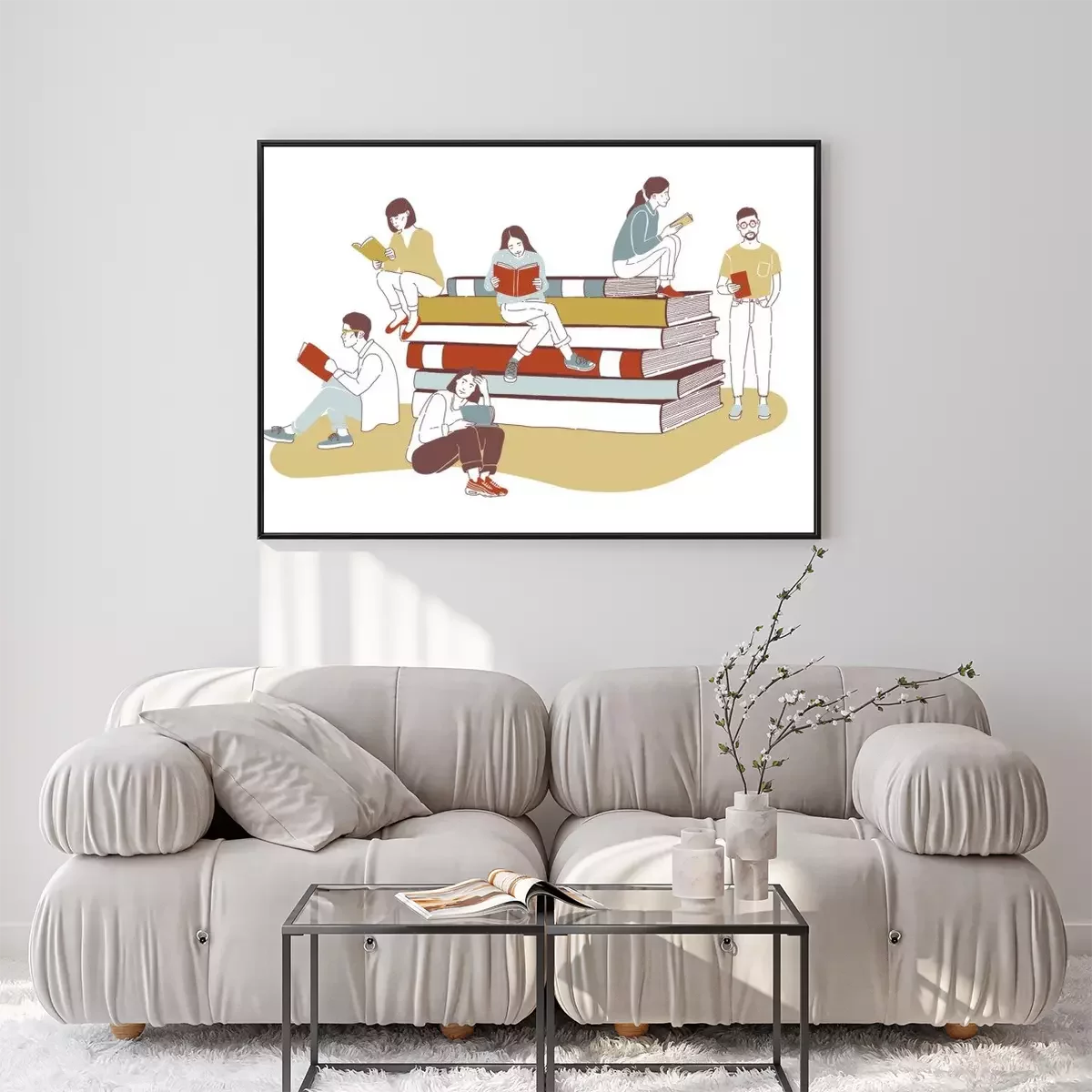 Poster : Young stylish male and female readers dressed in trendy apparel sitting on stack of giant books or beside it and reading. Literature fans or lovers. Colored vector illustration in contemporary style.