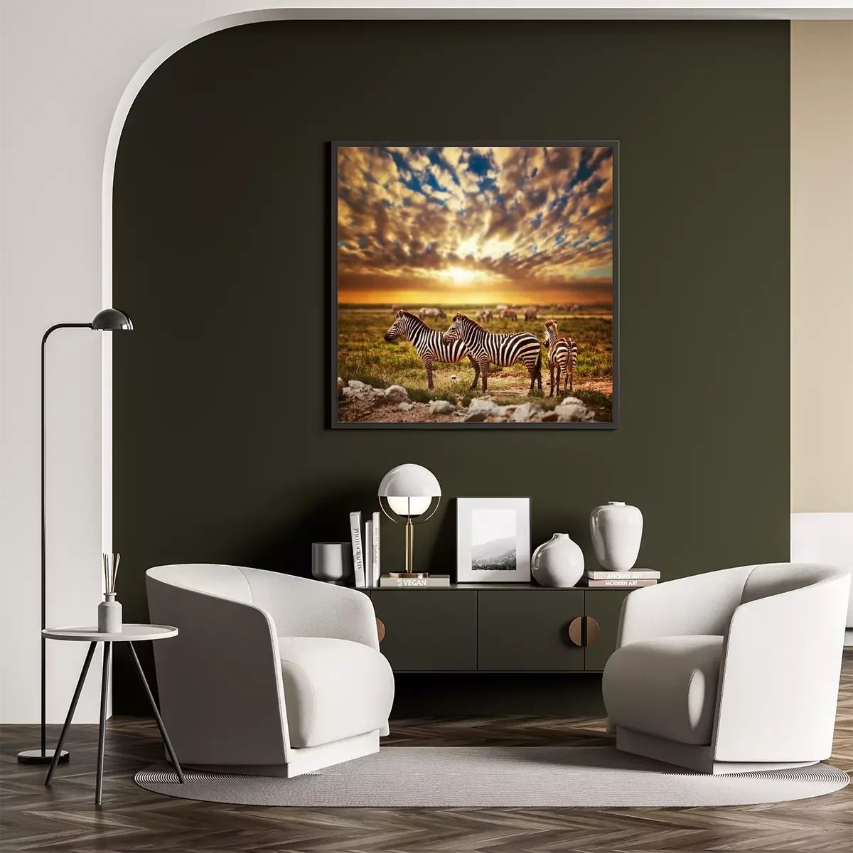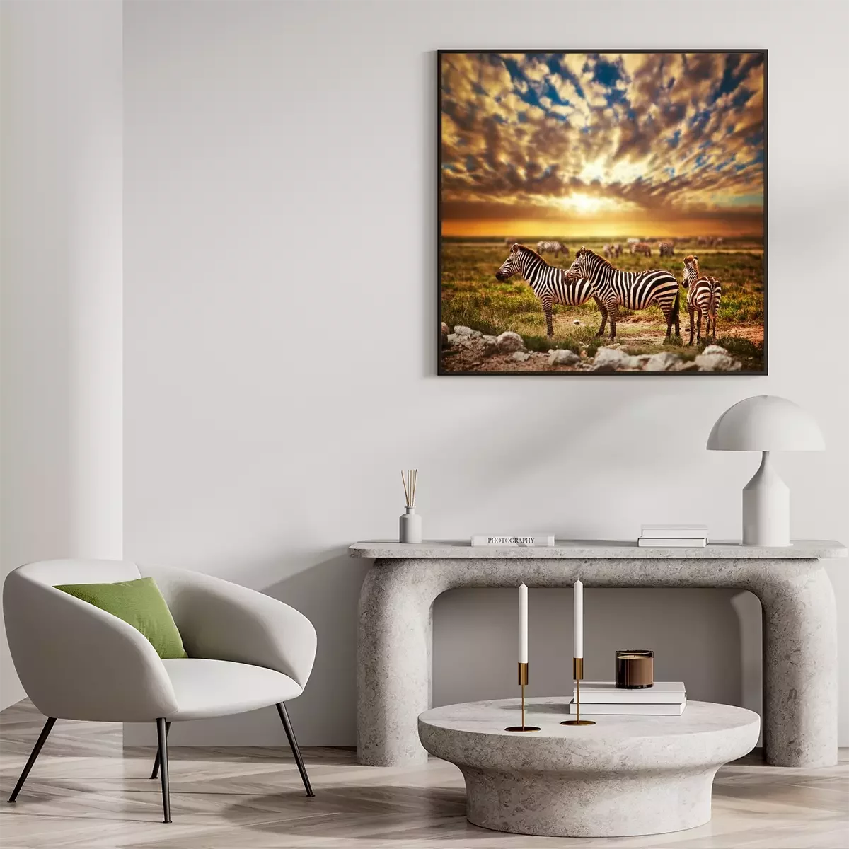 Poster  Zèbres du Serengeti sur fond de soleil couchant