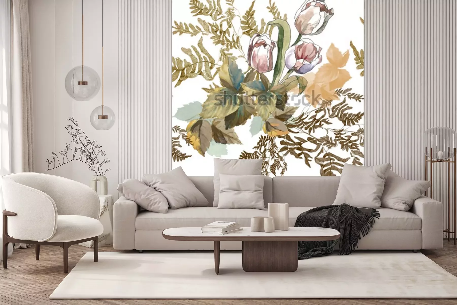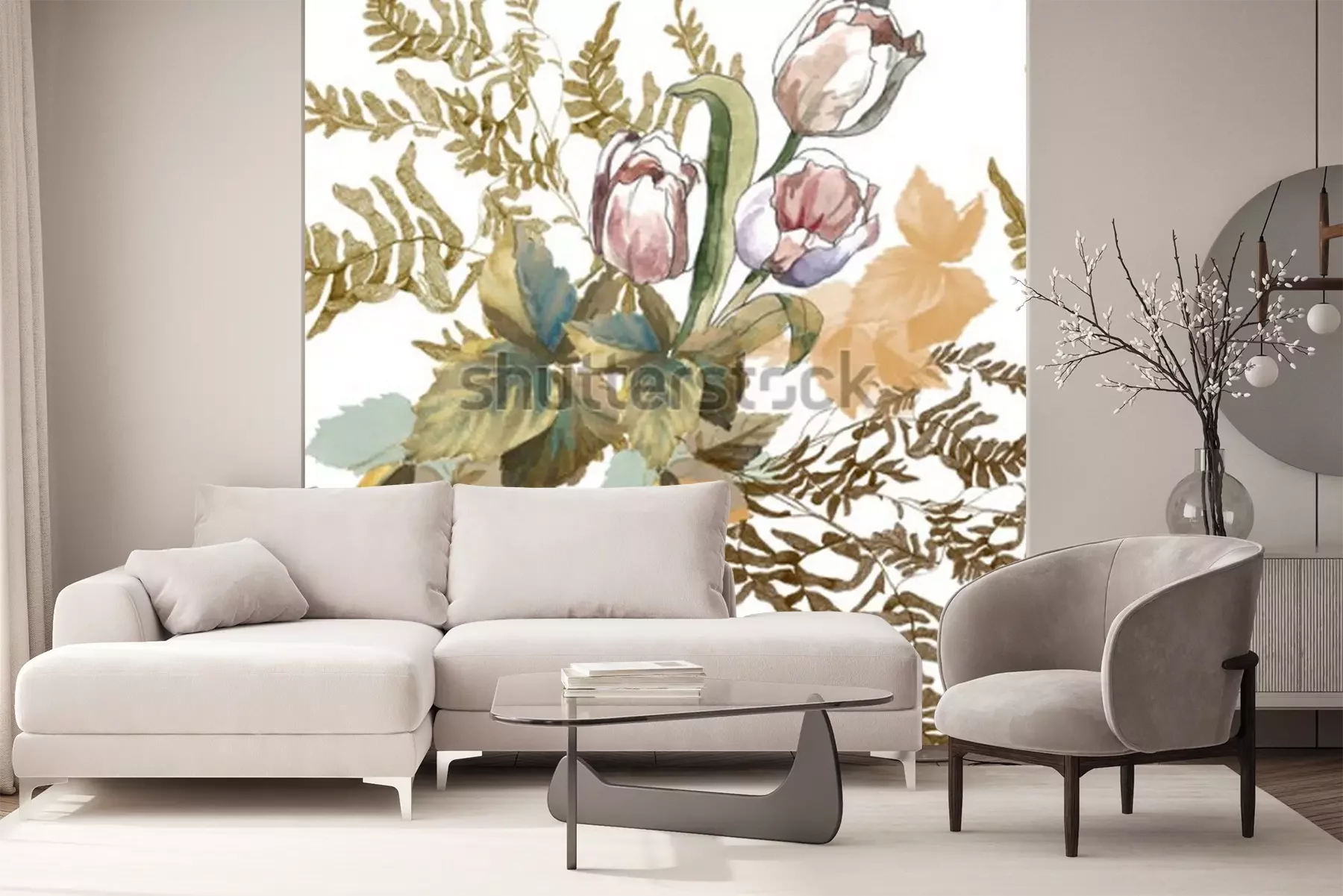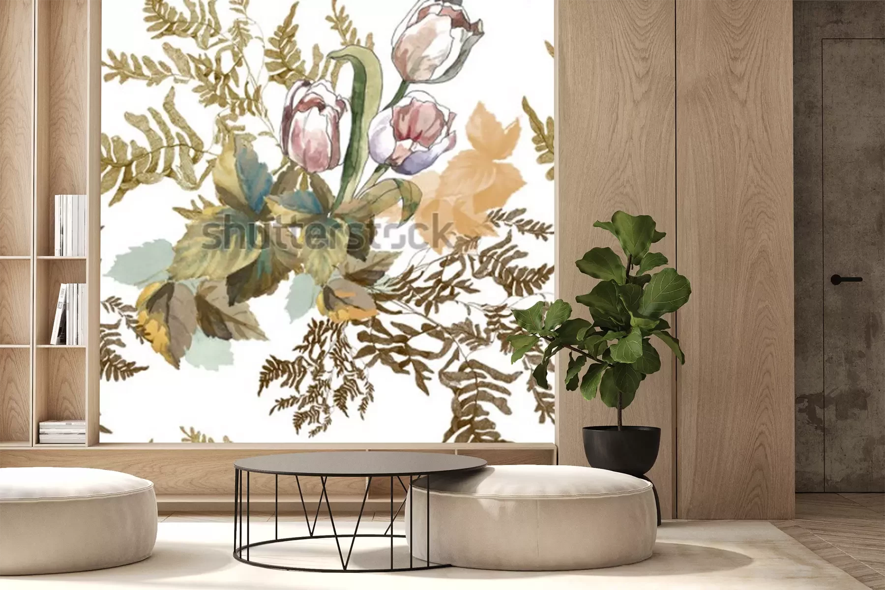 Sticker  3 tulipes blanches et aquarelle d'herbe sur le modèle sans soudure de fond blanc pour tissus, papier