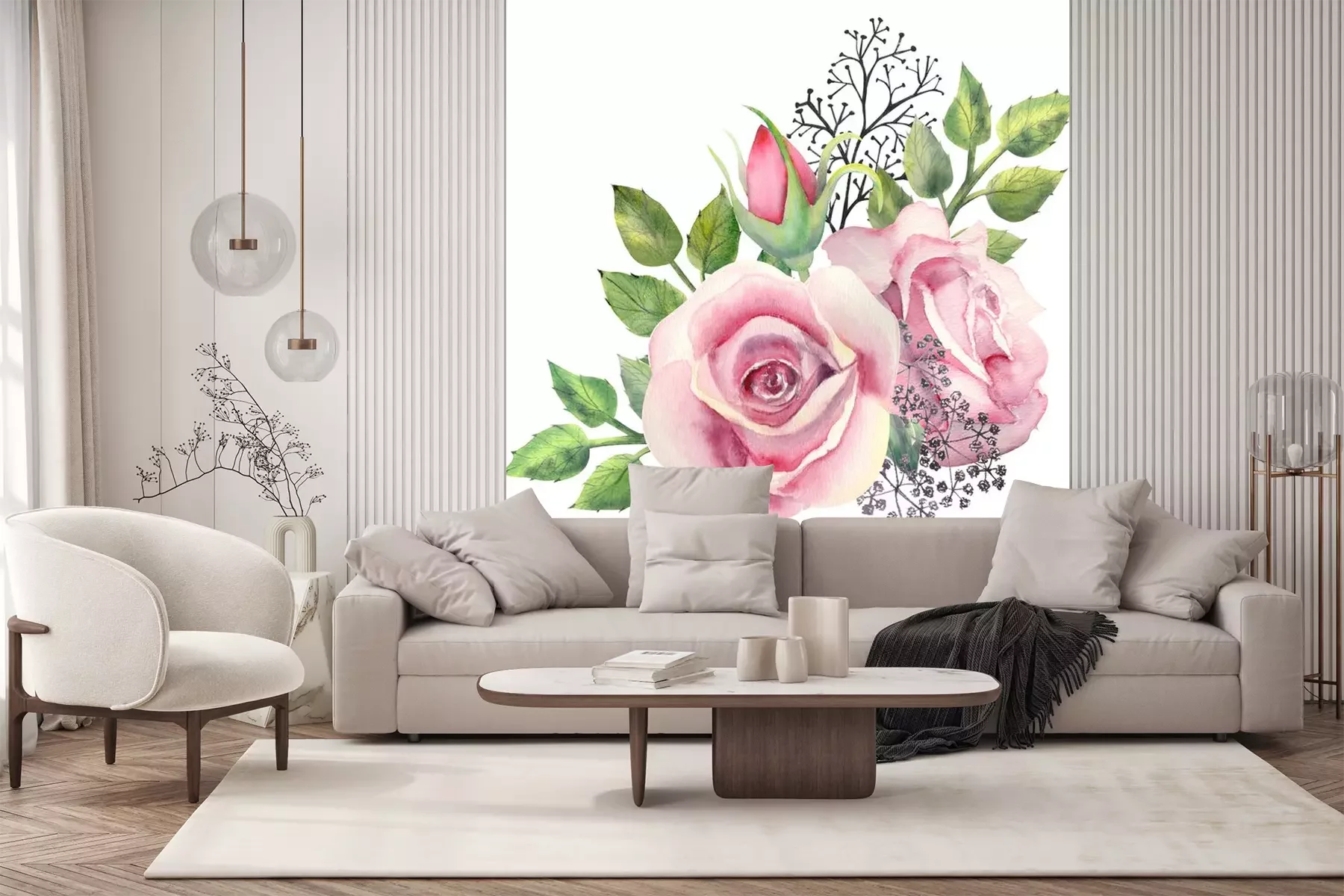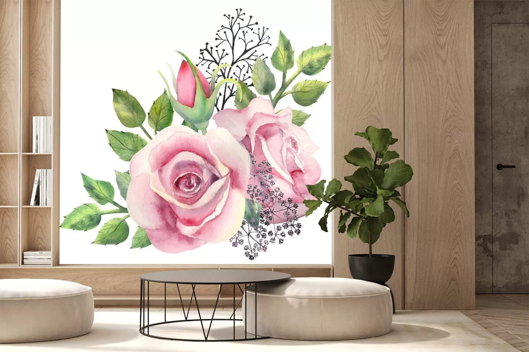 Sticker  A bouquet of pink rose flowers, green leaves, red berries, decorative twigs on a white isolated background. Flower poster, invitation. Watercolor composition for decorating greeting cards or