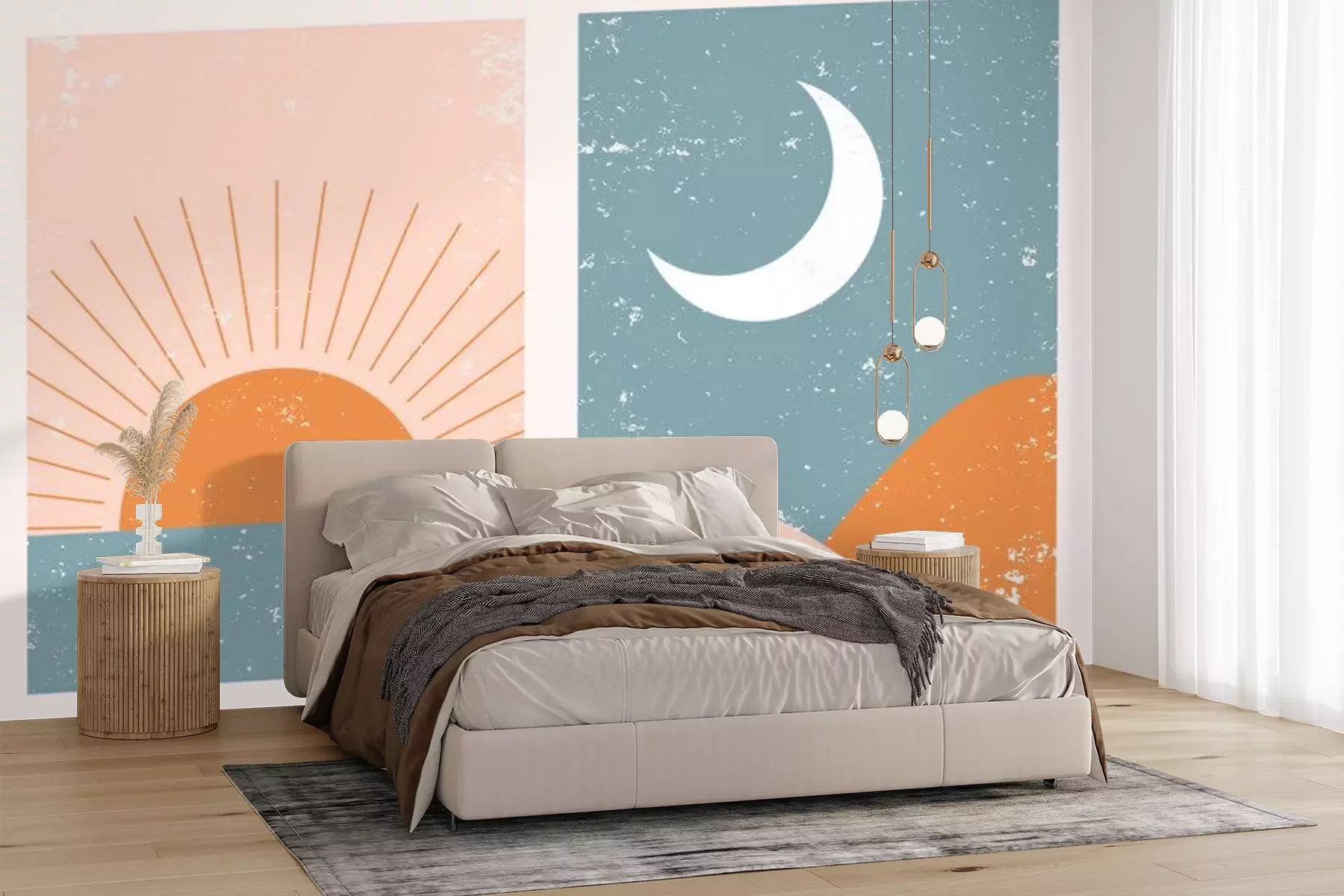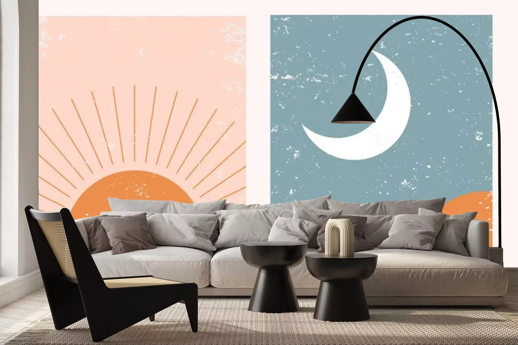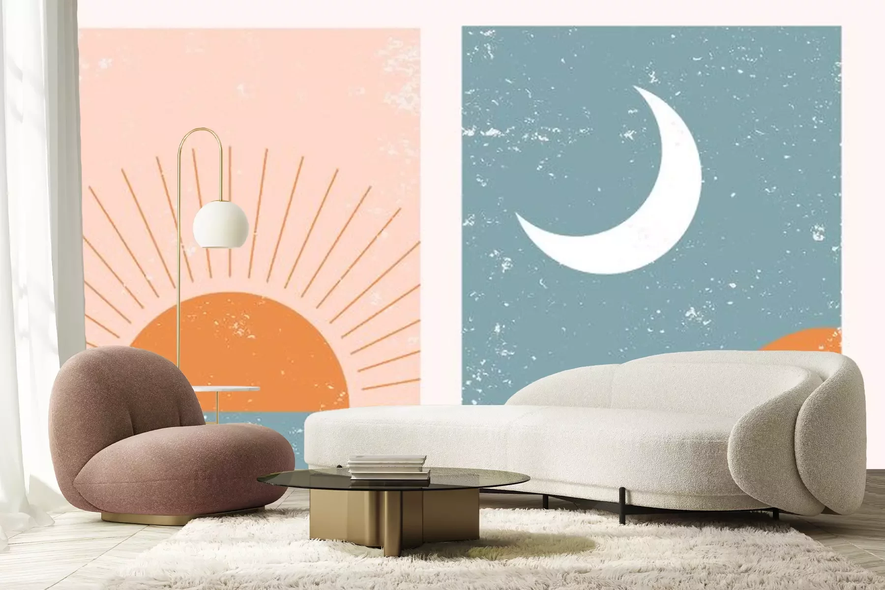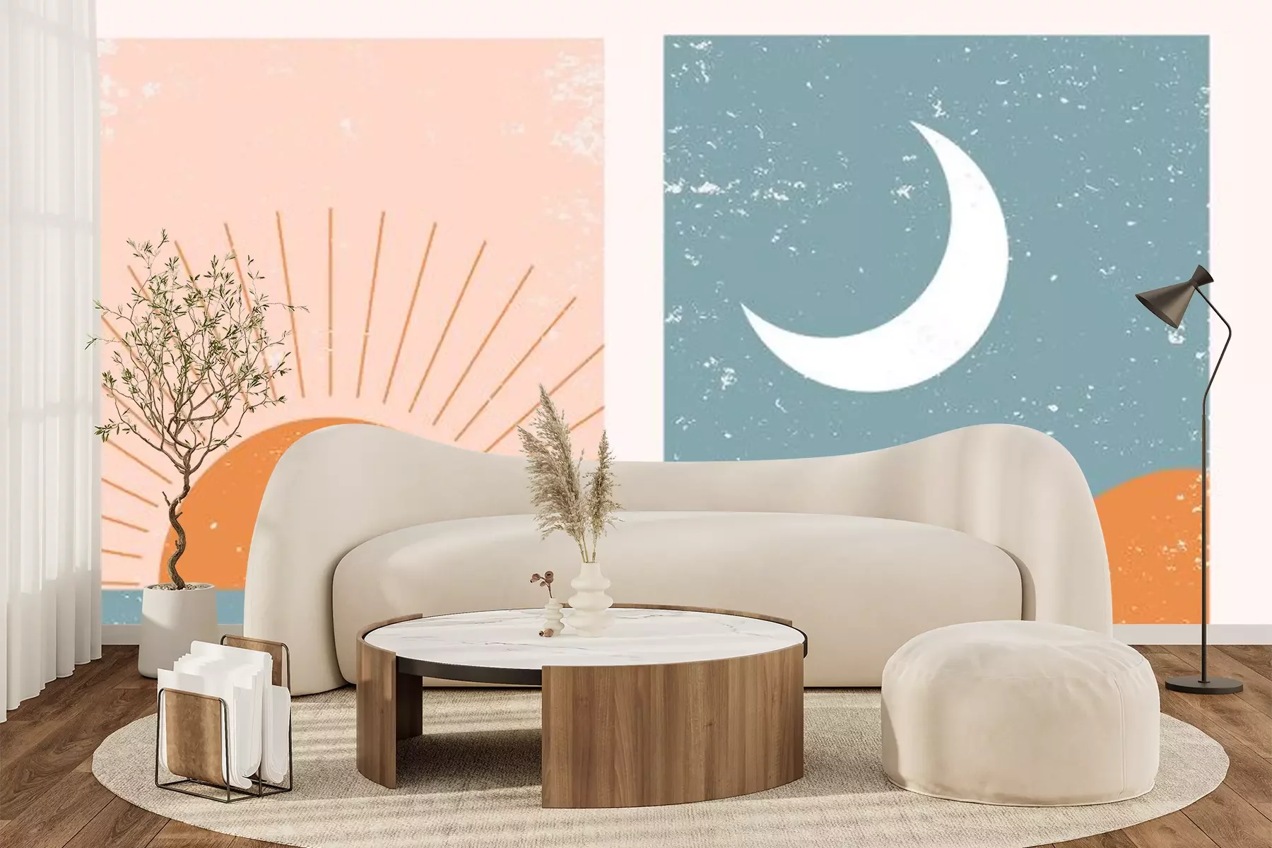 Sticker  Abstract contemporary aesthetic background landscape set with Sun, Moon, sea, mountains. Earth tones, pastel colors. Boho wall decor. Mid century modern minimalist art print. Flat abstract design.