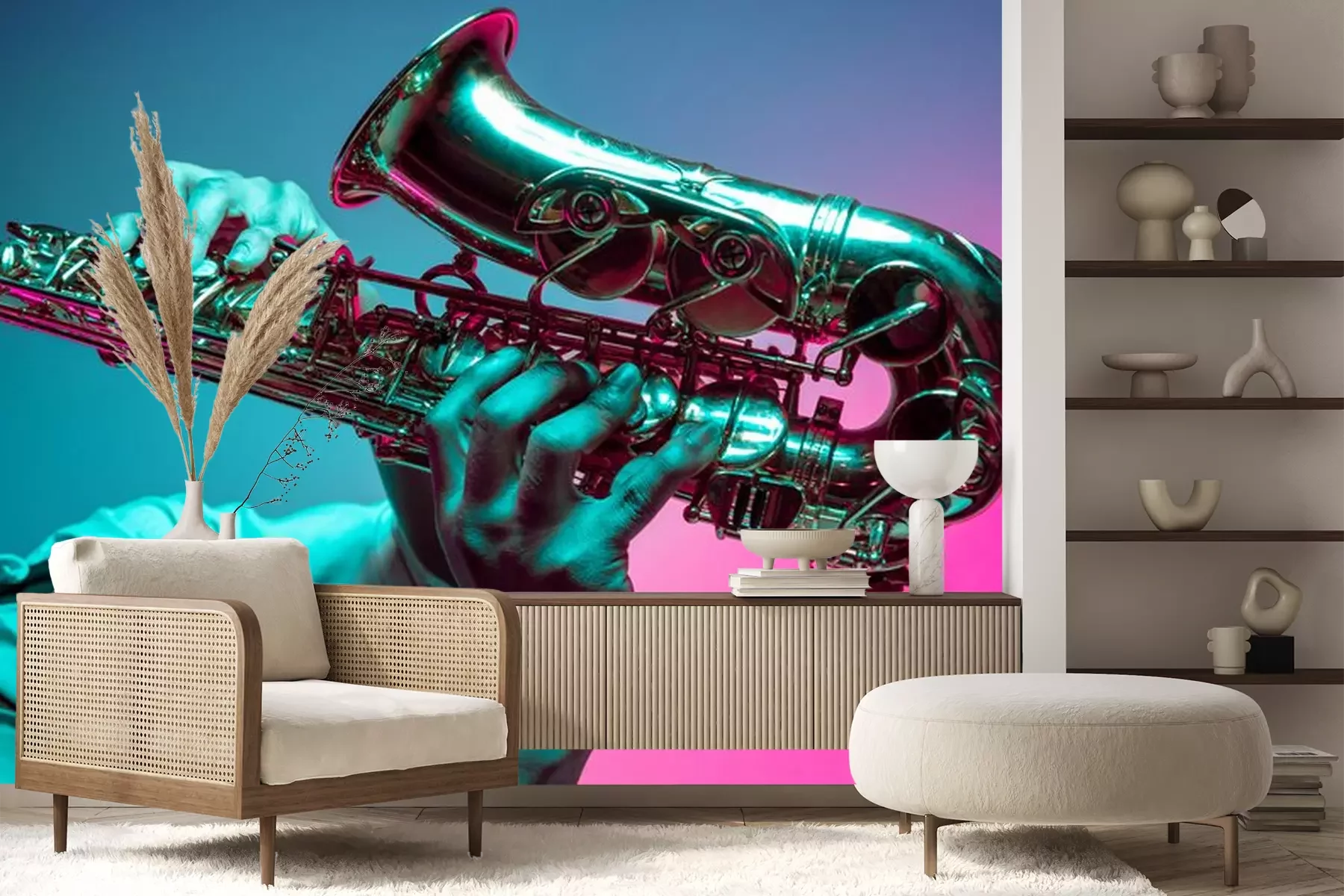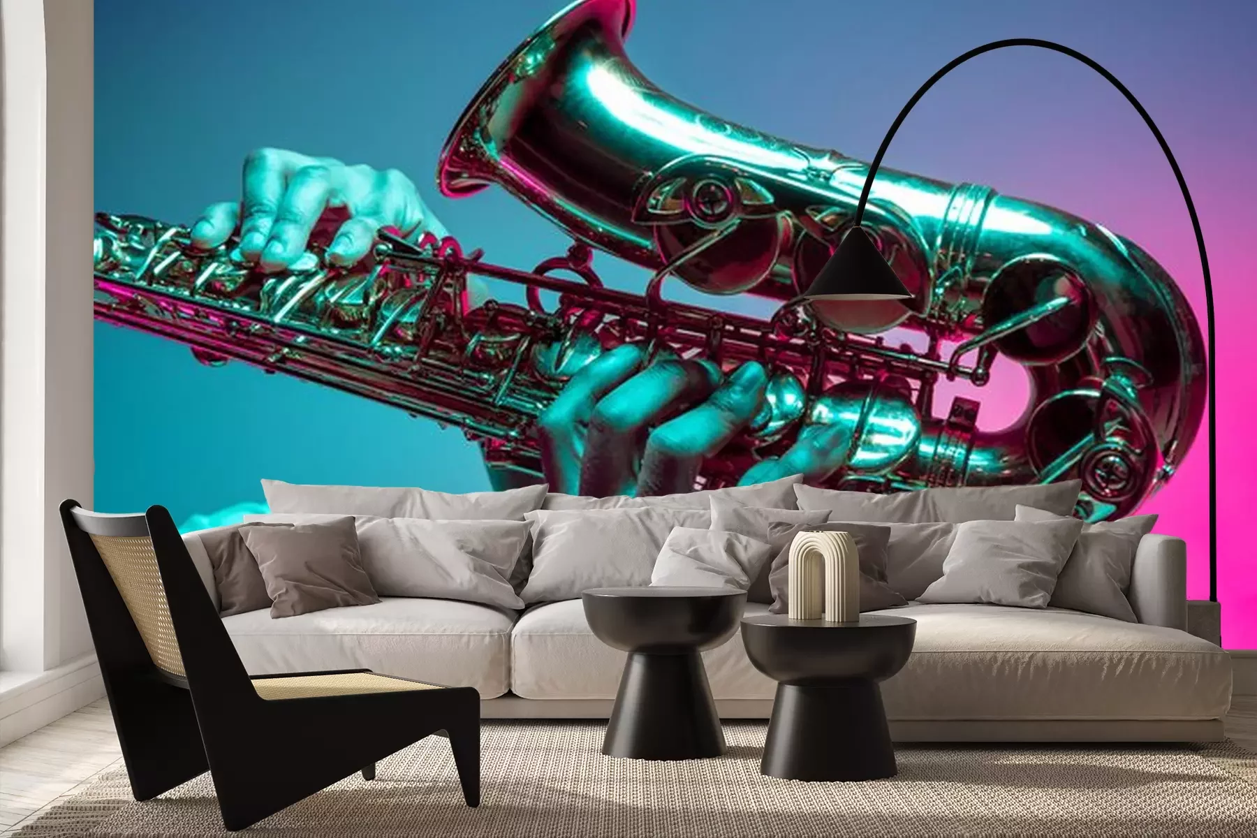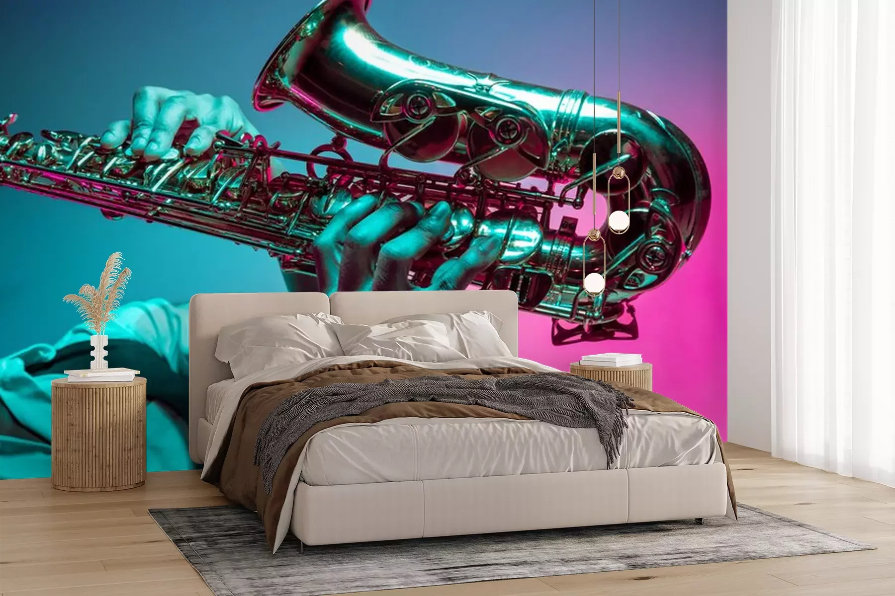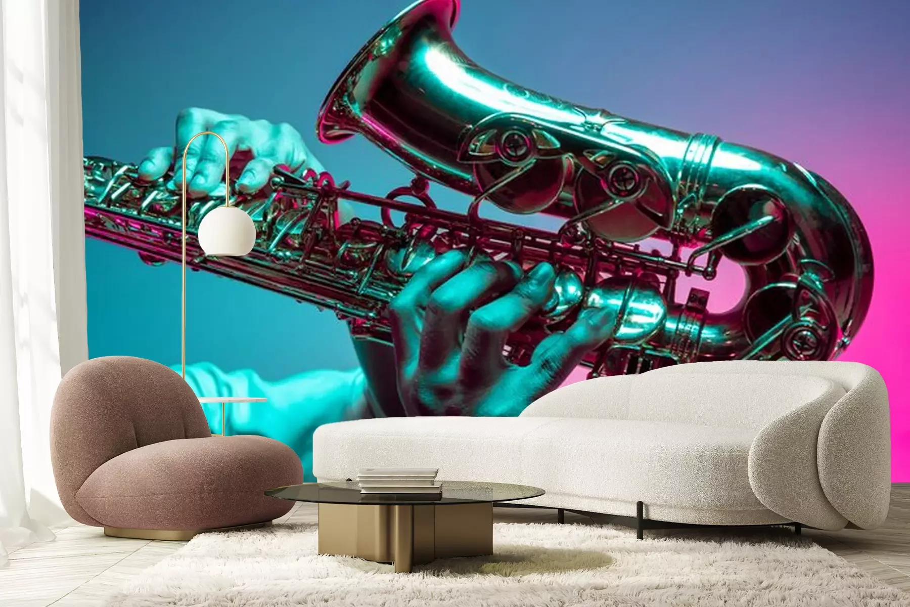 Sticker  African American handsome jazz musician playing the saxophone in the studio on a neon background. Music concept. Young joyful attractive guy improvising. Close-up retro portrait.