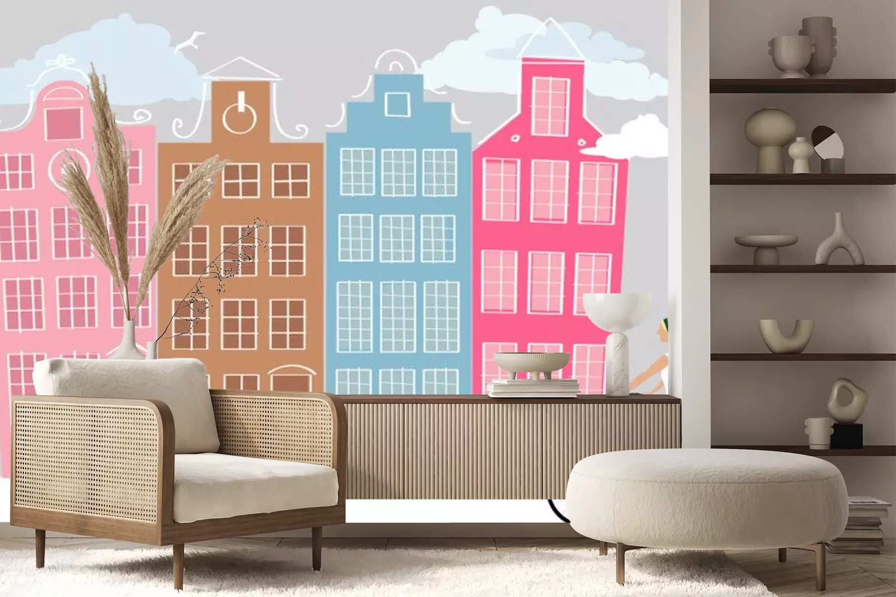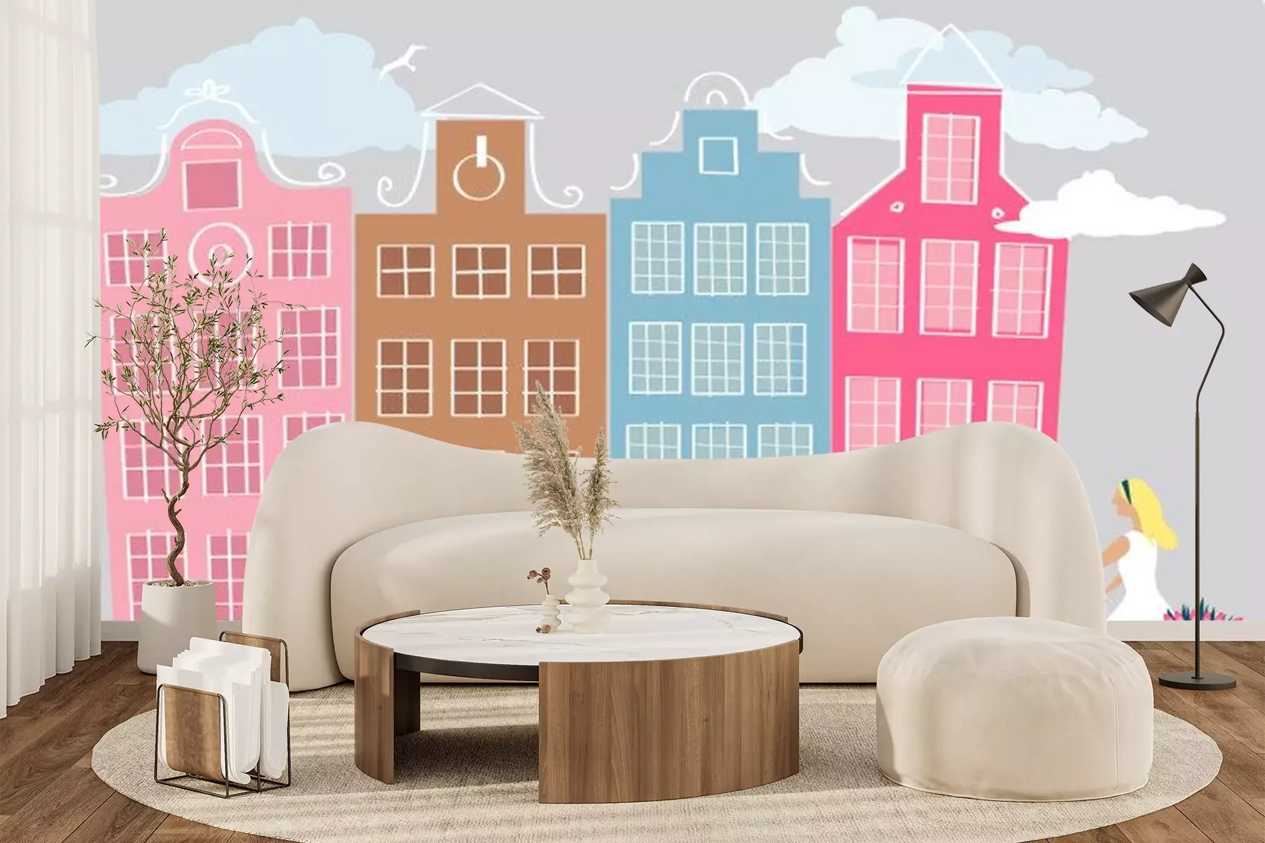 Sticker  Amsterdam street with a young woman riding bicycle, EPS 8 vector illustration