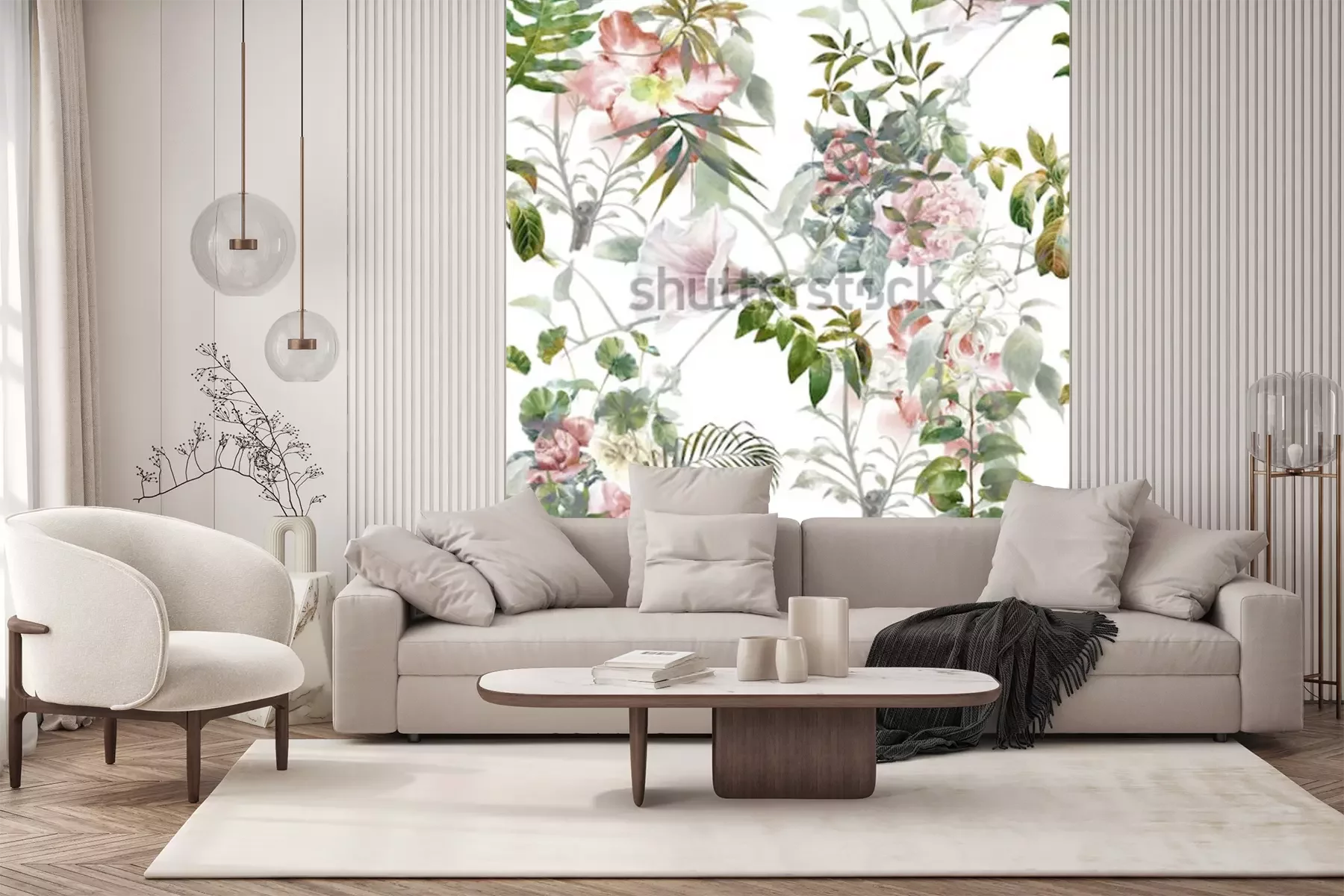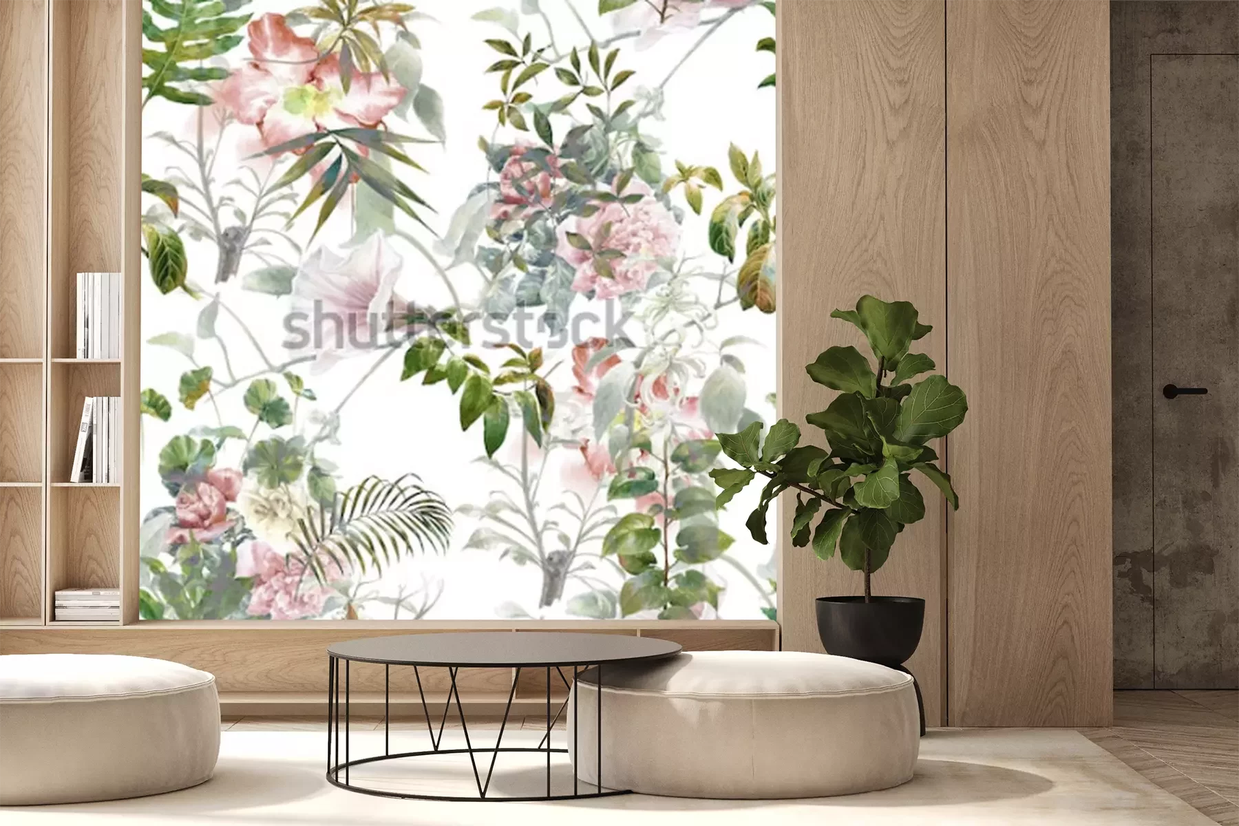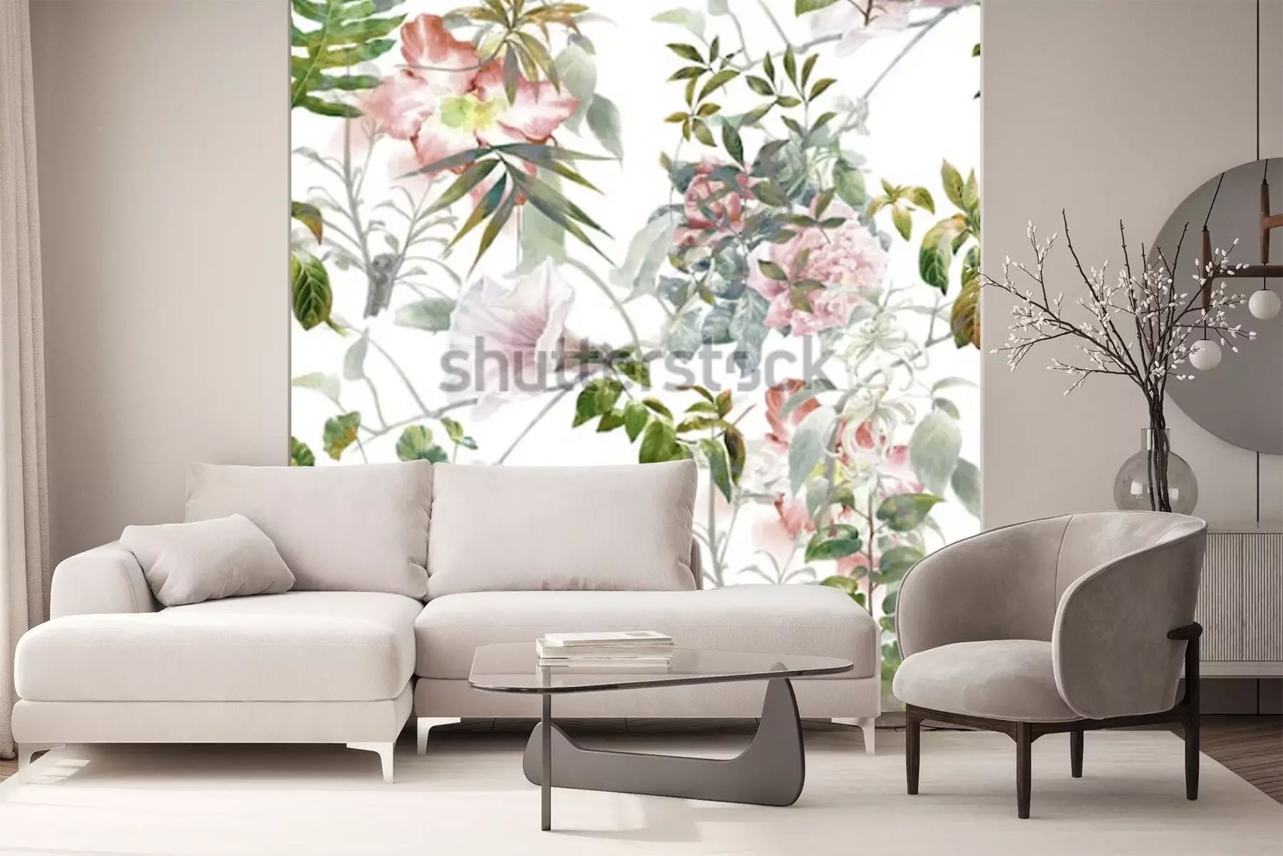 Sticker  Aquarelle de feuilles et de fleurs, modèle sans couture sur fond blanc