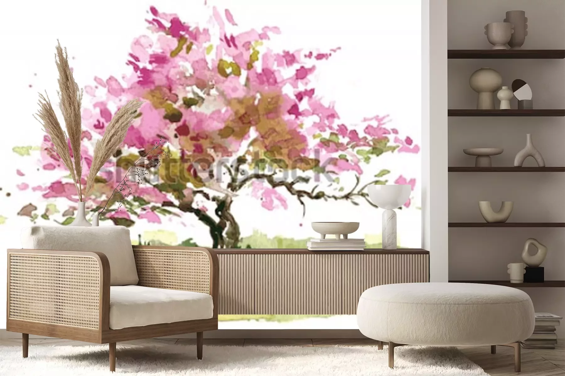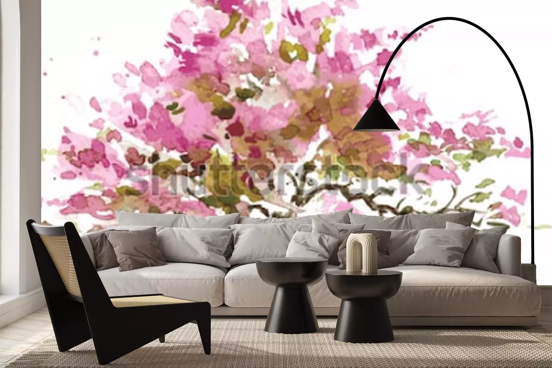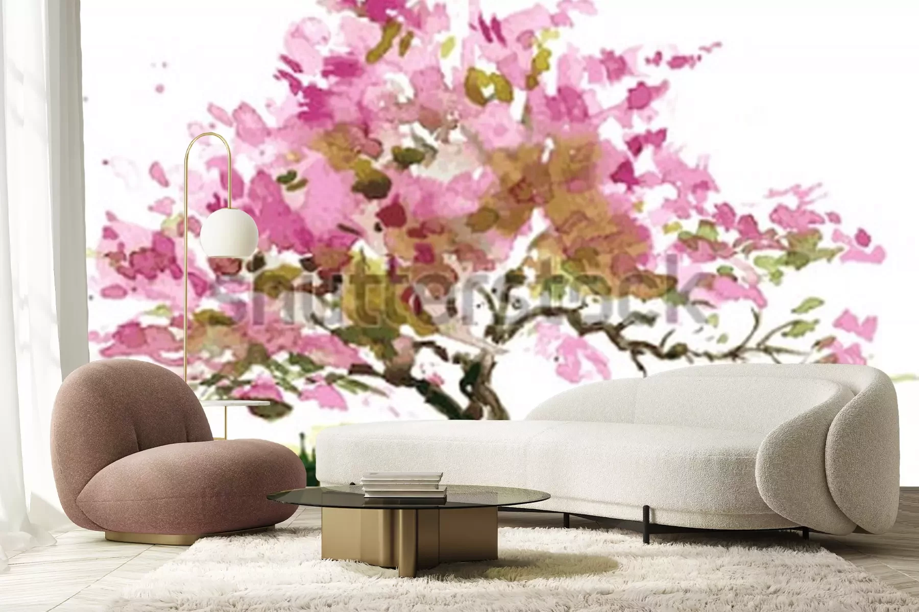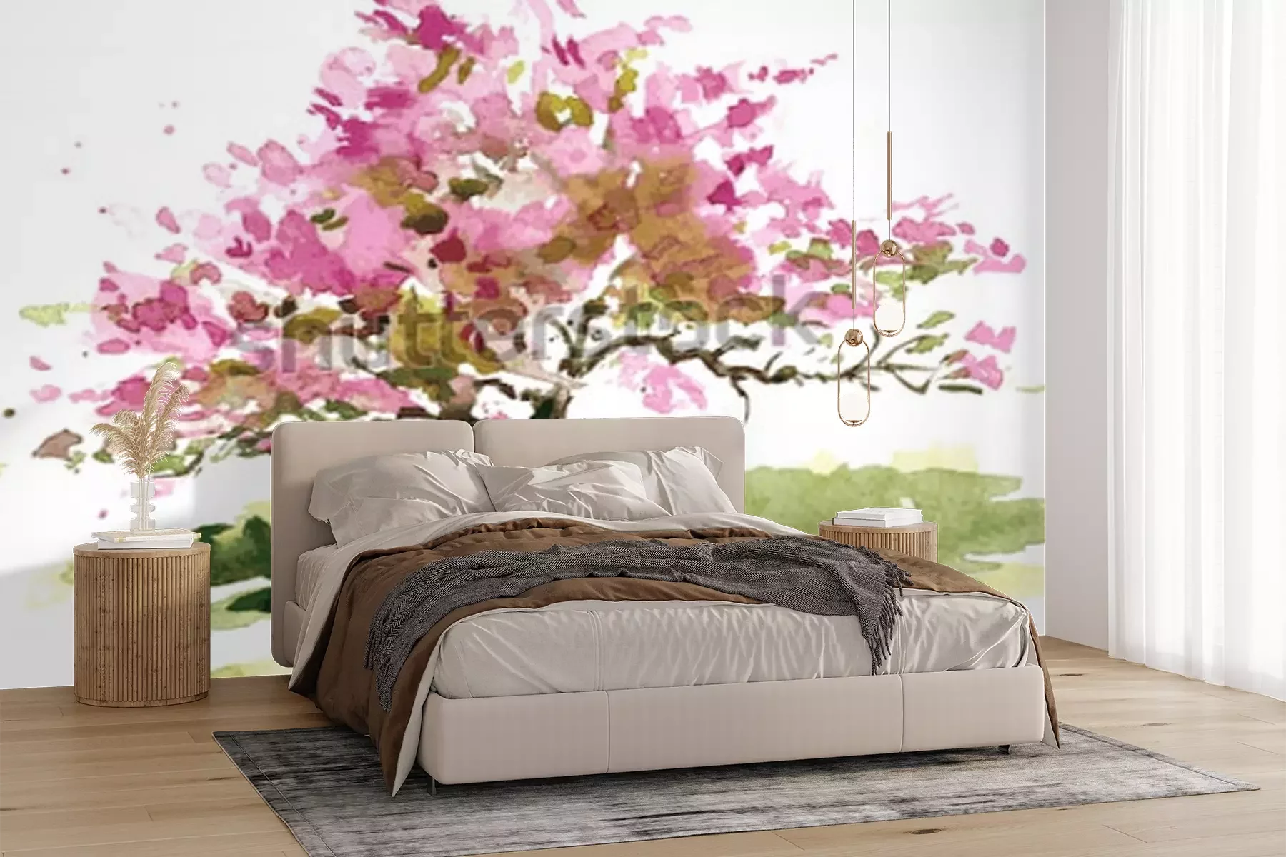 Sticker  arbre à fleur de cerisier dessin à l'aquarelle, aquarelle esquisse de fleurs de pommier en fleurs, peinture jardin, fond d'art vectoriel dessiné à la main
