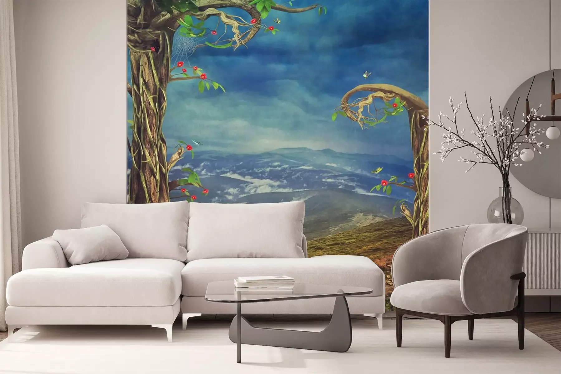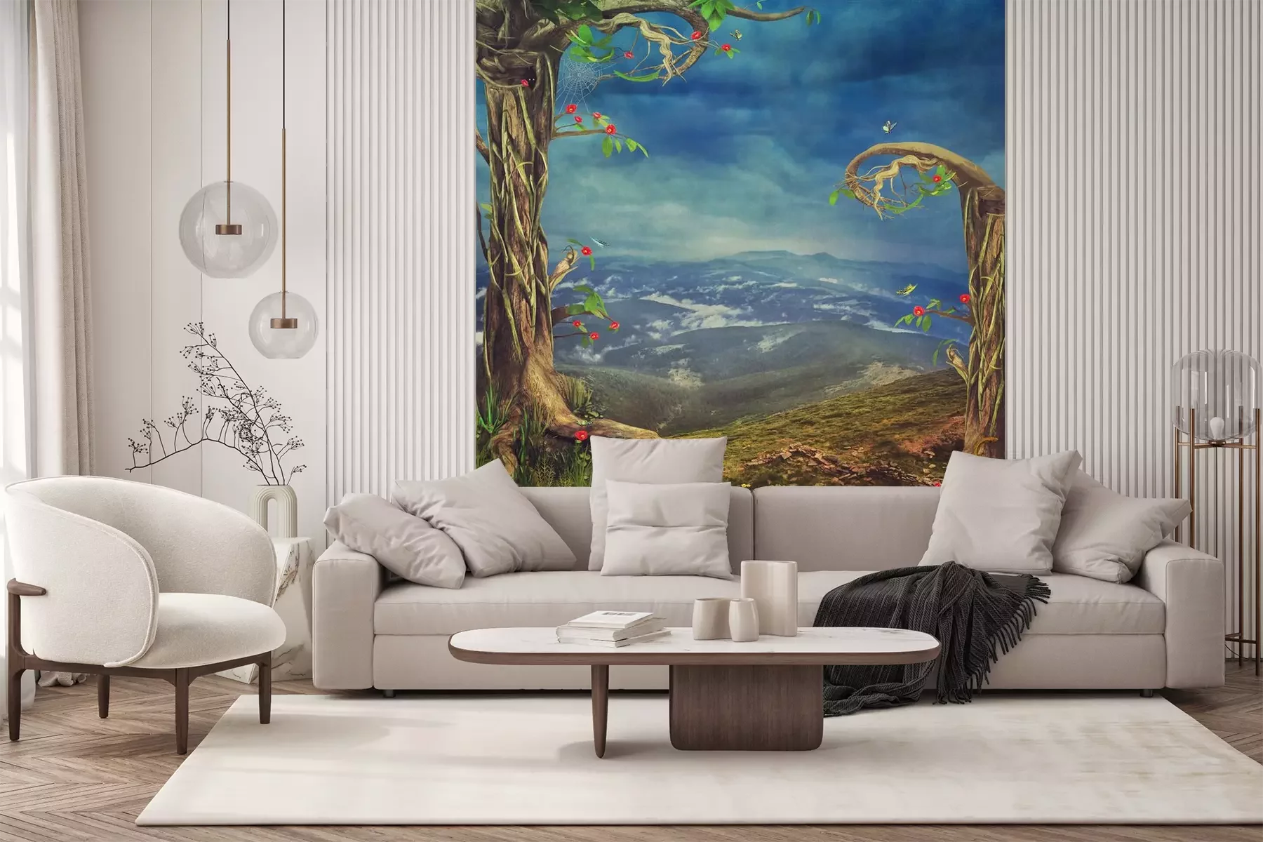 Sticker  Beau, boisé, scène, Arbres, herbe, montagnes