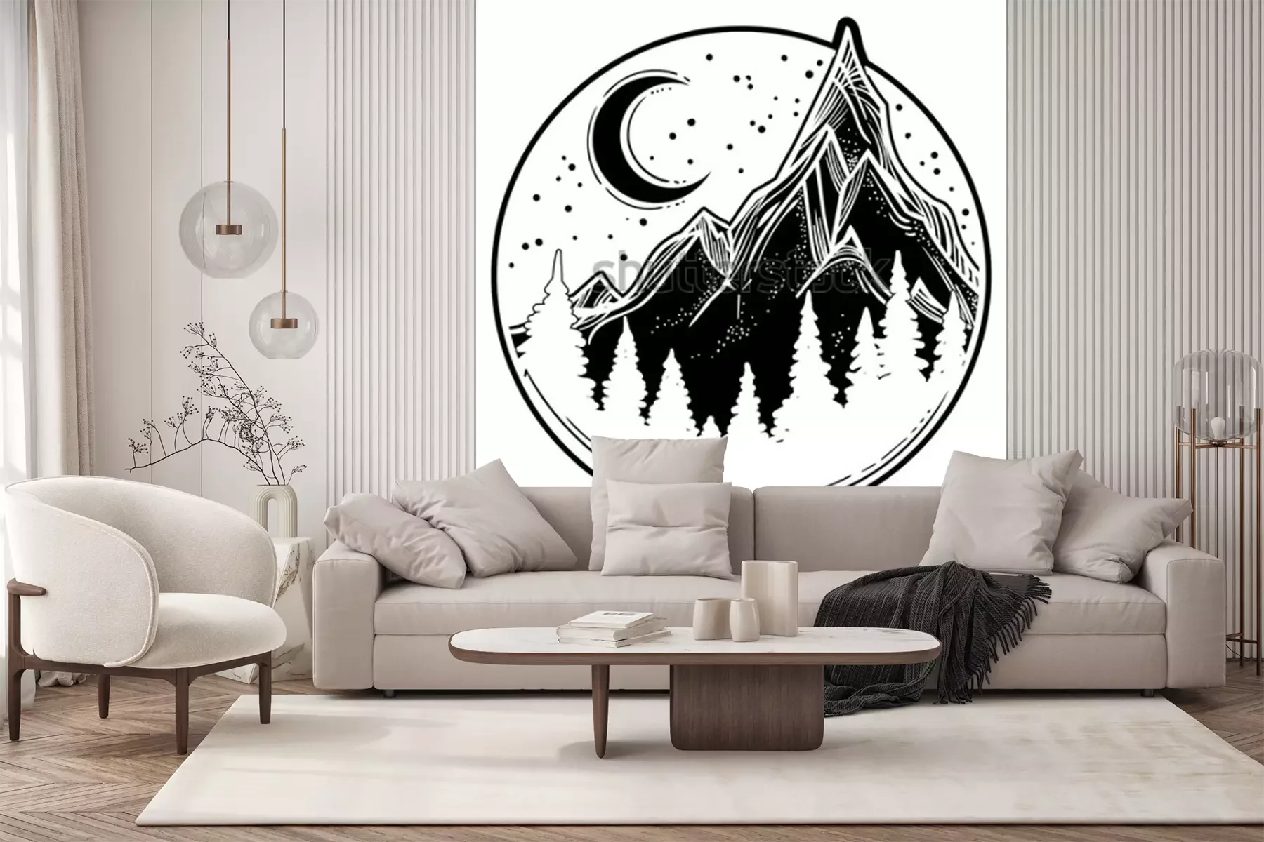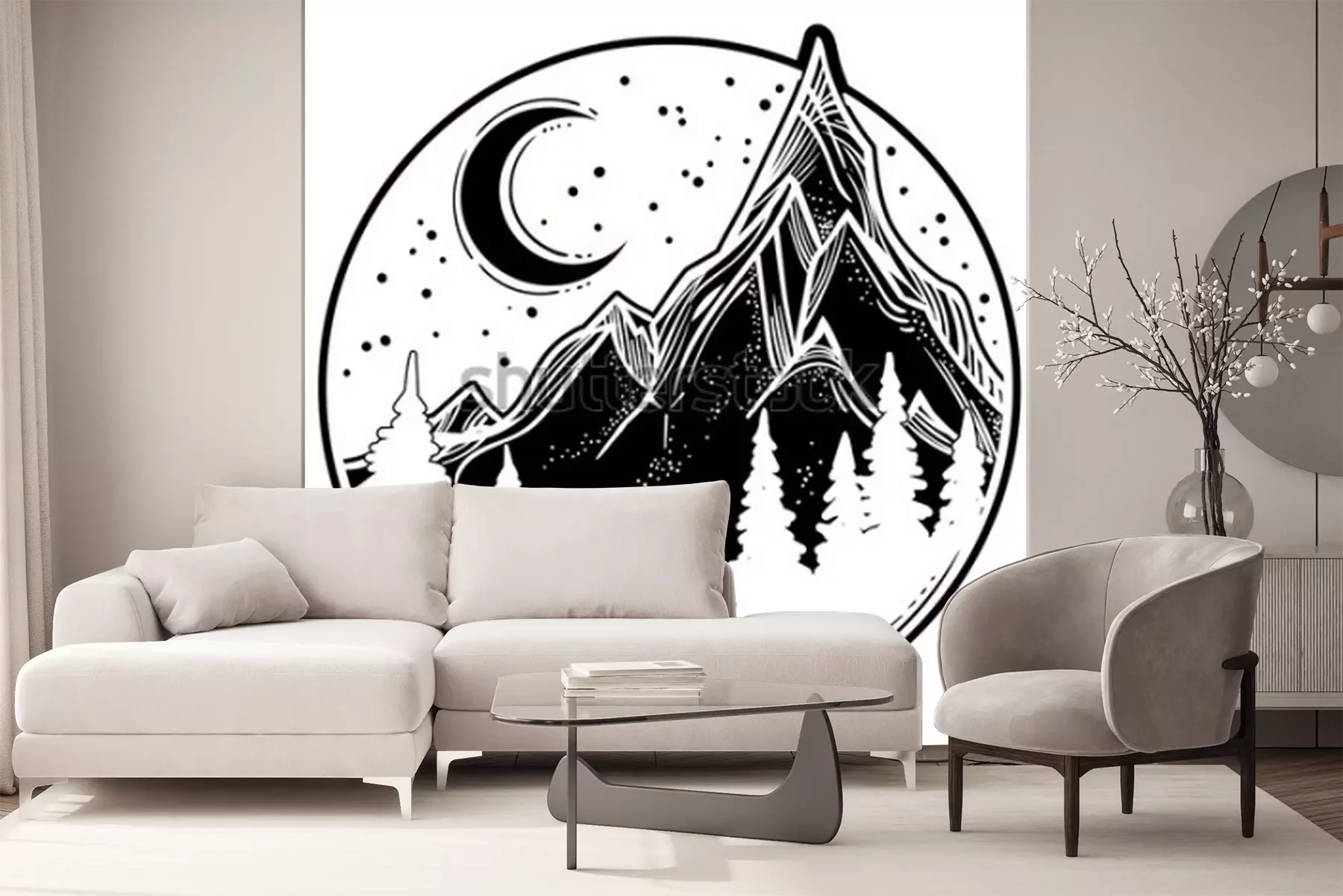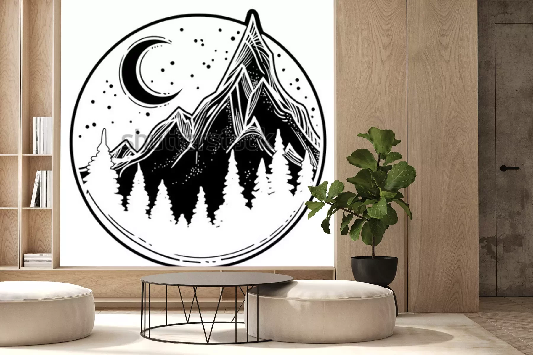 Sticker  Belle illustration vectorielle avec nature paysage - montagnes, forêt de pins, étoiles, lune. Art de tatouage. Espace infini, symboles de méditation, voyages, tourisme.