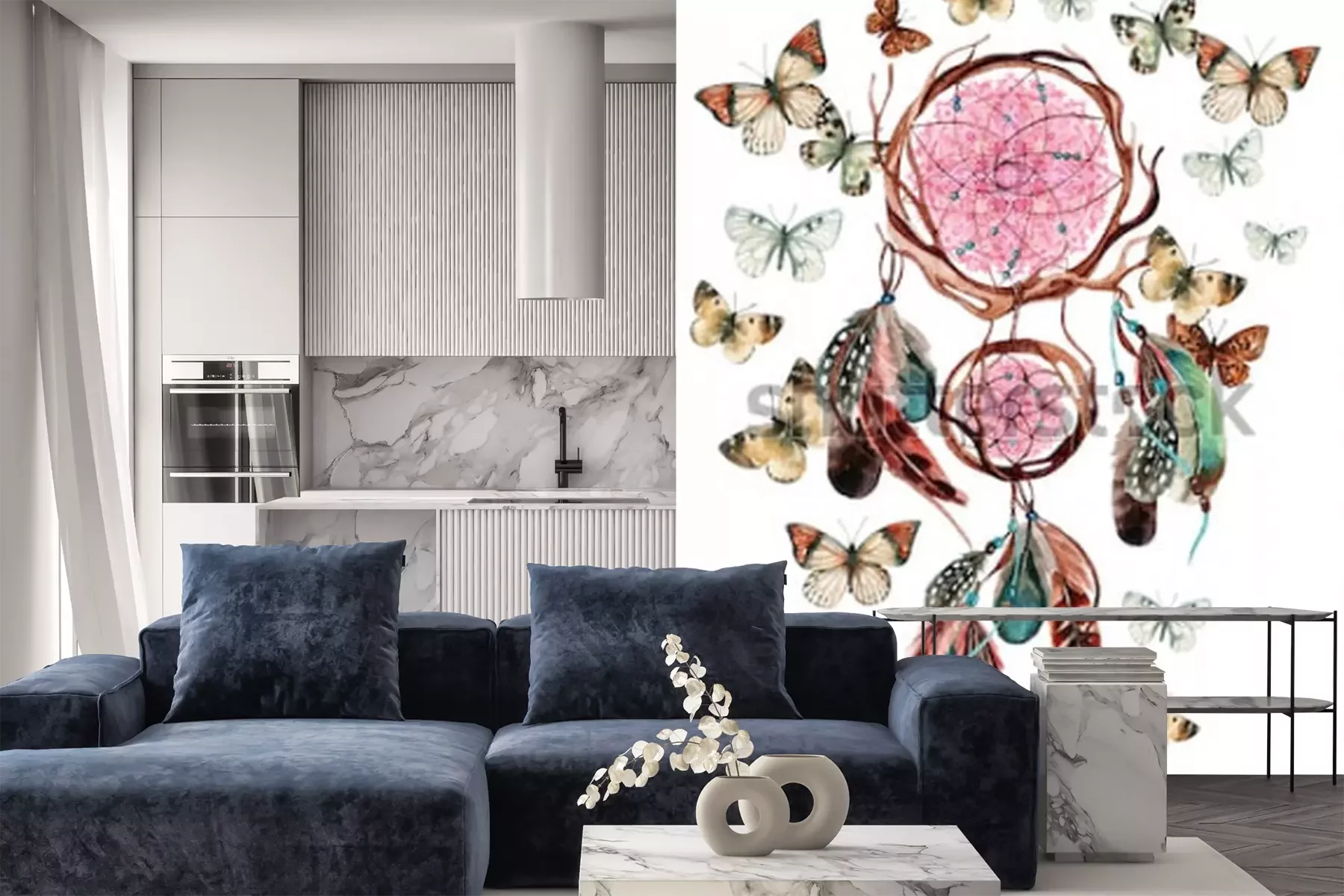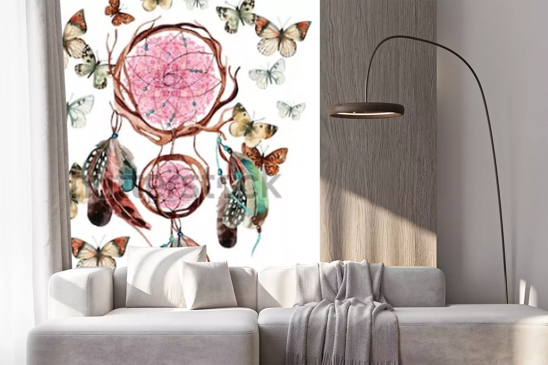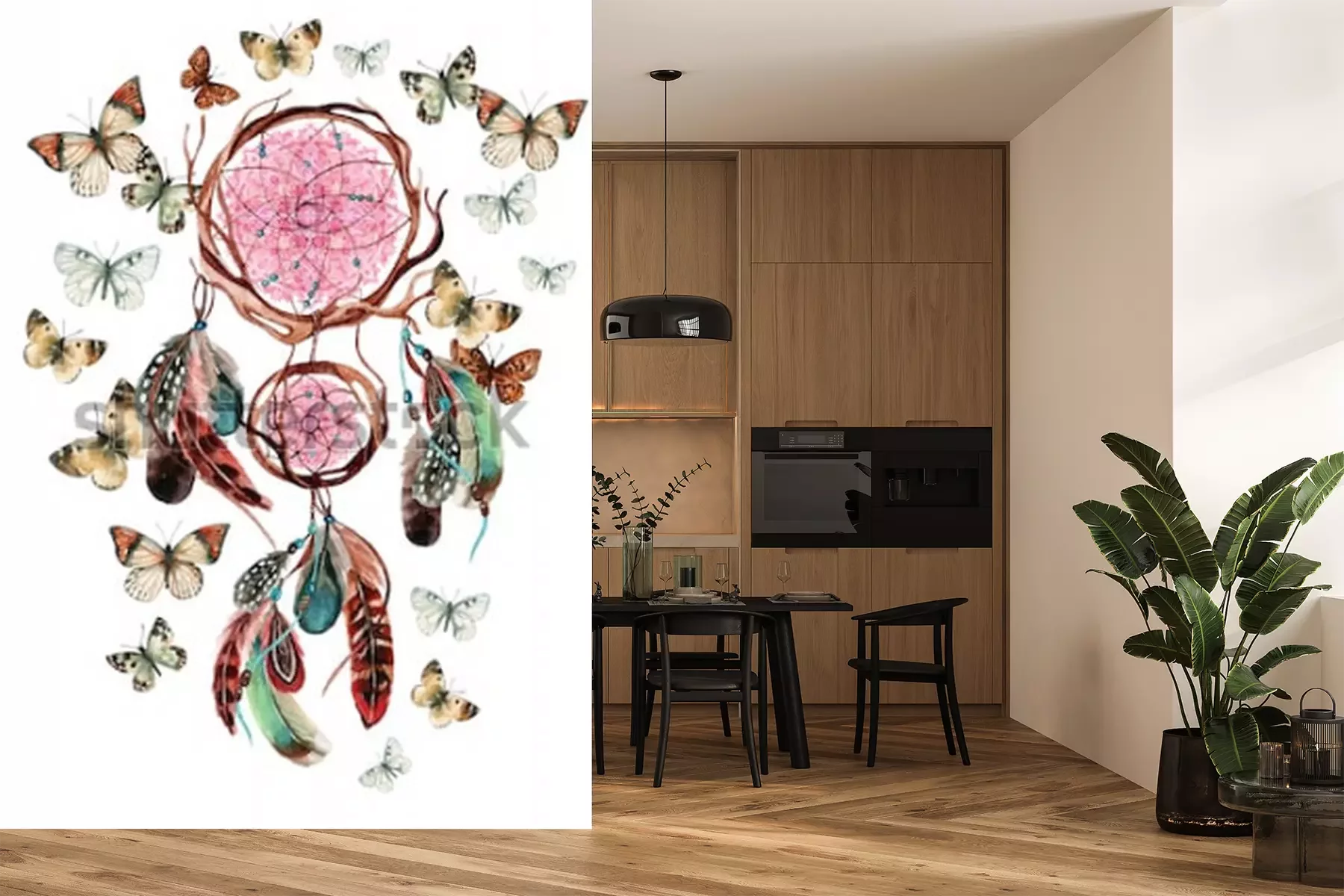 Sticker  Capteur de rêves avec plumes et mandala. Dreamcatcher ethnique aquarelle et papillon isolé sur fond blanc. Illustration peinte à la main pour votre conception
