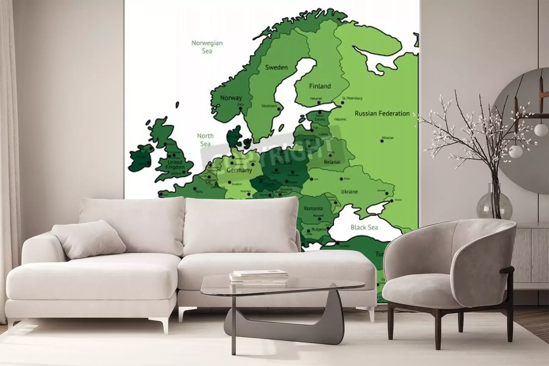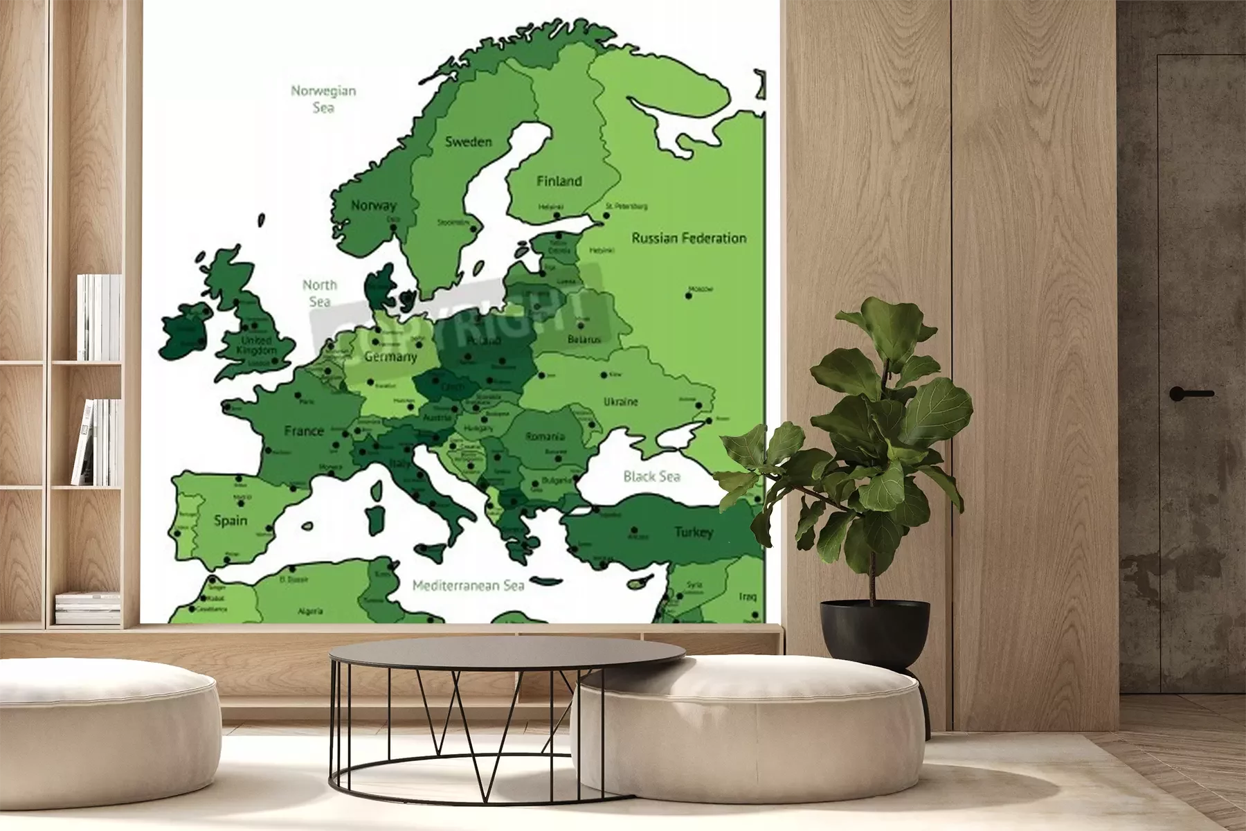 Sticker  Carte de l'Europe de couleurs vertes. Les noms, les marques de la ville et les frontières nationales sont dans des couches distinctes. Vector illustration.