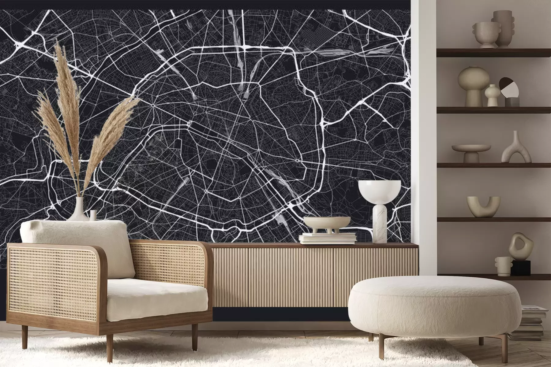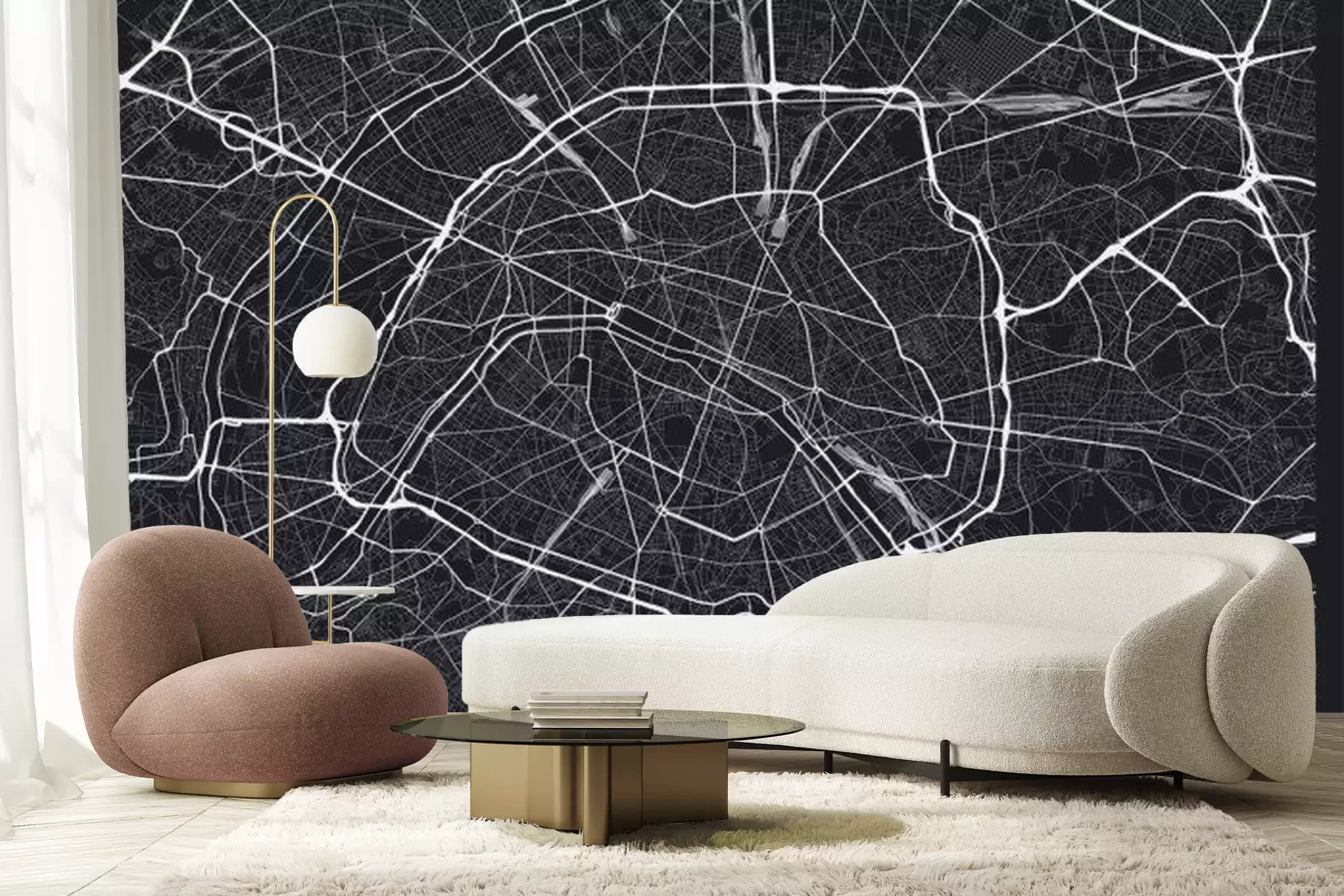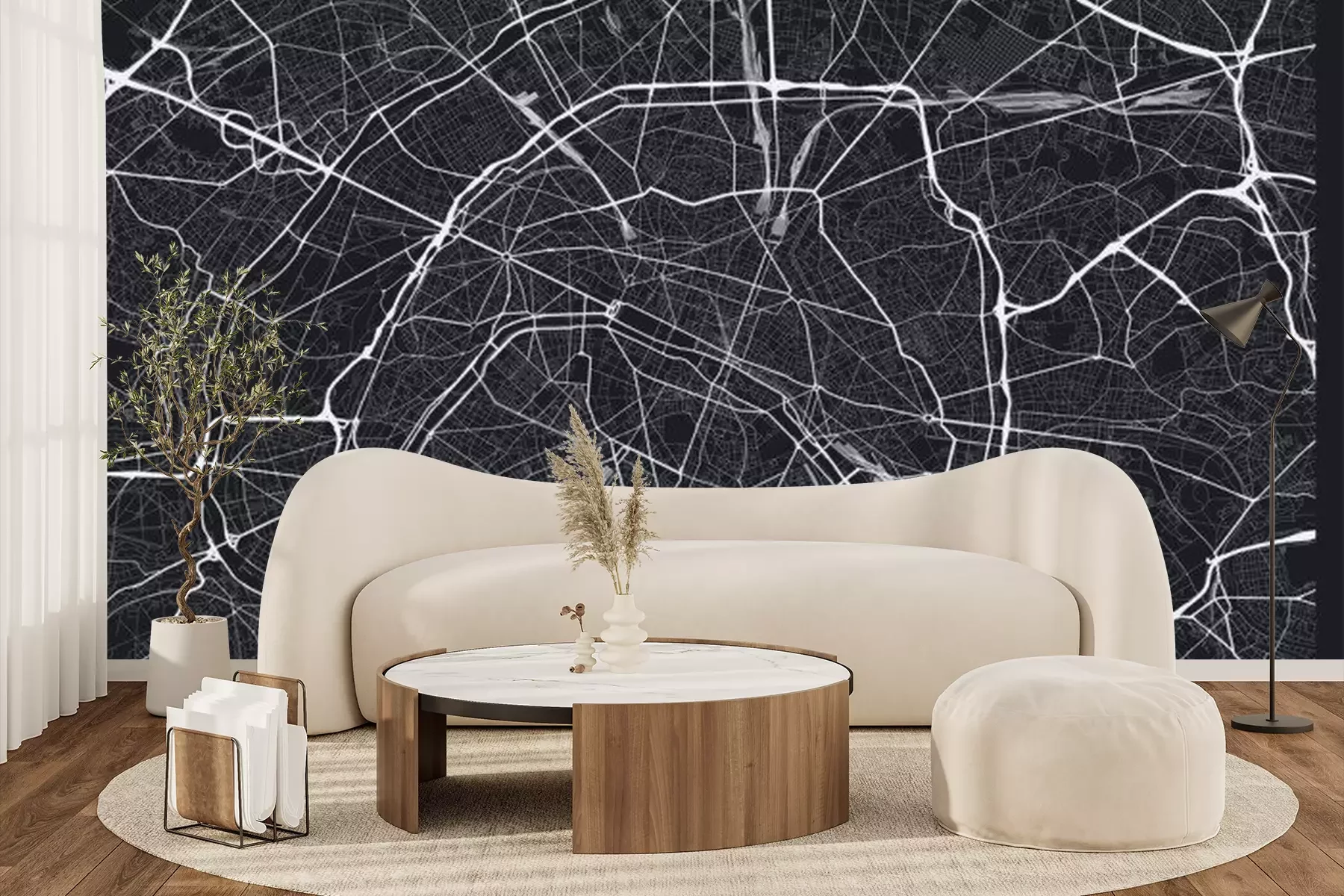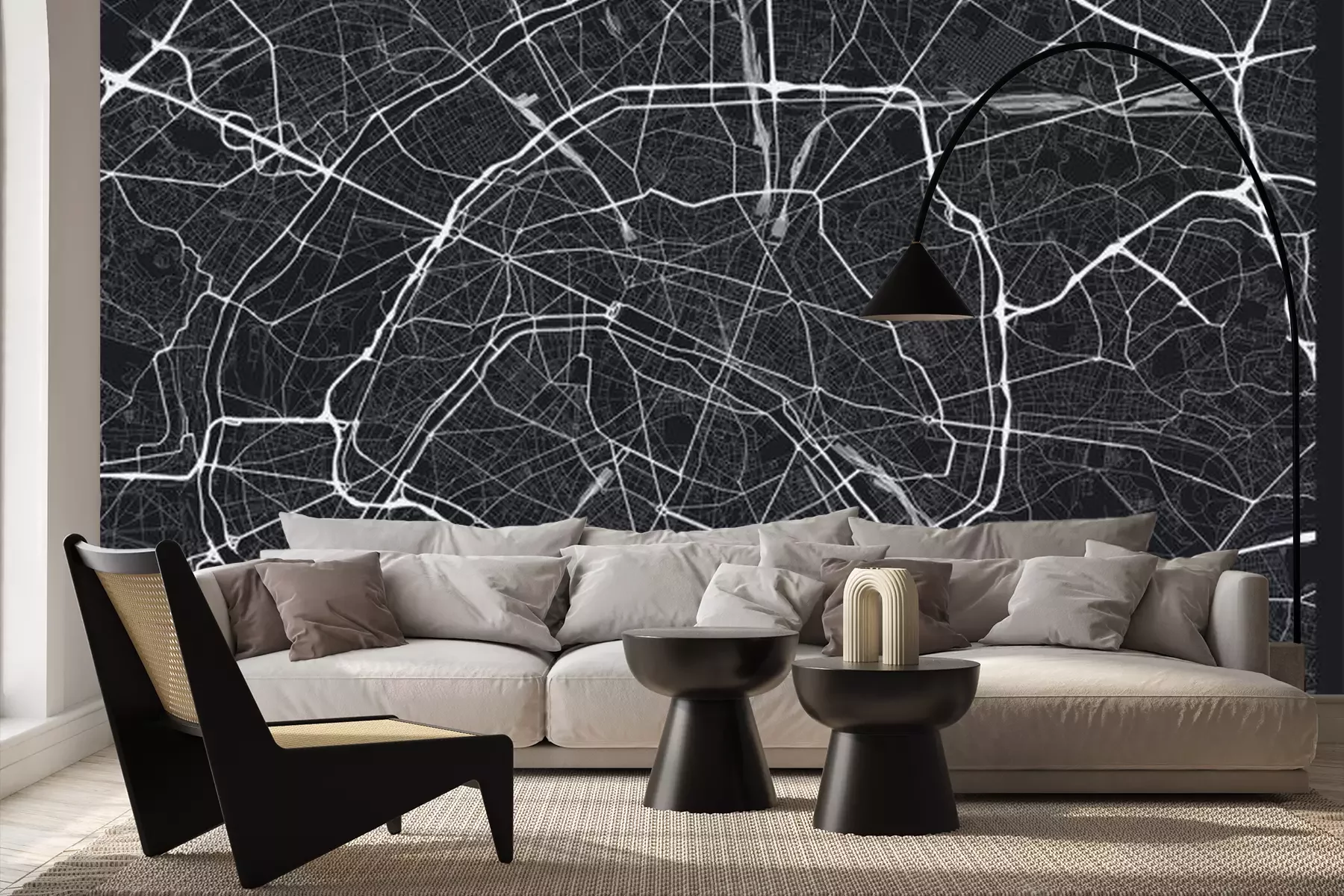 Sticker  Carte de la ville de Paris sombre. Carte routière de Paris (France). Illustration en noir et blanc (sombre) des rues parisiennes. Format affiche imprimable (album).