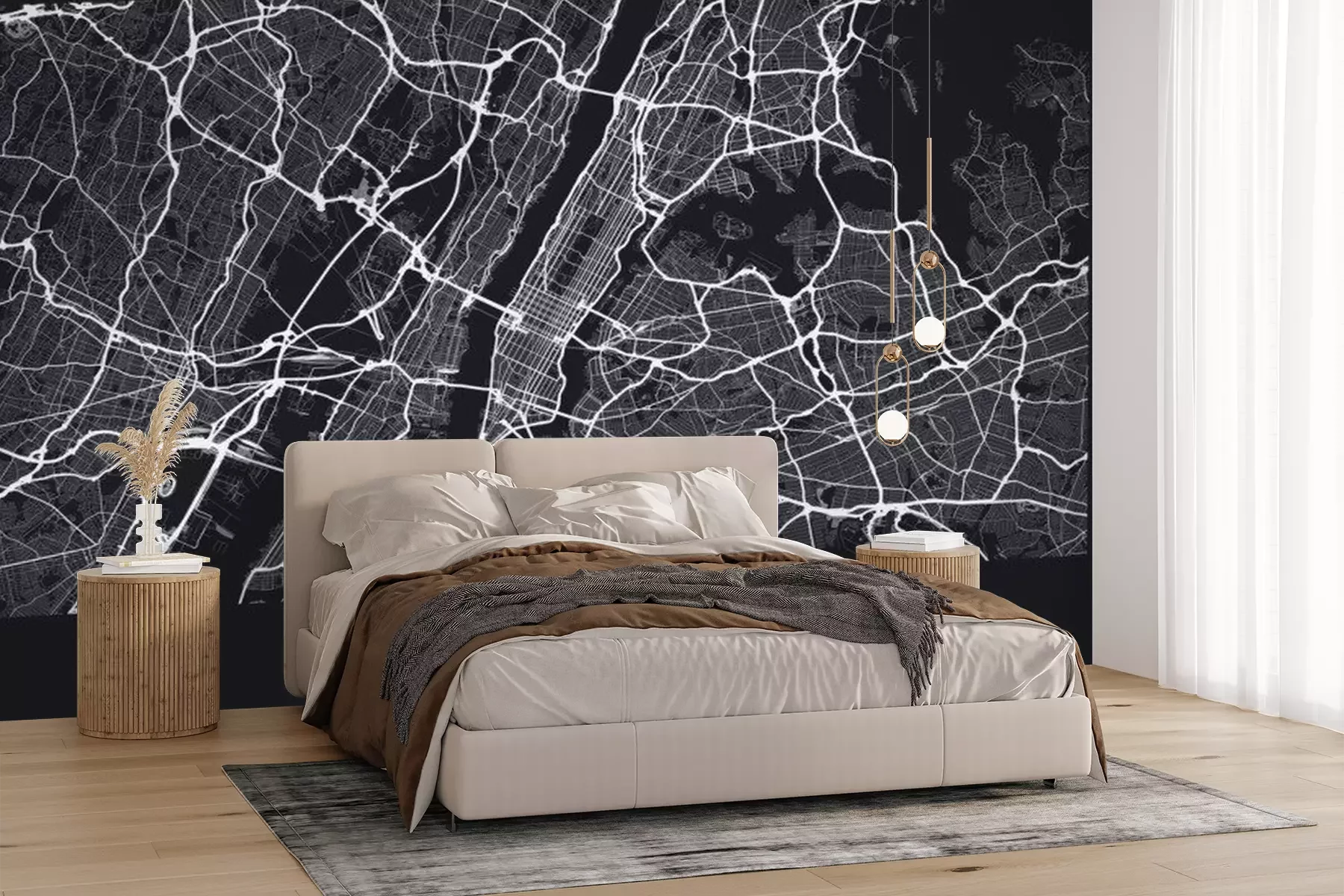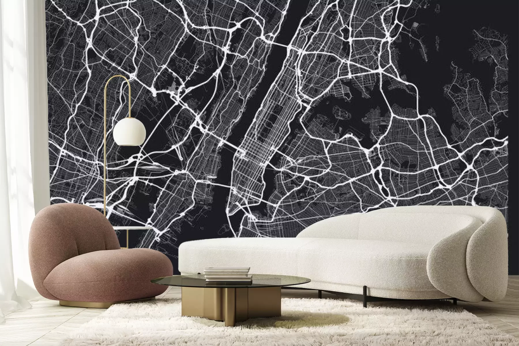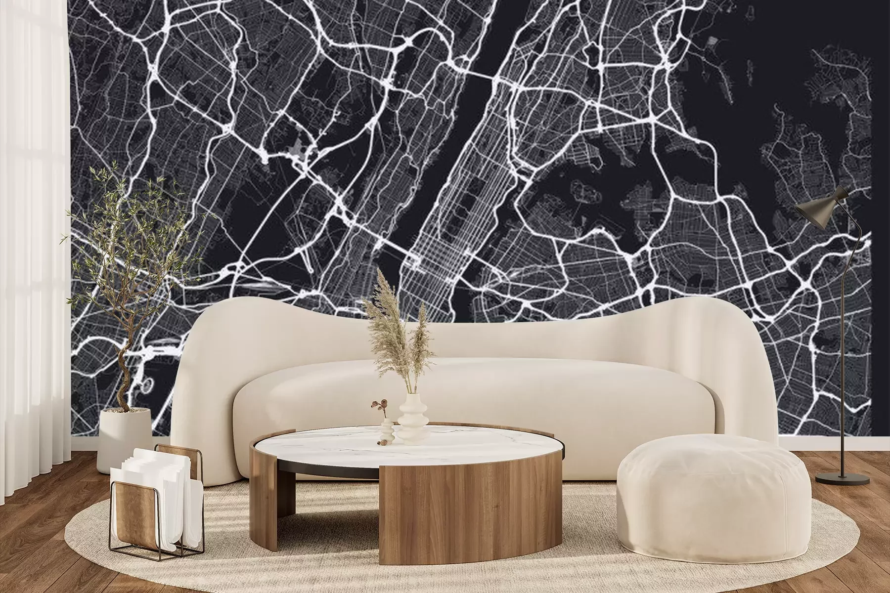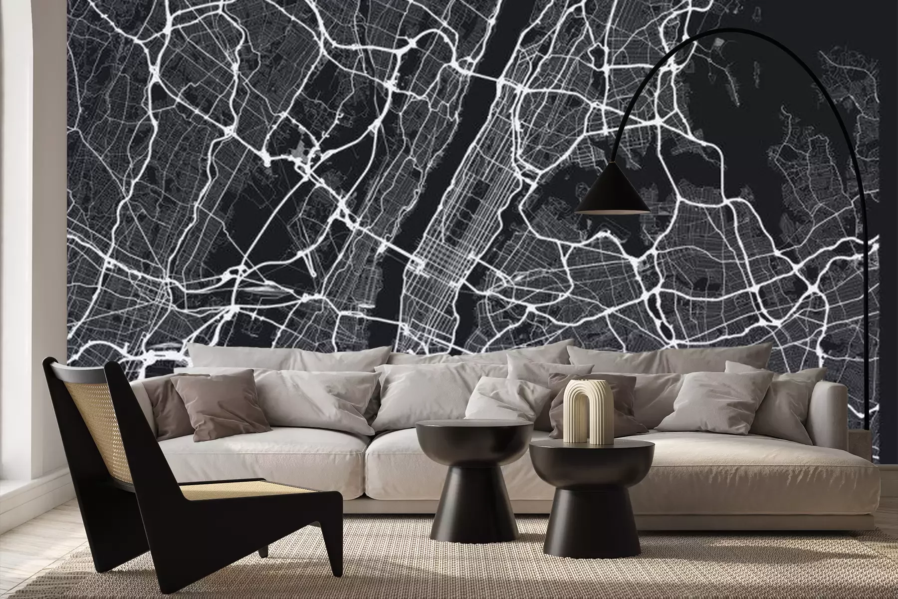 Sticker  Carte sombre de la ville de New York. Carte routière de New York (États-Unis). Illustration noir et blanc (sombre) des rues de new york. Réseau de transport de la Big Apple. Format affiche imprimable
