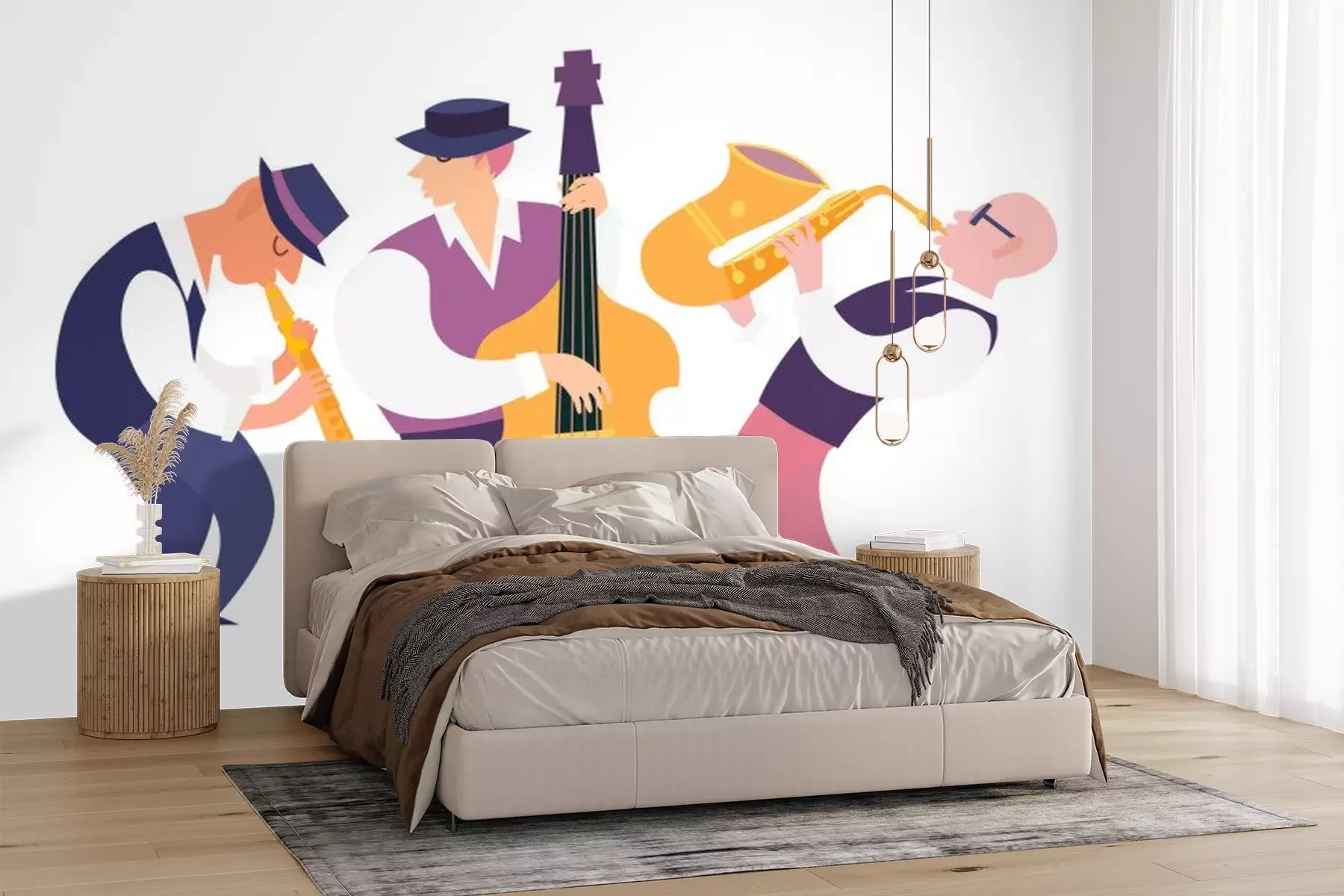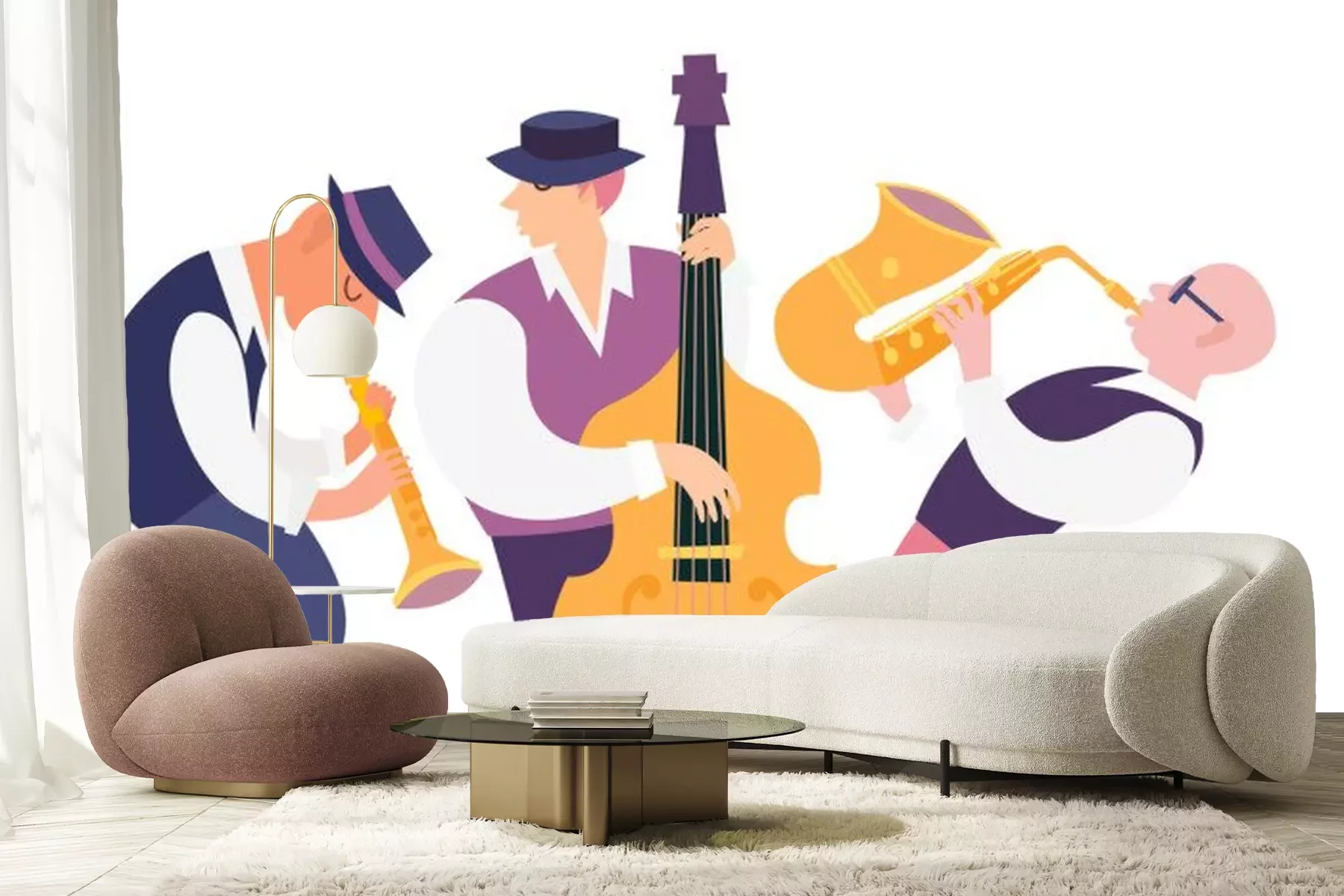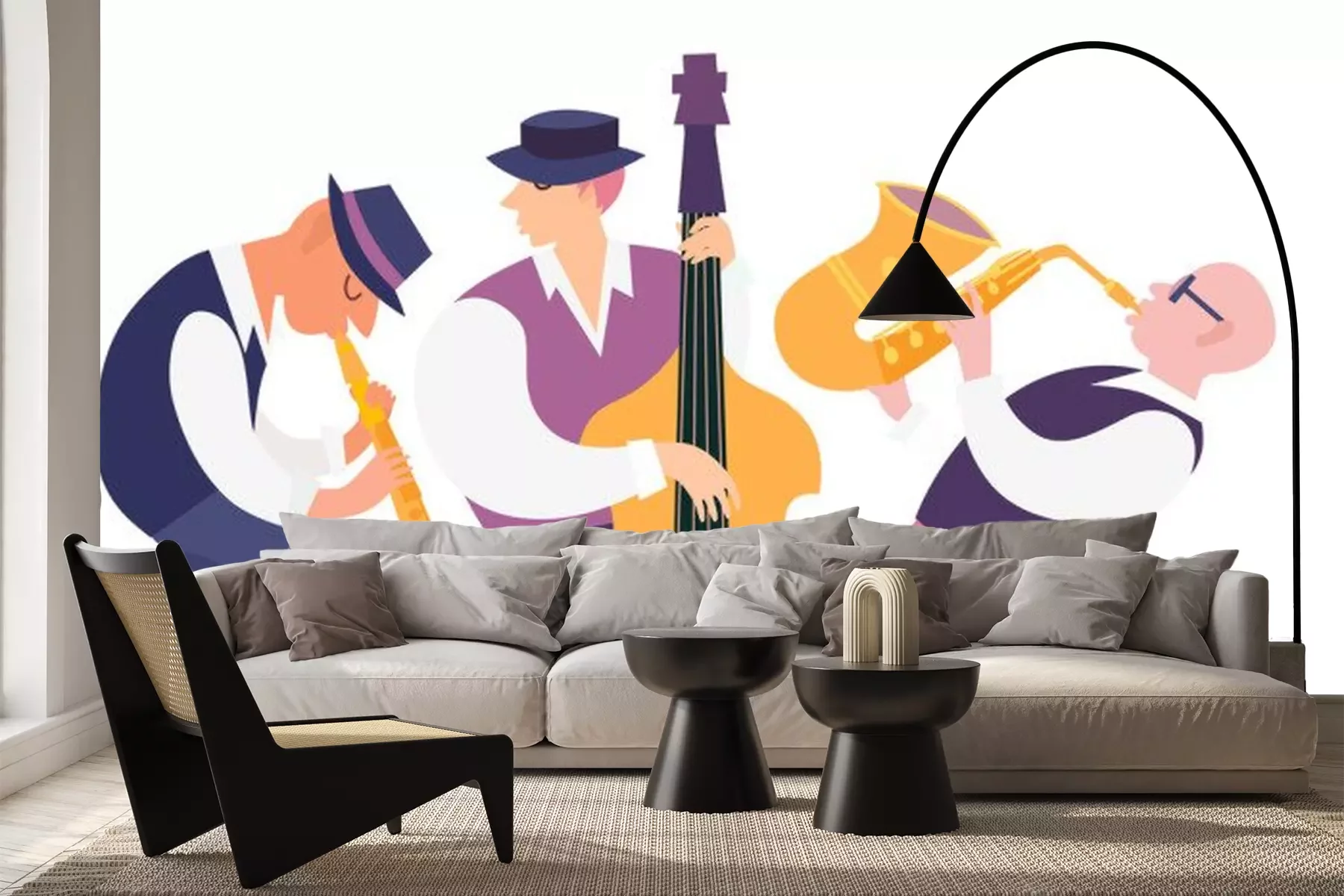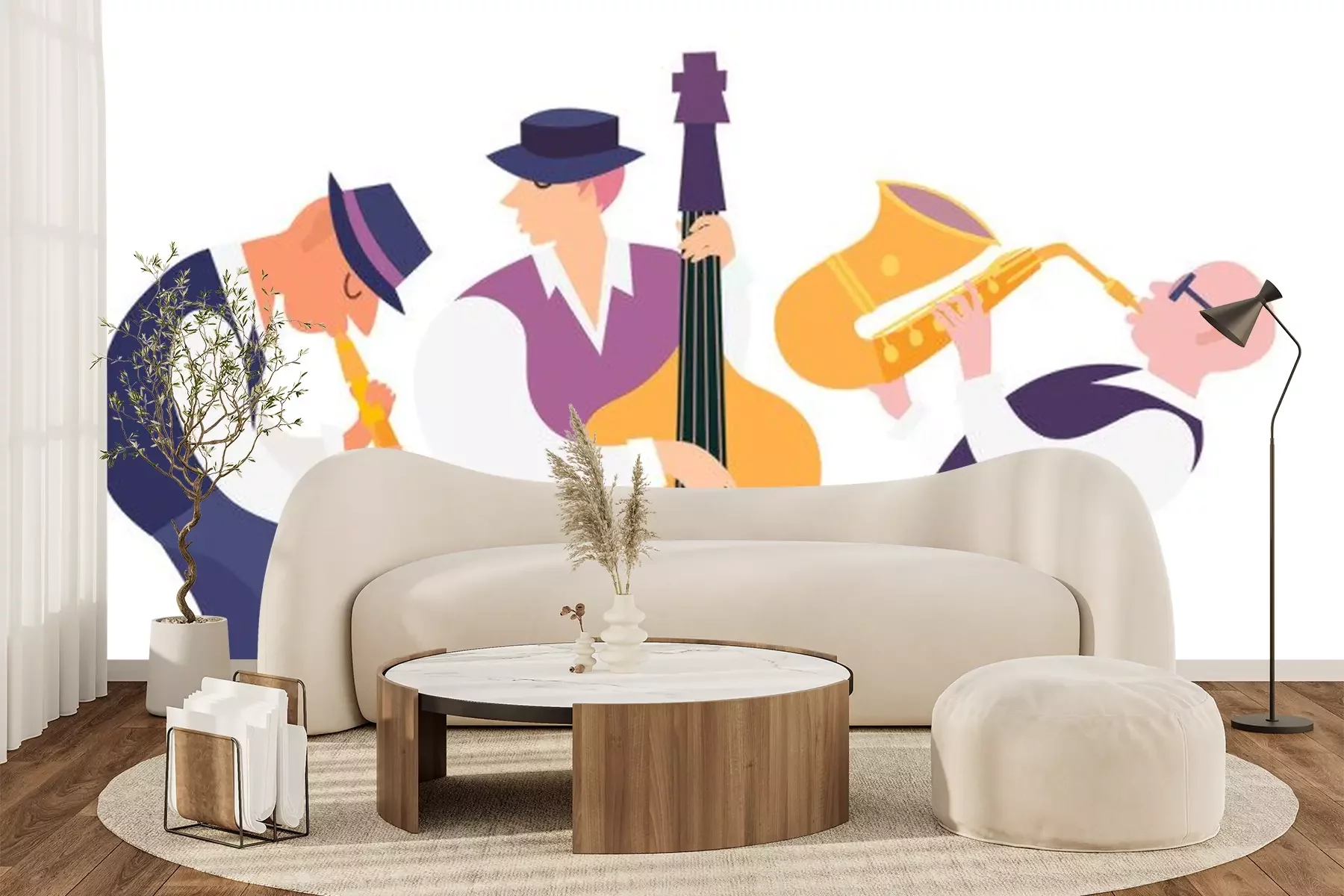 Sticker  Cartoon jazz musicians group vector illustration: contrabassist, saxophone and clarinet. People characters playing on musical instruments. Isolated on white background
