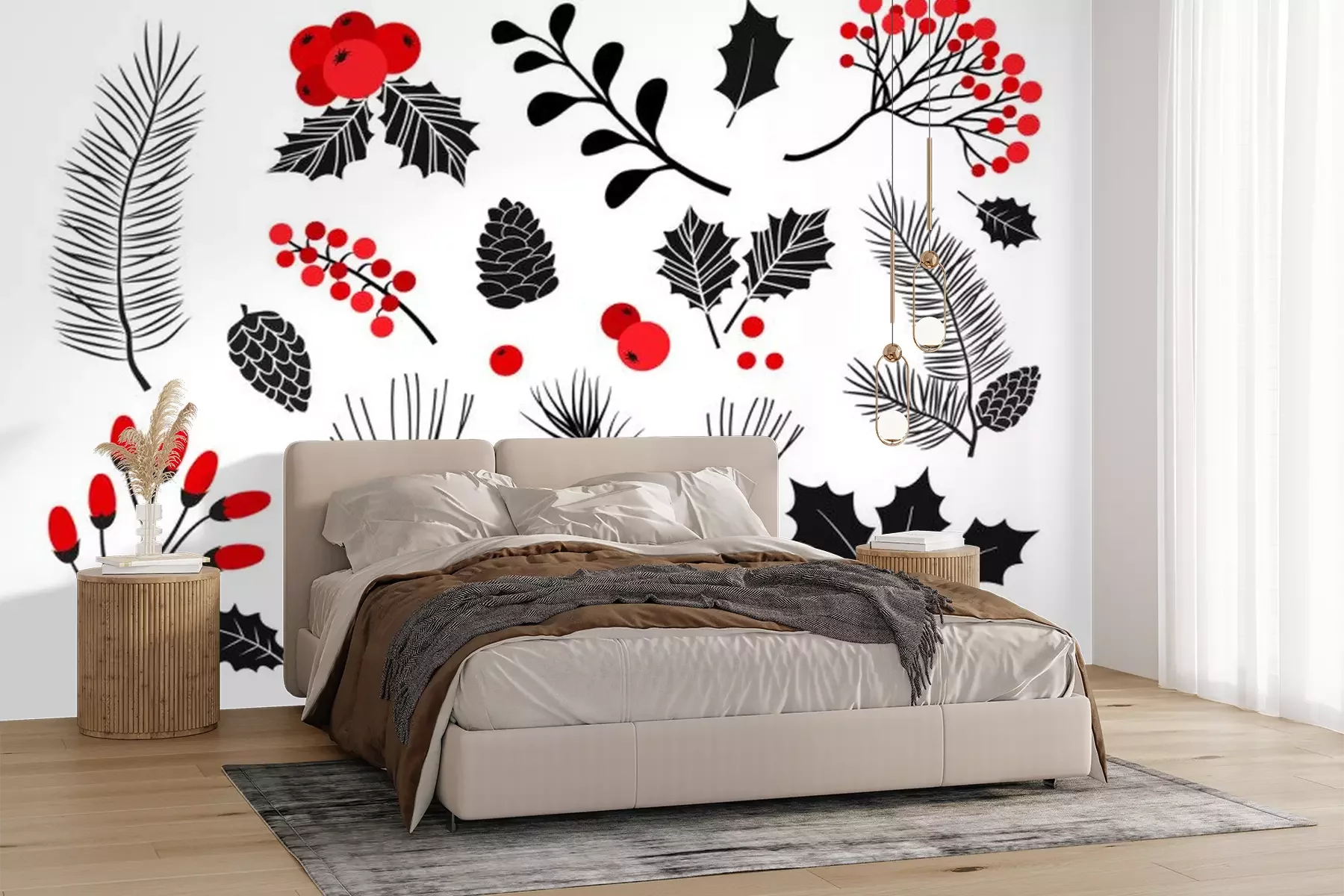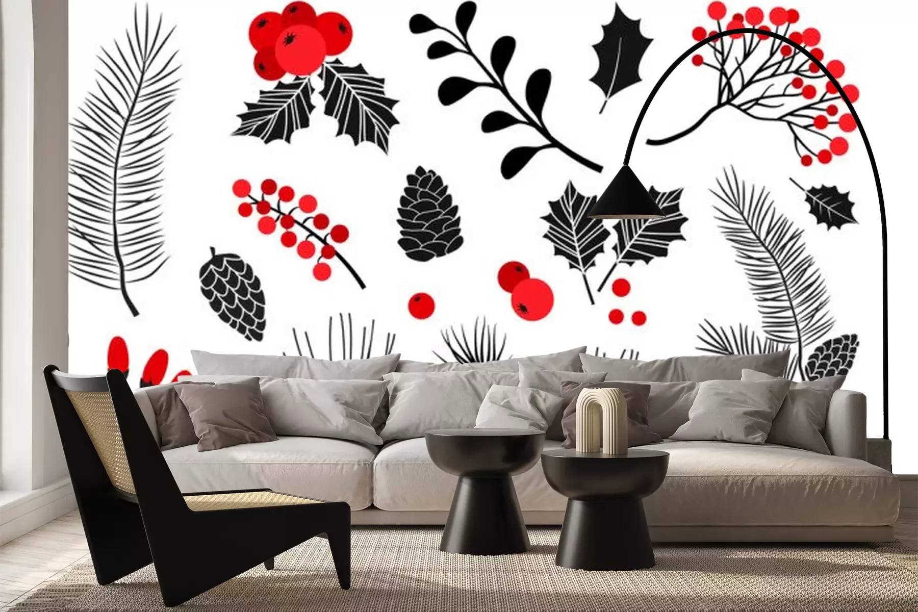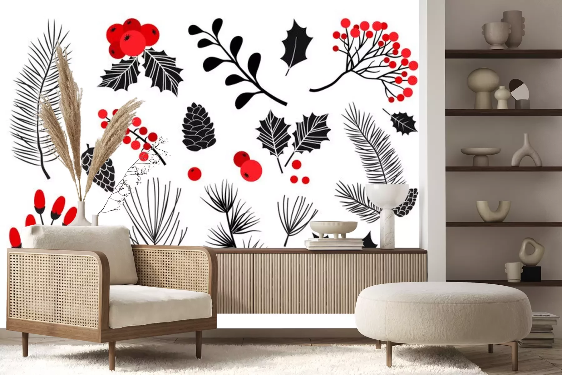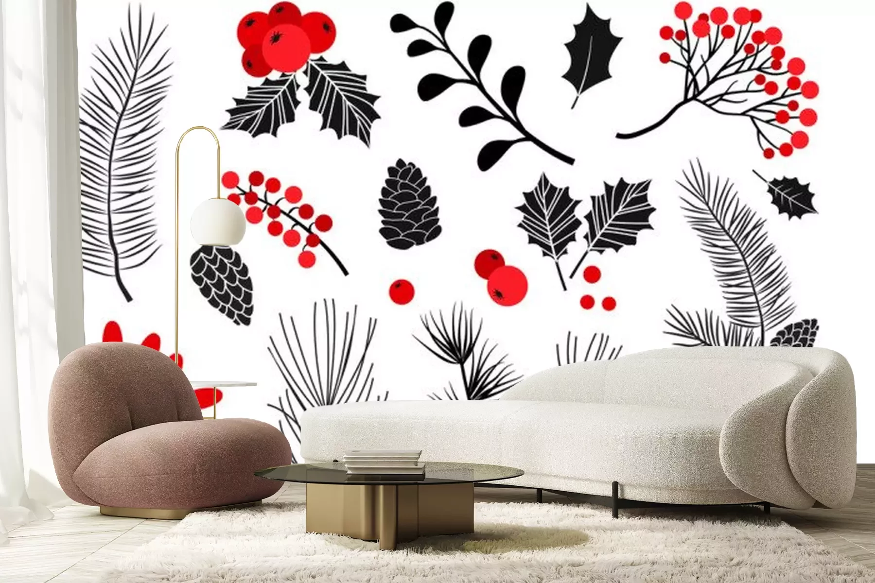 Sticker  Christmas vector plants, holly berry, christmas tree, pine, rowan, leaves branches, holiday decoration, winter symbols isolated on white background. Red and black colors. Vintage nature illustration