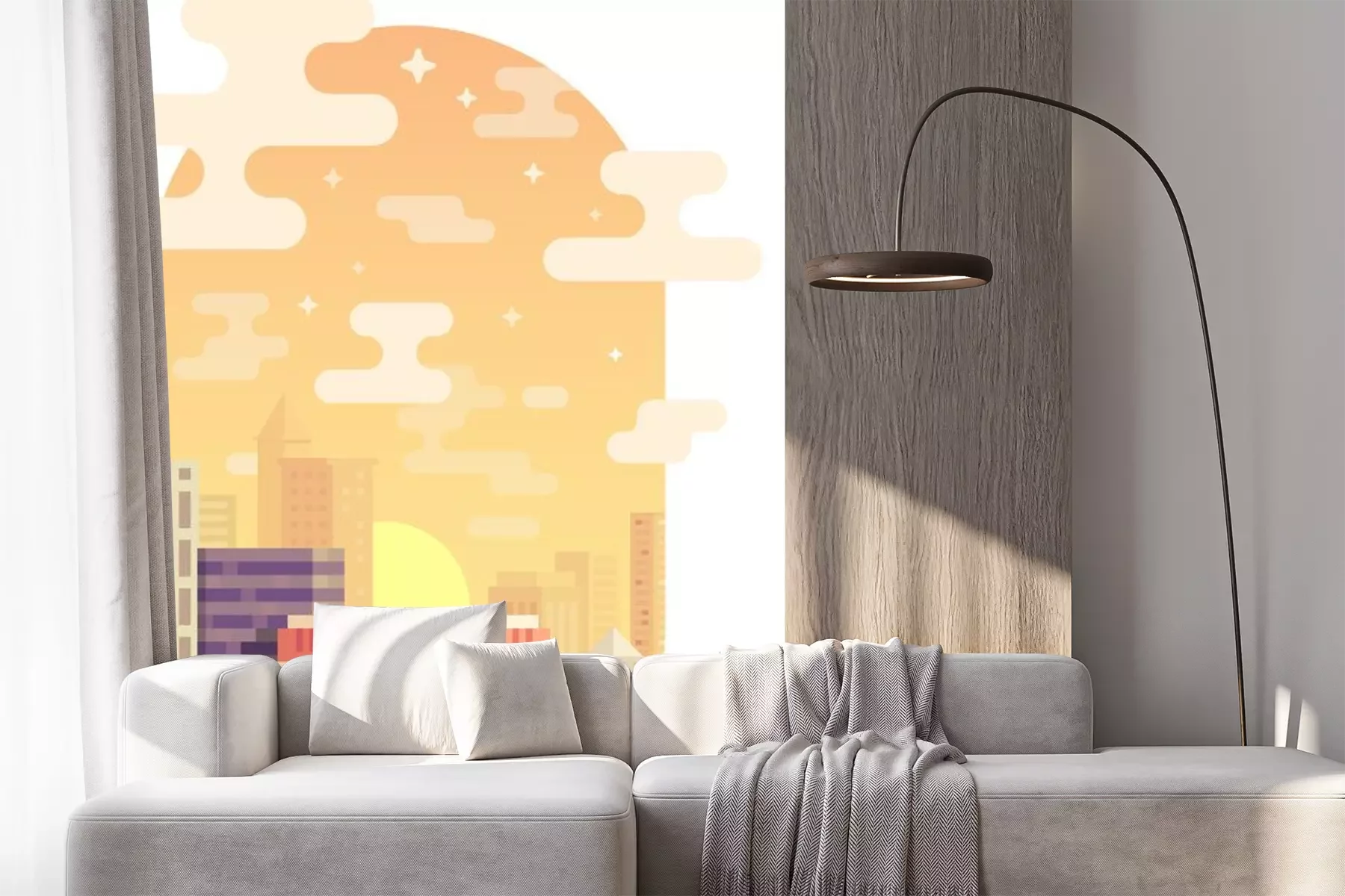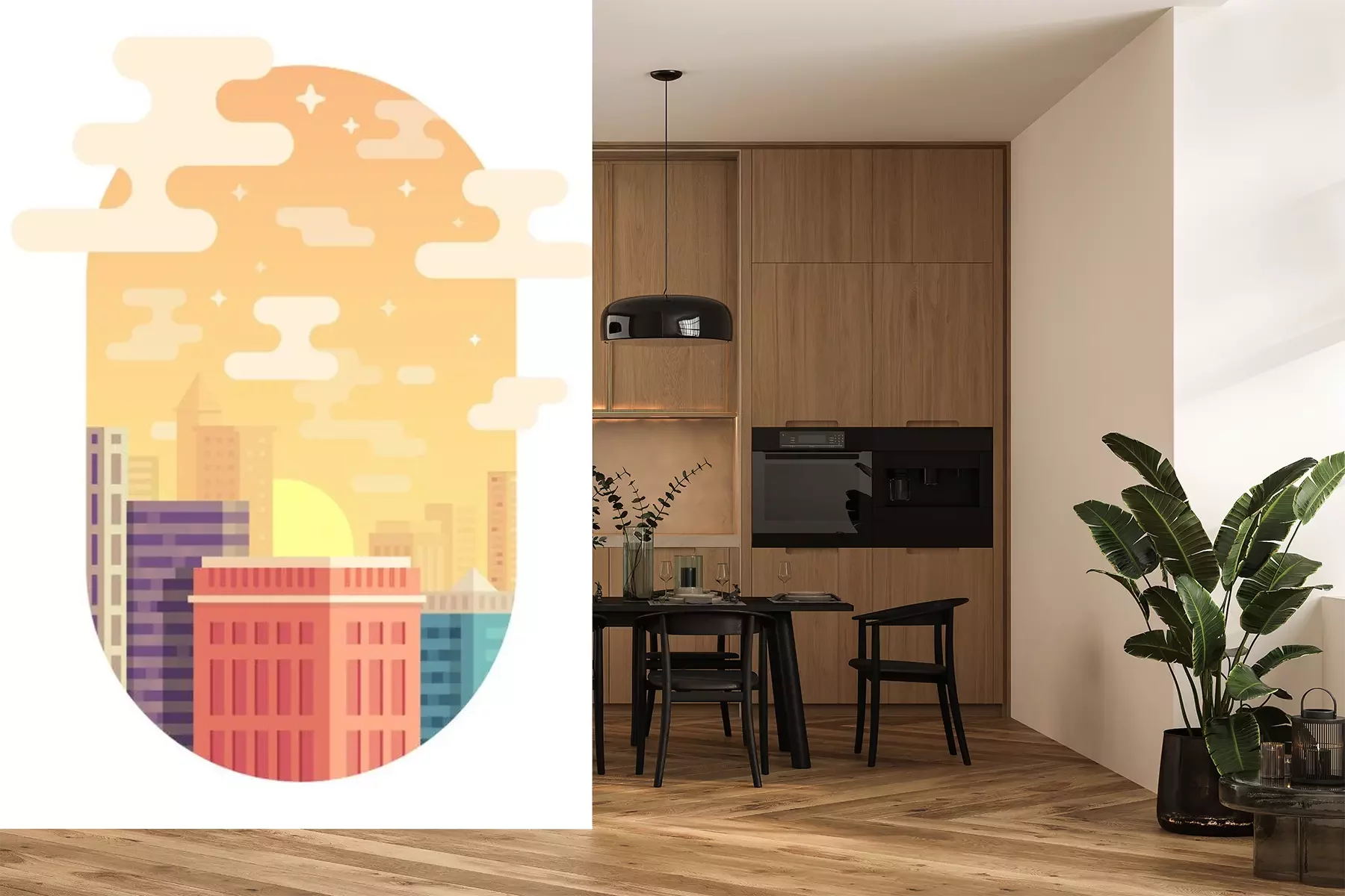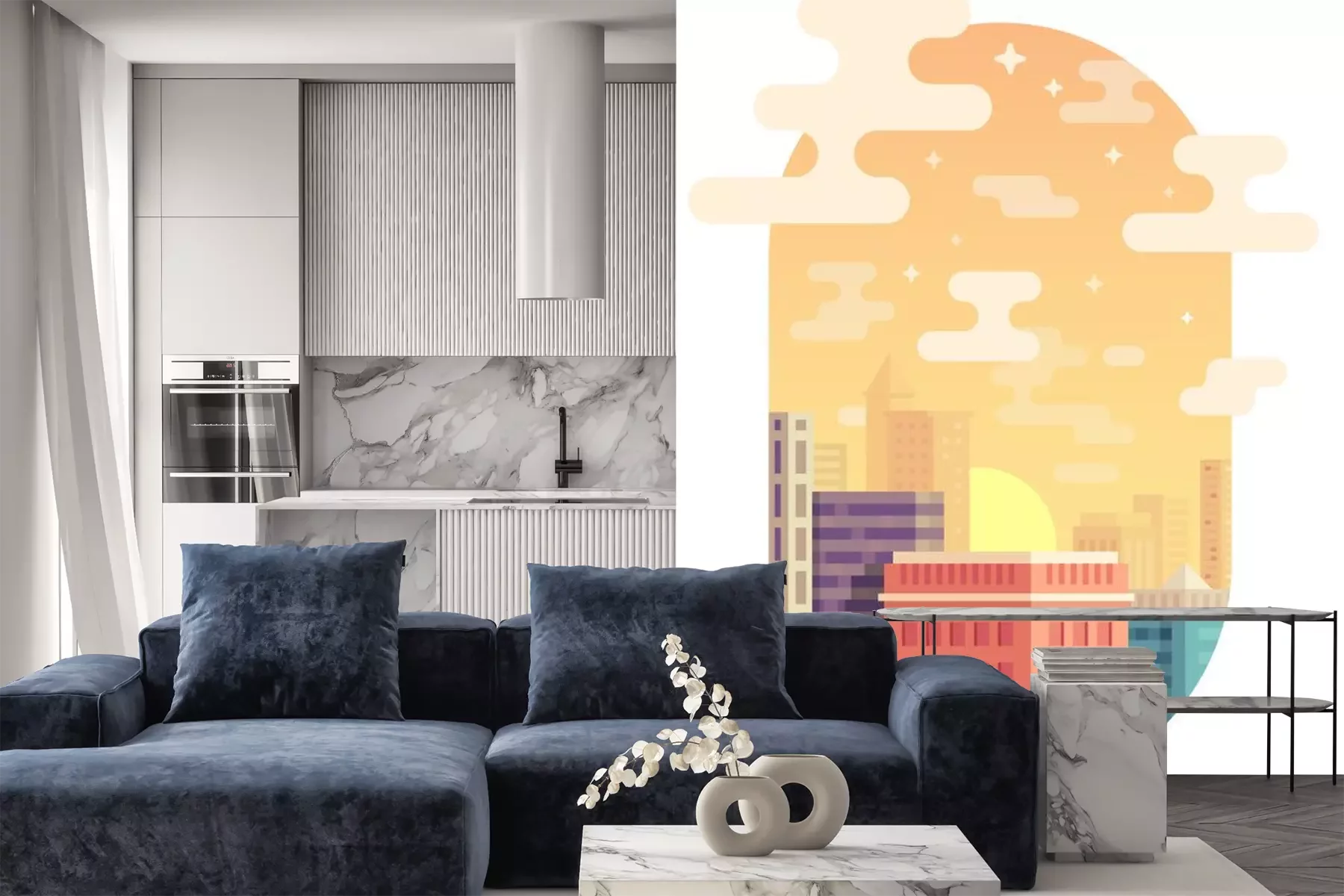 Sticker  City skyline vector illustration. Urban landscape. Cityscape in flat style. Modern city landscape. Cityscape backgrounds. Sunset in the city. Vertical orientation