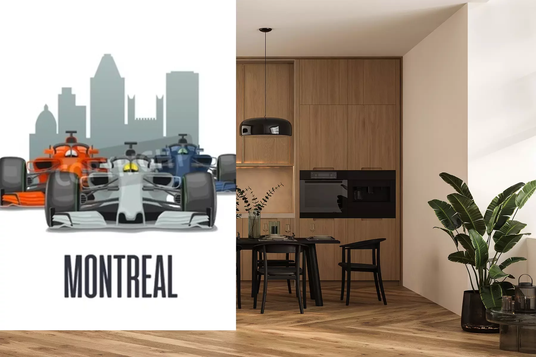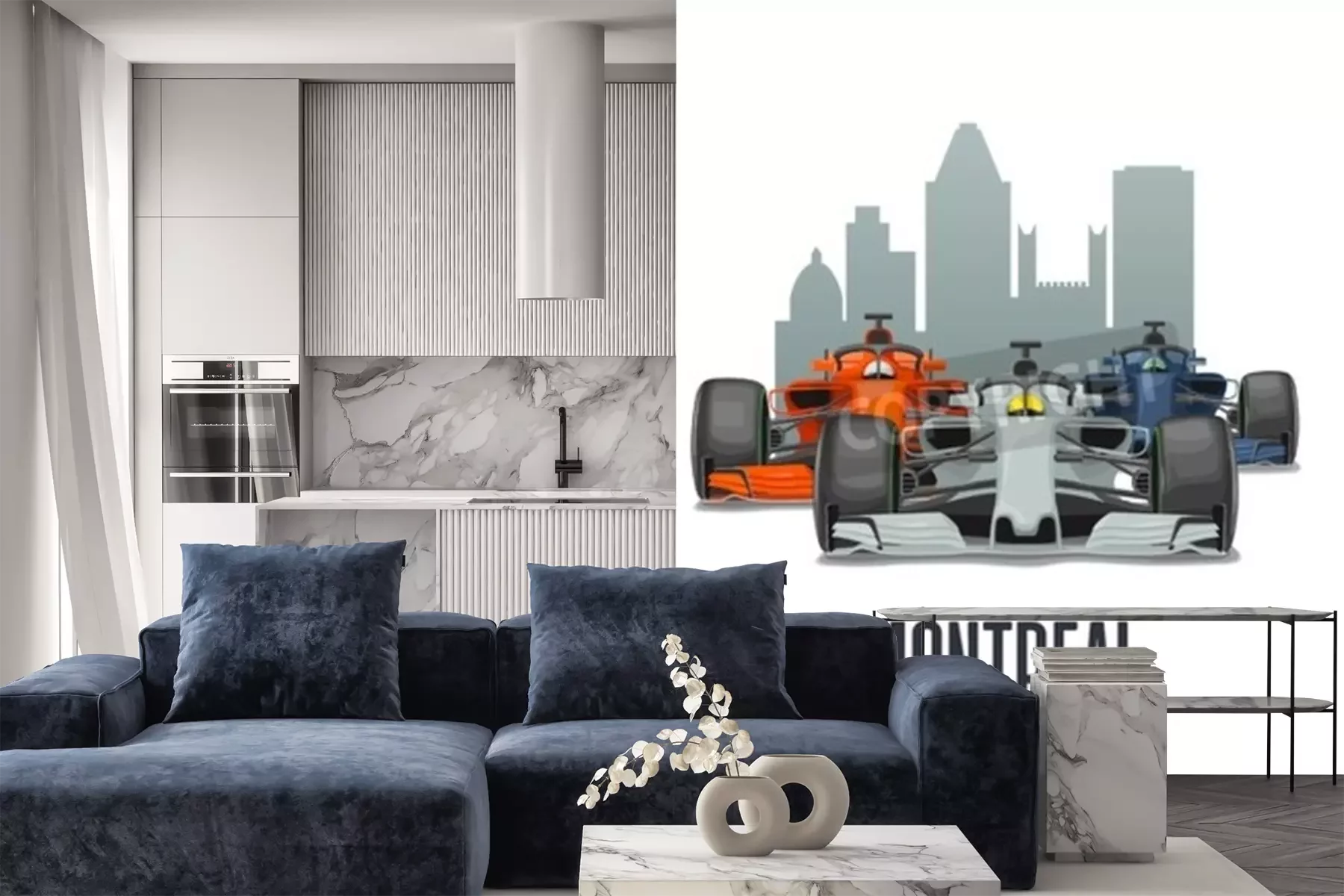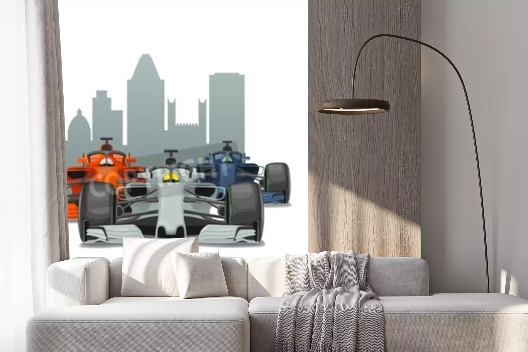 Sticker  Cityline Montreal and three racing cars on Grand Prix Canada. Vector flat illustration isolated on white background for poster, web icon
