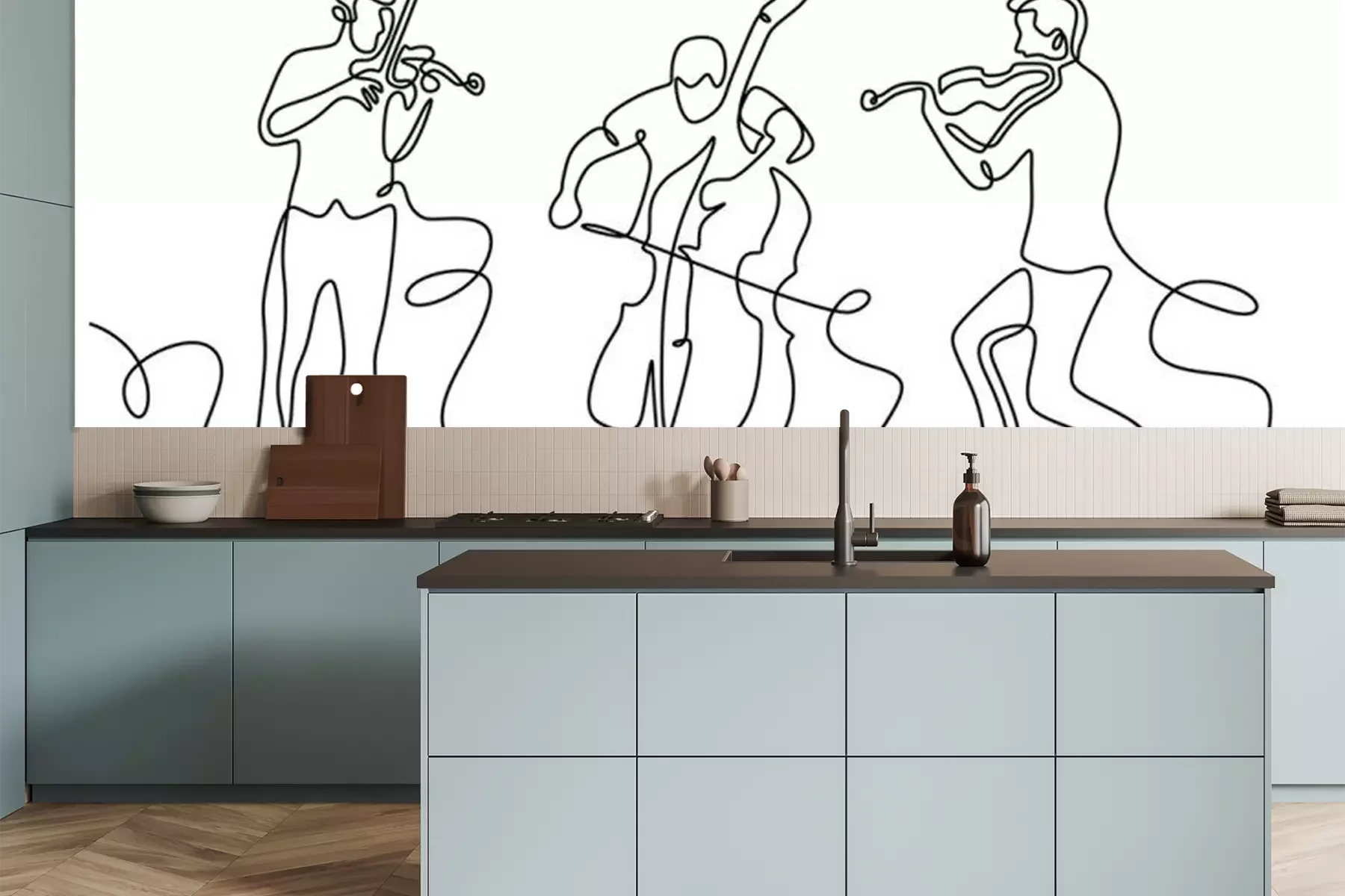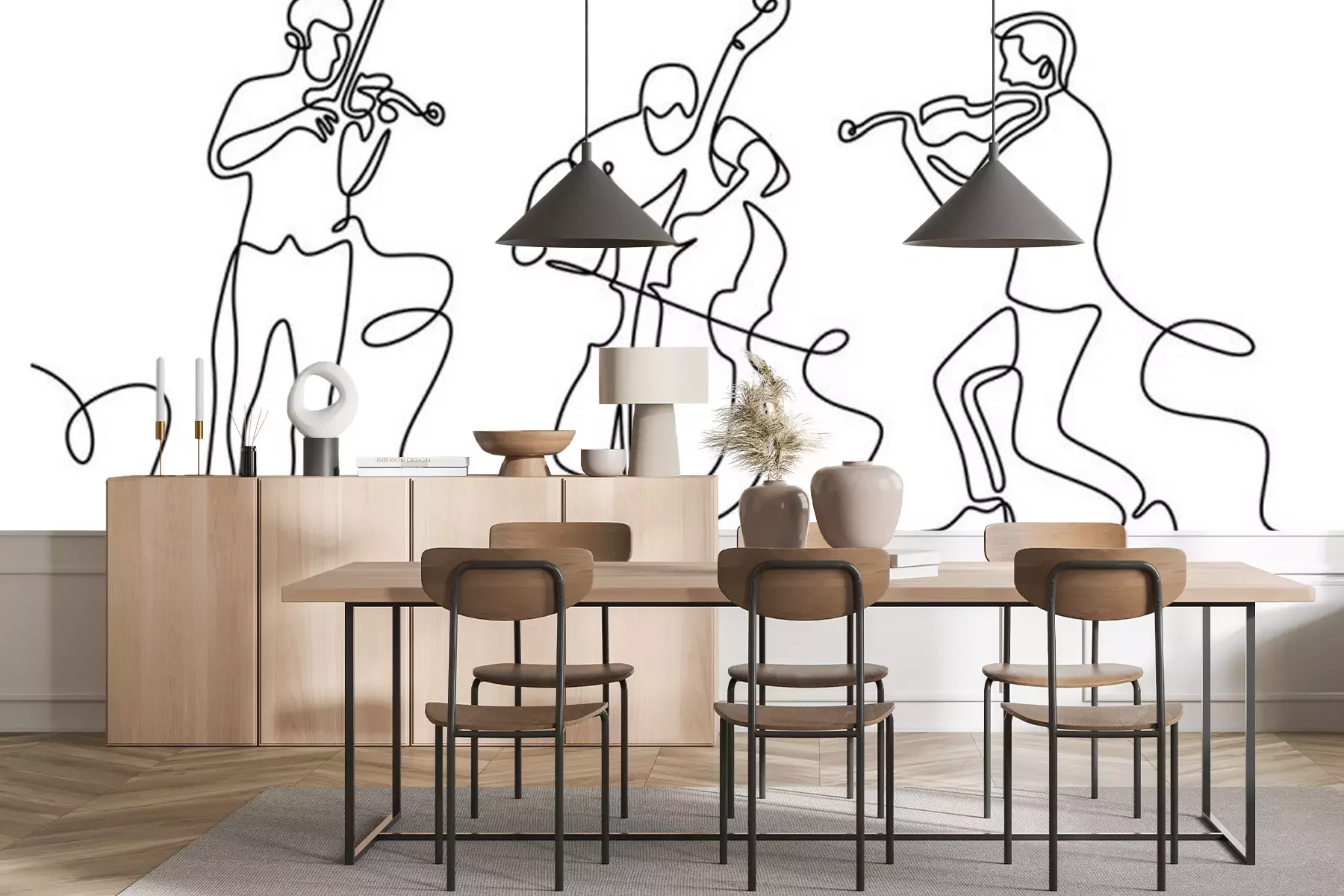 Sticker  Classical musicians one line drawing. Minimalism vector illustration of cello, violin player. Single hand drawn sketch vector illustration. Contour linear design isolated on white background.