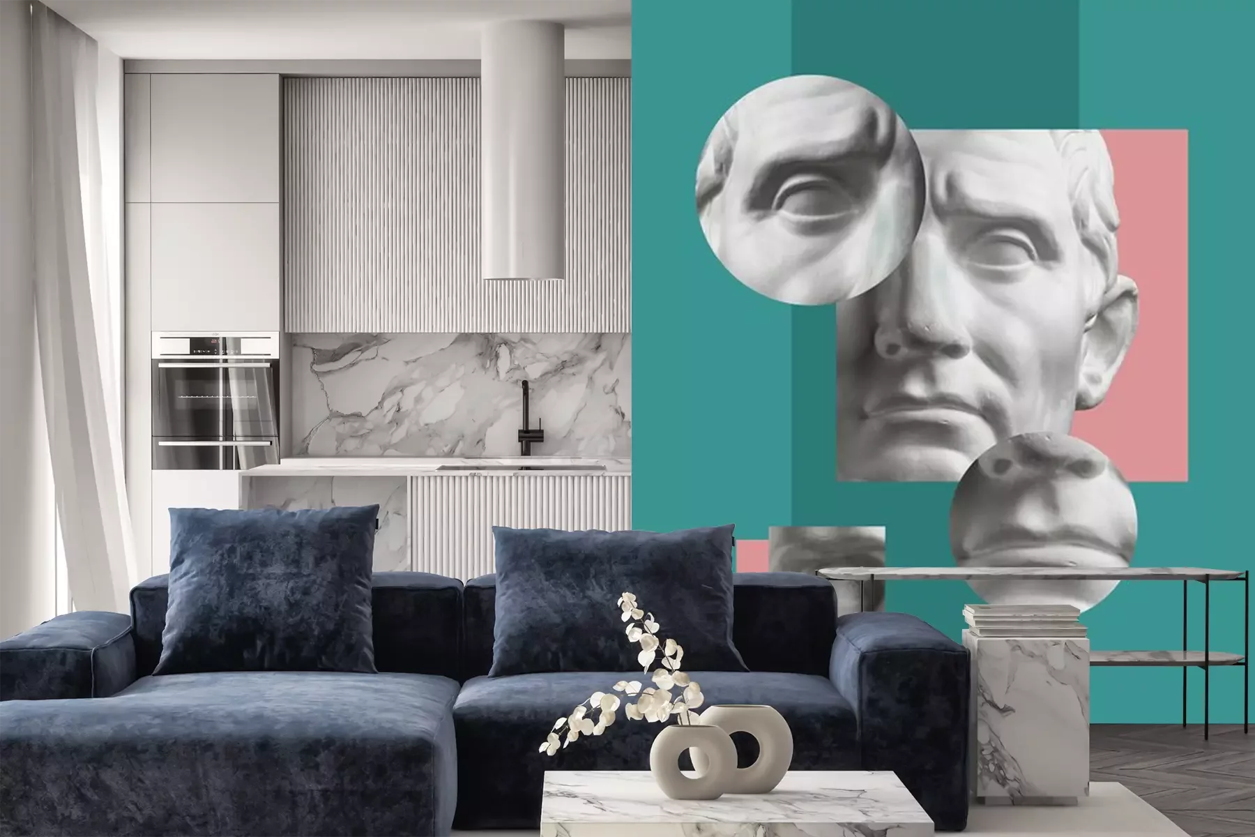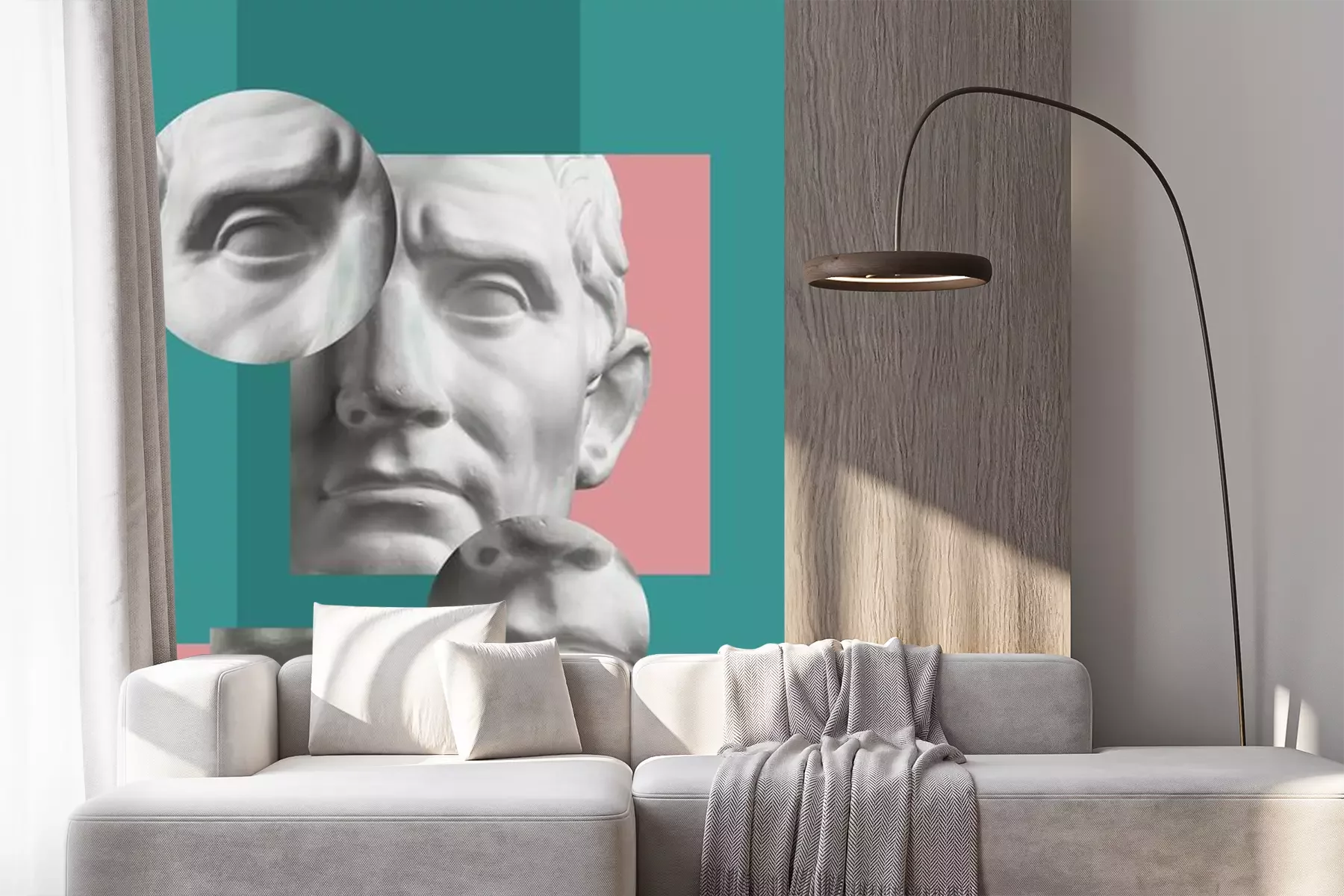Sticker  Collage with plaster antique sculpture of human face in a pop art style. Modern creative concept image with ancient statue head. Zine culture. Contemporary art poster. Funky minimalism. Retro design.