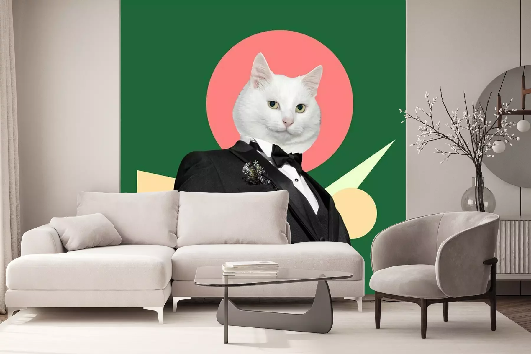 Sticker  Costume and a black tie with a white cat head. Digital collage modern art.