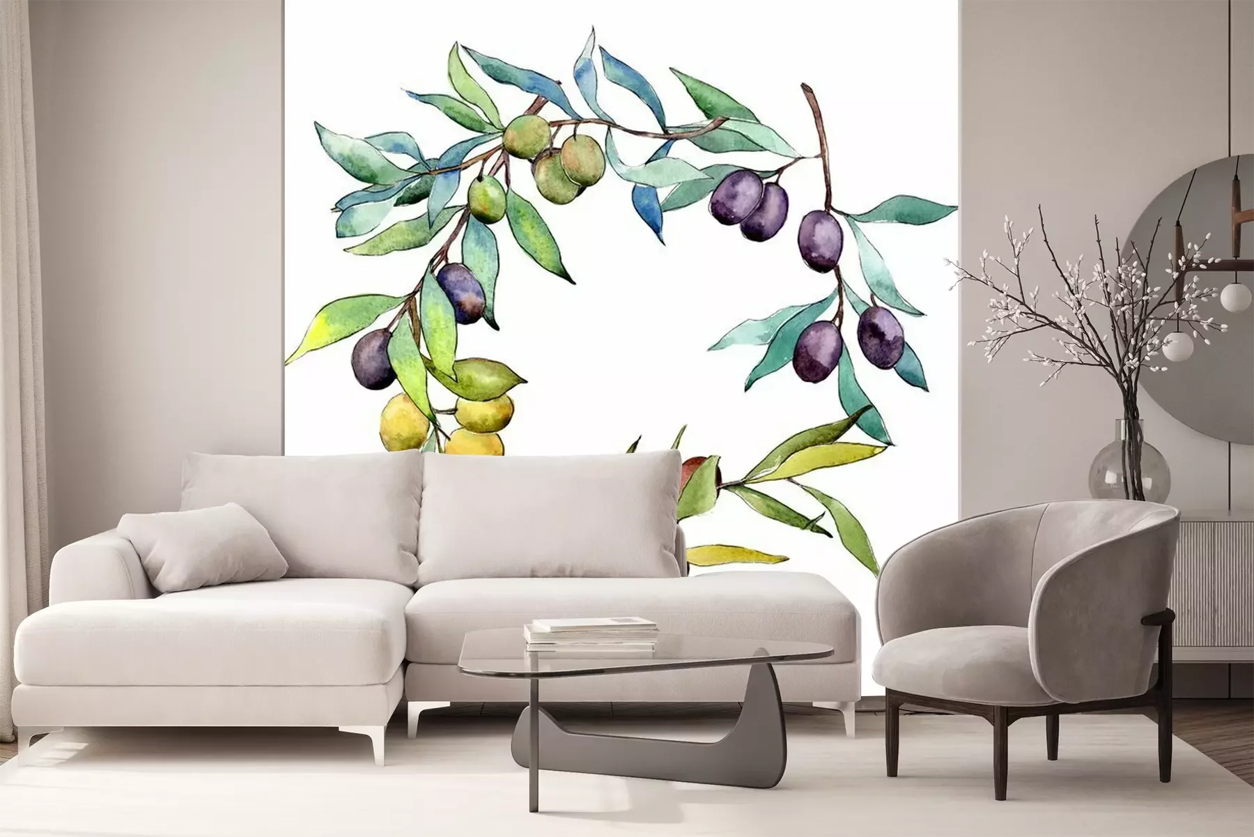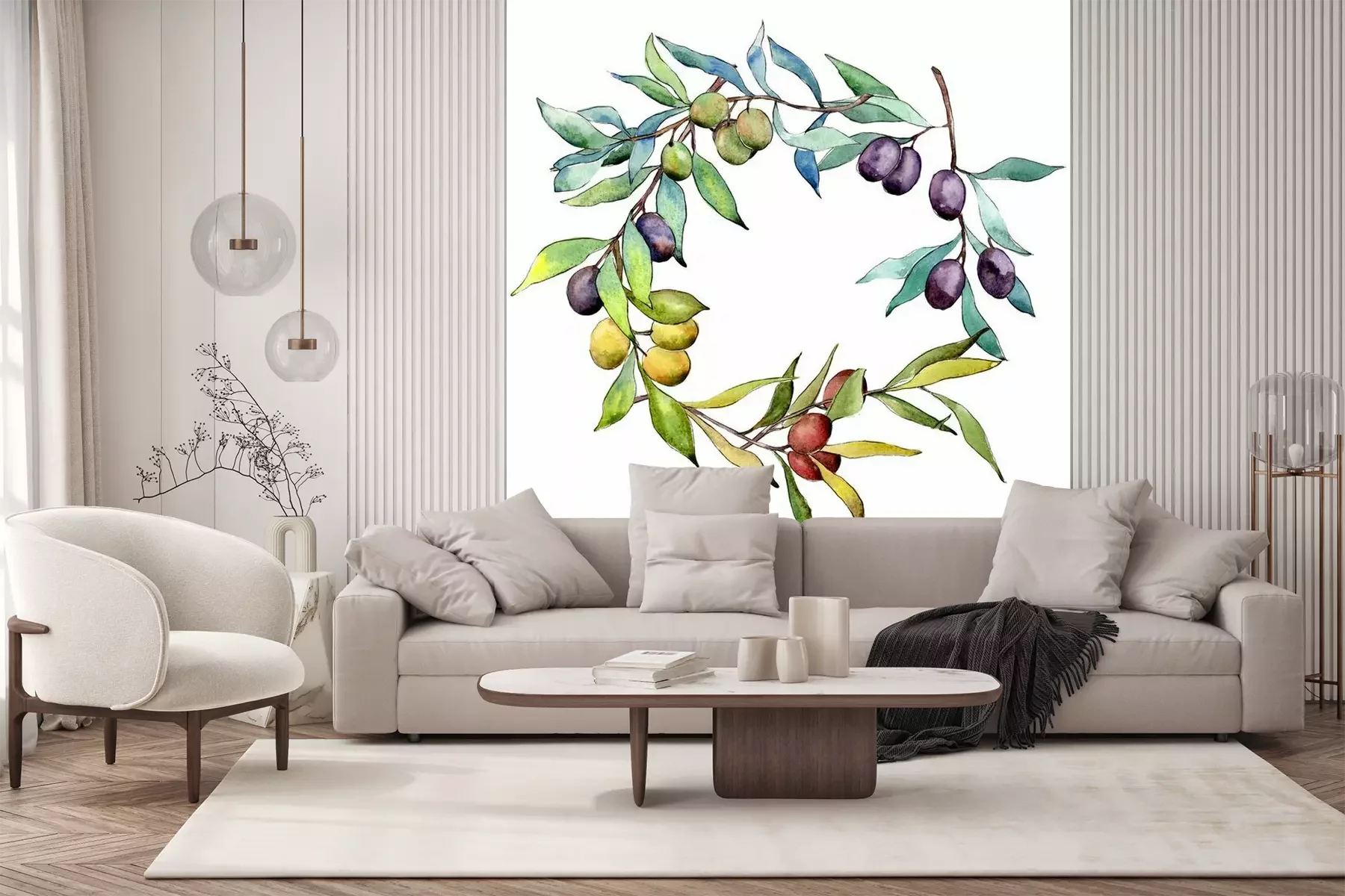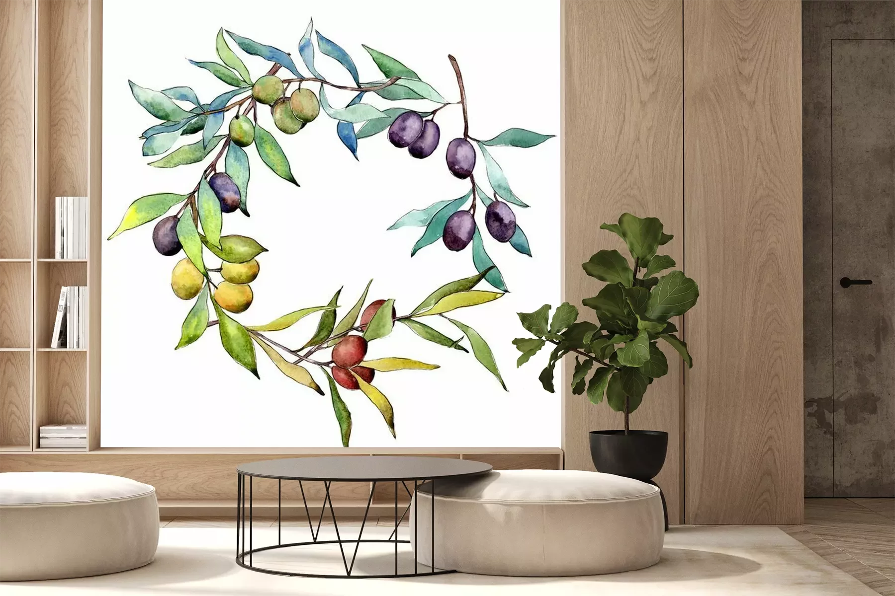 Sticker  Couronne d'Olivier dans un style aquarelle. Nom complet de la plante: Branches d'un olivier. Aquarelle d'olivier pour le fond, la texture, le motif de l'enveloppe, le cadre ou la bordure.