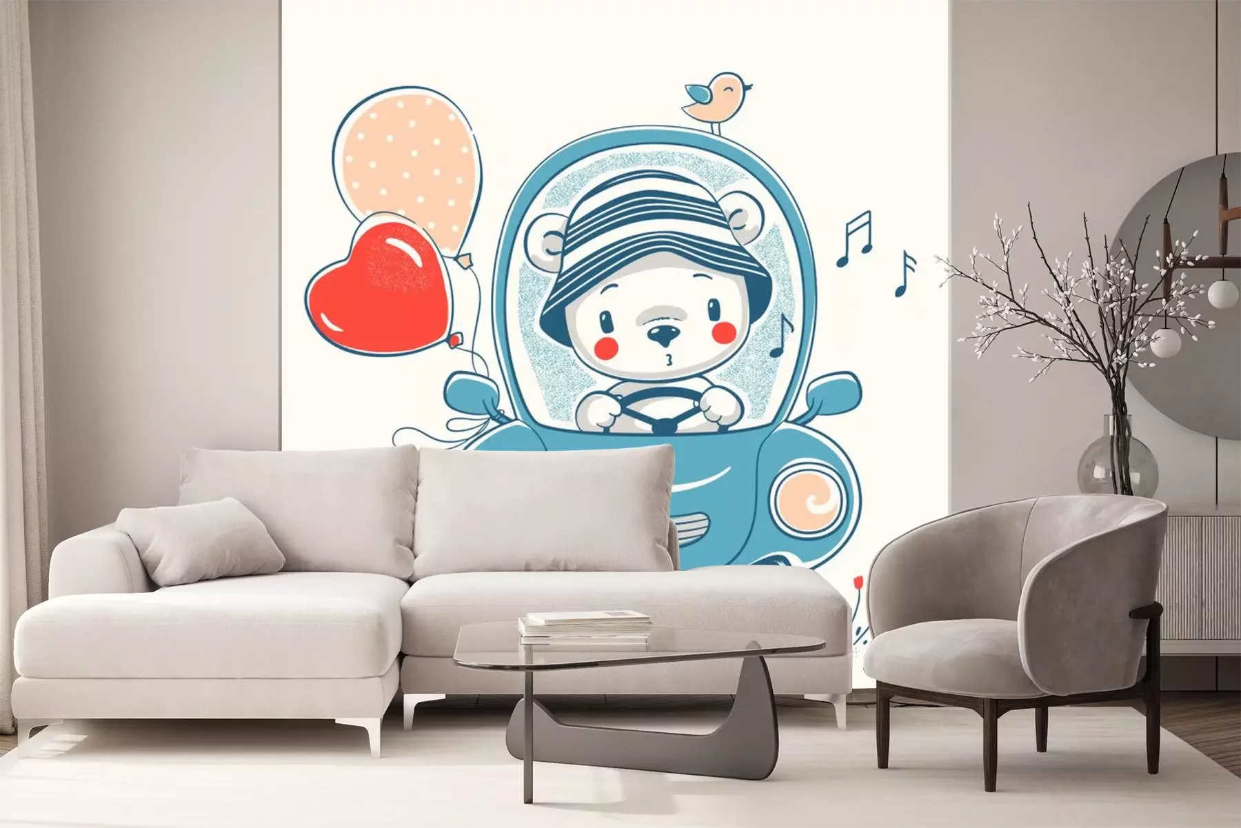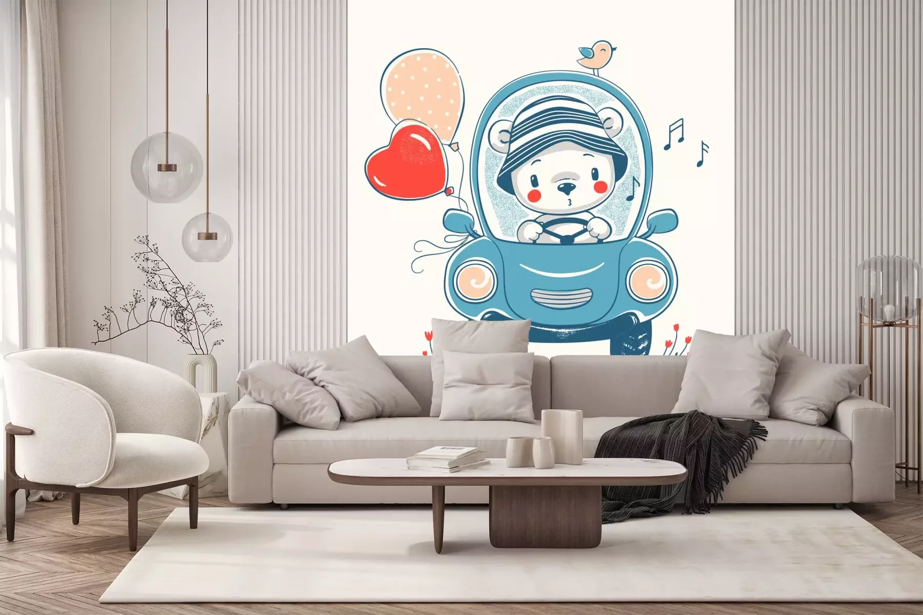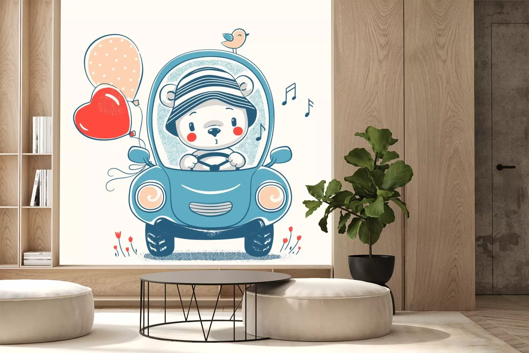 Sticker  Cute baby bear driving car cartoon hand drawn vector illustration. Can be used for baby t-shirt print, fashion print design, kids wear, baby shower celebration greeting and invitation card.