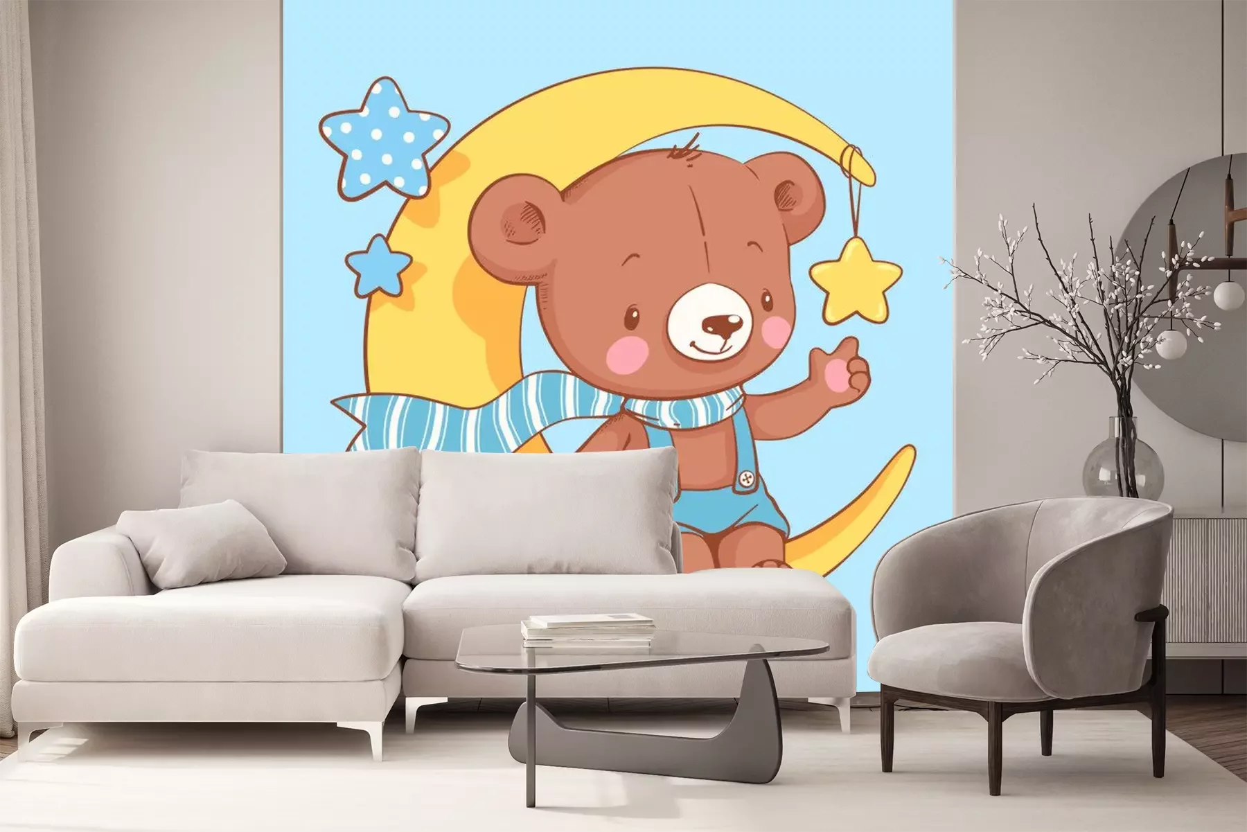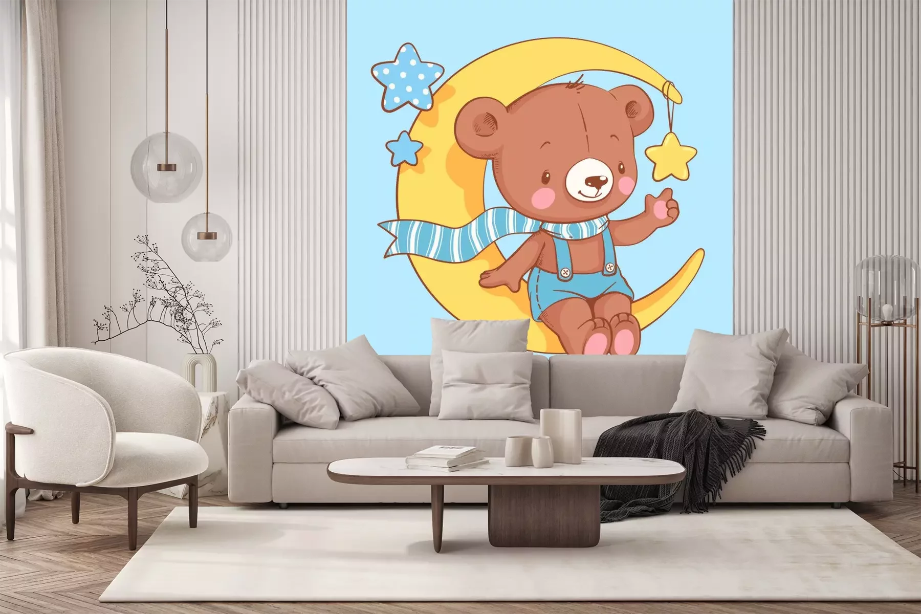 Sticker  Cute baby bear sitting on the moon cartoon hand drawn vector illustration. Can be used for baby t-shirt print, fashion print design, kids wear, baby shower celebration greeting and invitation card.