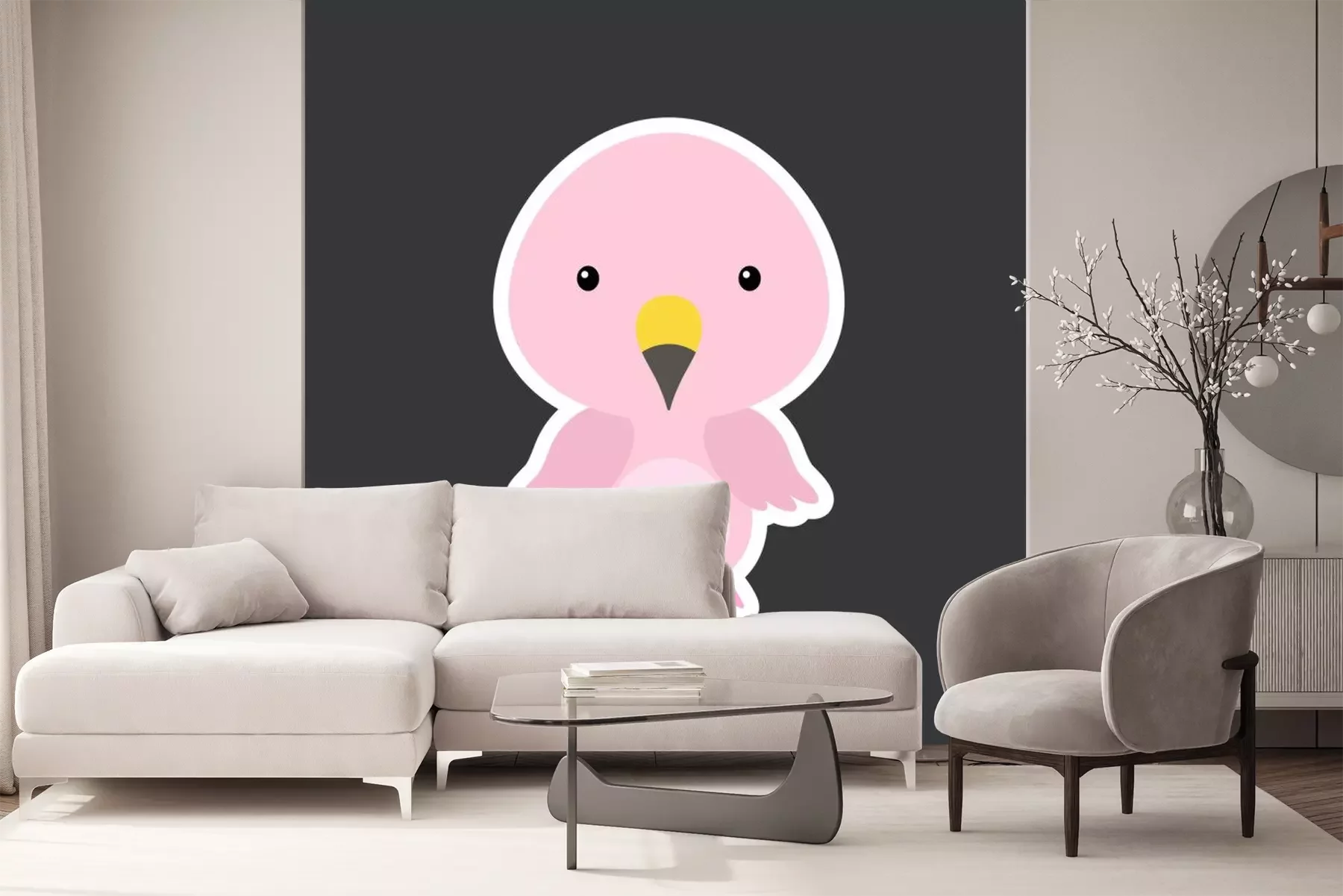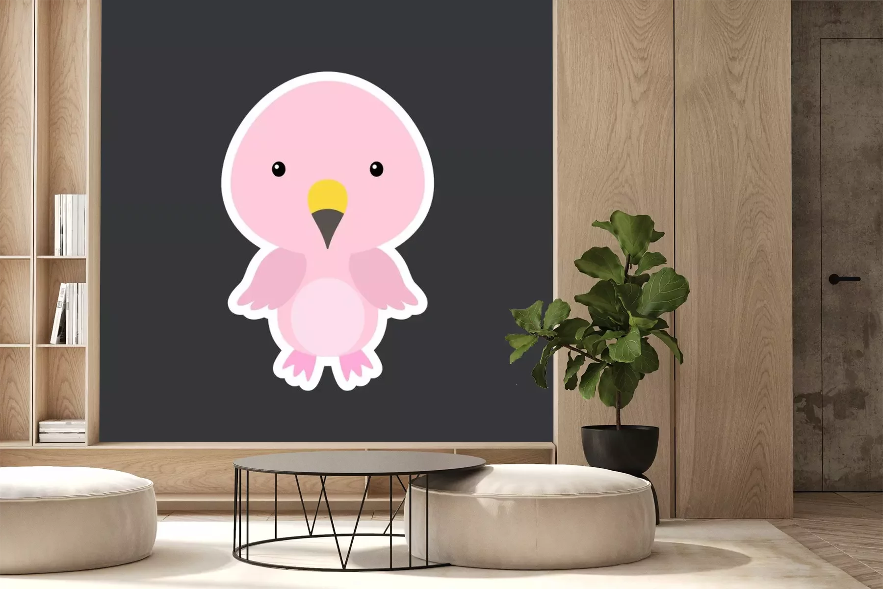 Sticker  Cute funny baby flamingo sticker. Tropical adorable bird character for design of album, scrapbook, card, poster, invitation. Flat cartoon colorful vector stock illustration.