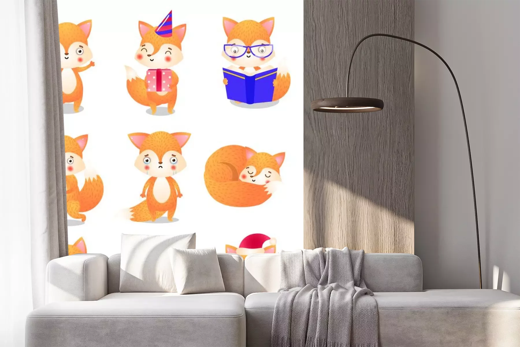 Sticker  Cute little fox in action set. Raster illustration in flat cartoon style