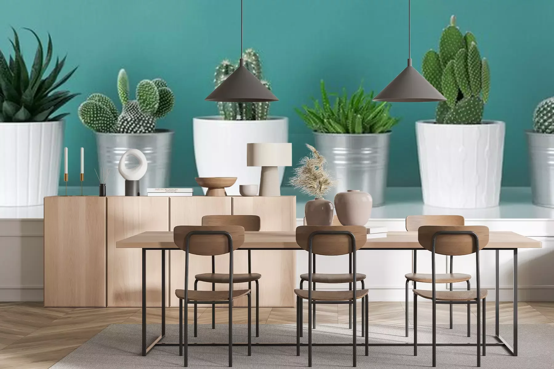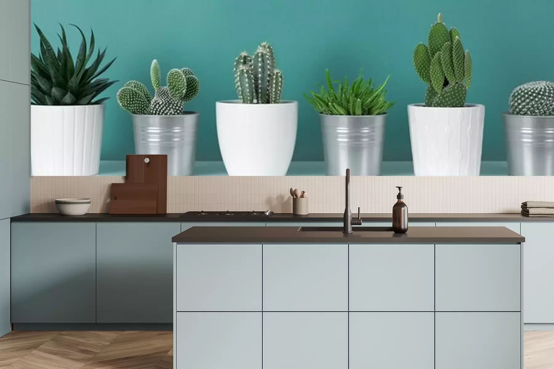 Sticker  Décoration de la chambre moderne. Collection de diverses plantes de maison de cactus en pot sur une étagère blanche contre un mur de couleur turquoise pastel. Bannière de plantes de cactus.