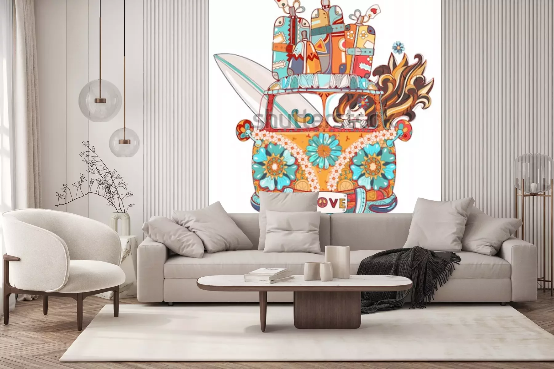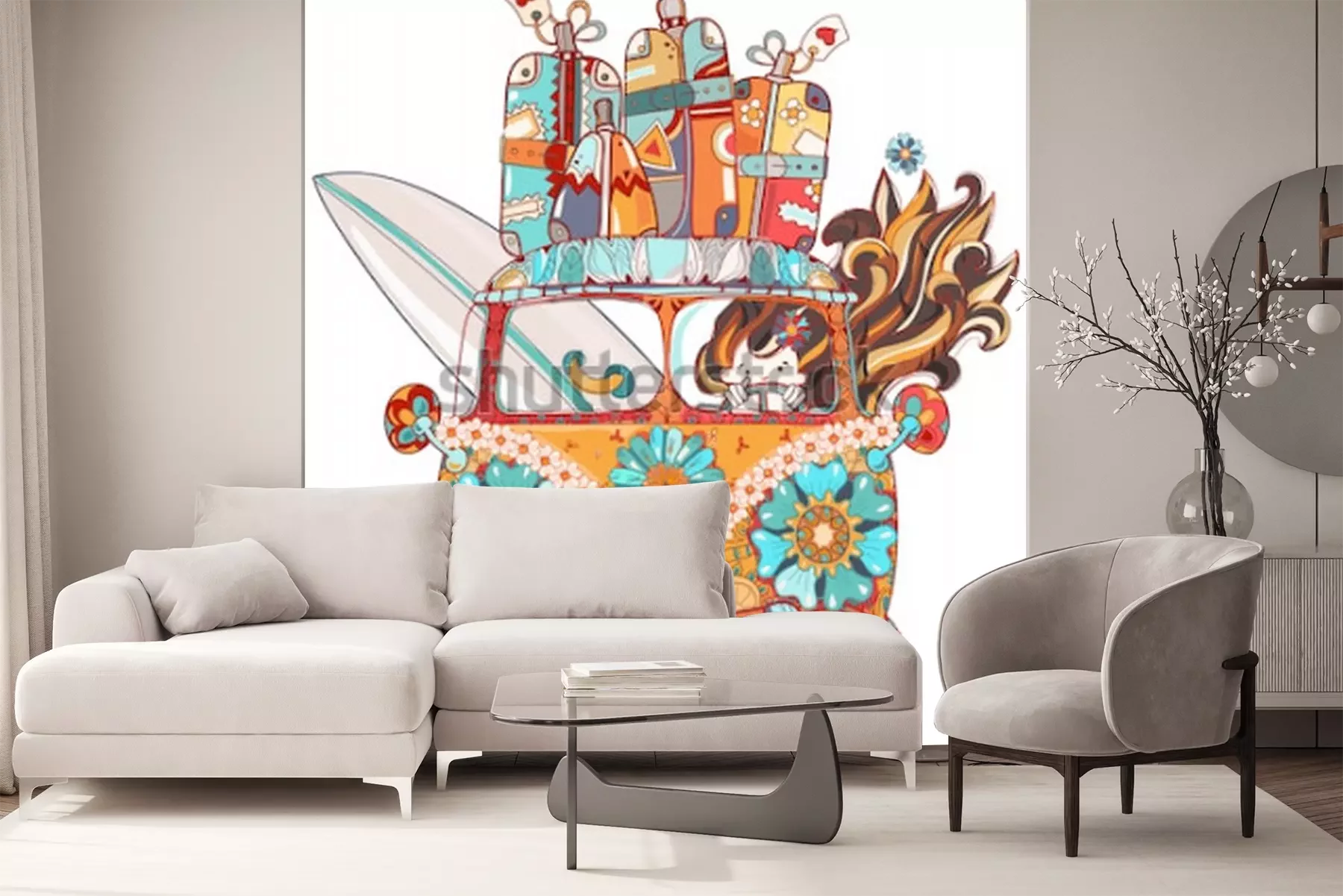 Sticker  Dessinés à la main doodle contour rétro bus voyage décoré avec vue de face d'ornements. Illustration de vecteur zen art.Ornement floral.Esquisse pour le style de tatouage ou printBoho.