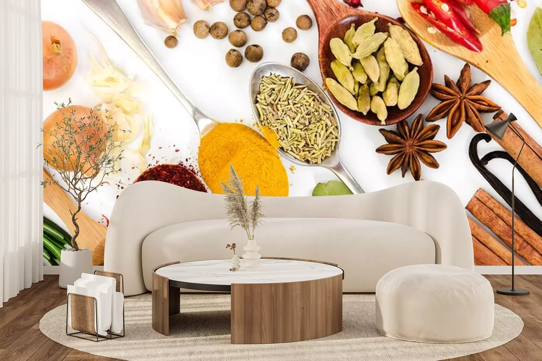 Sticker  Différents épices dans des cuillères sur fond blanc.
