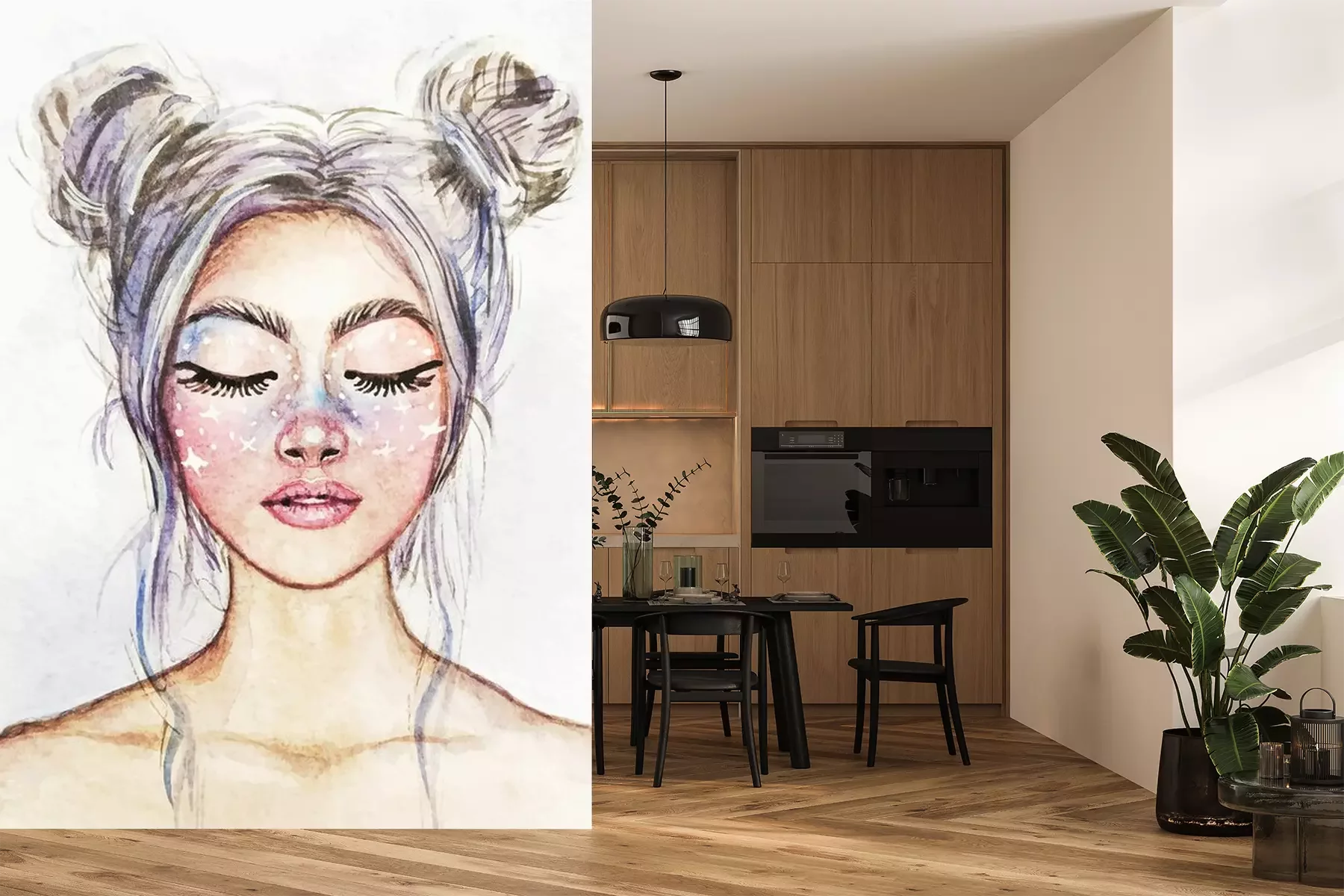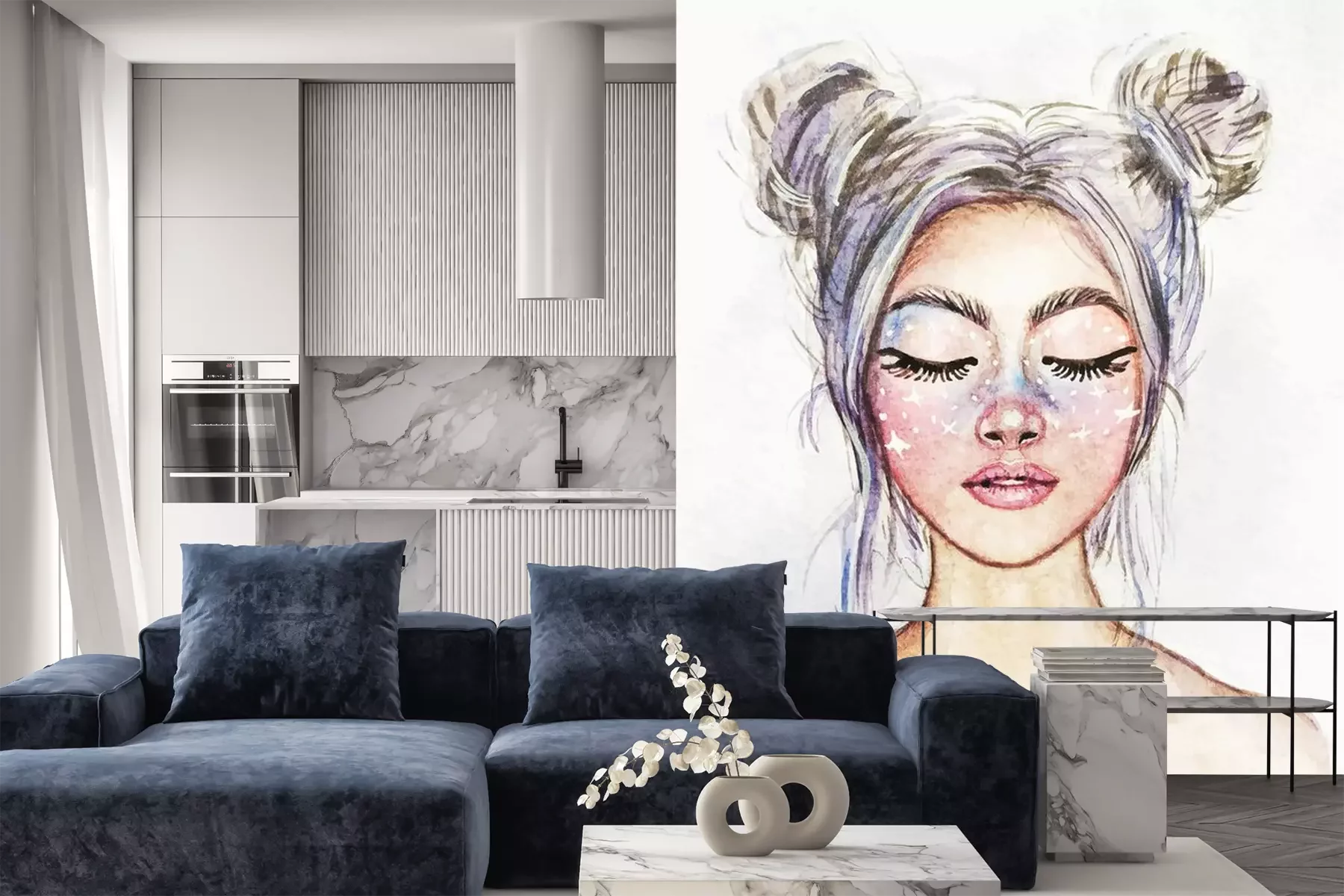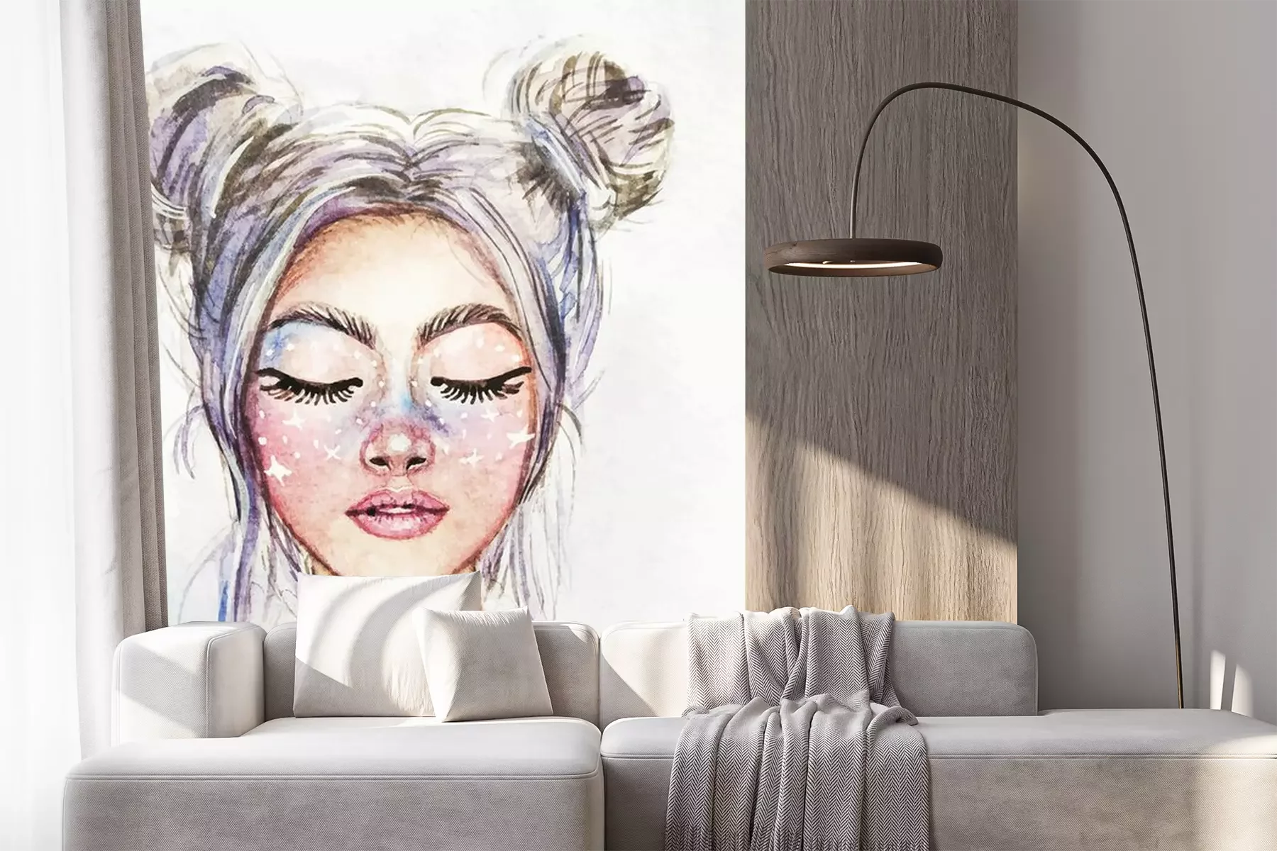 Sticker  Drawing of a fantastic girl with a beautiful make-up. Snow Queen. Watercolor illustration.