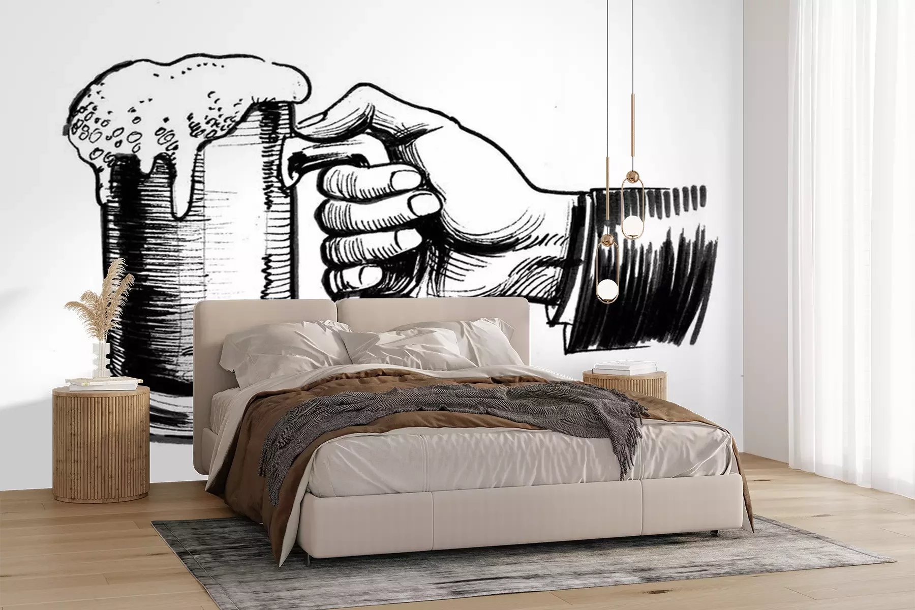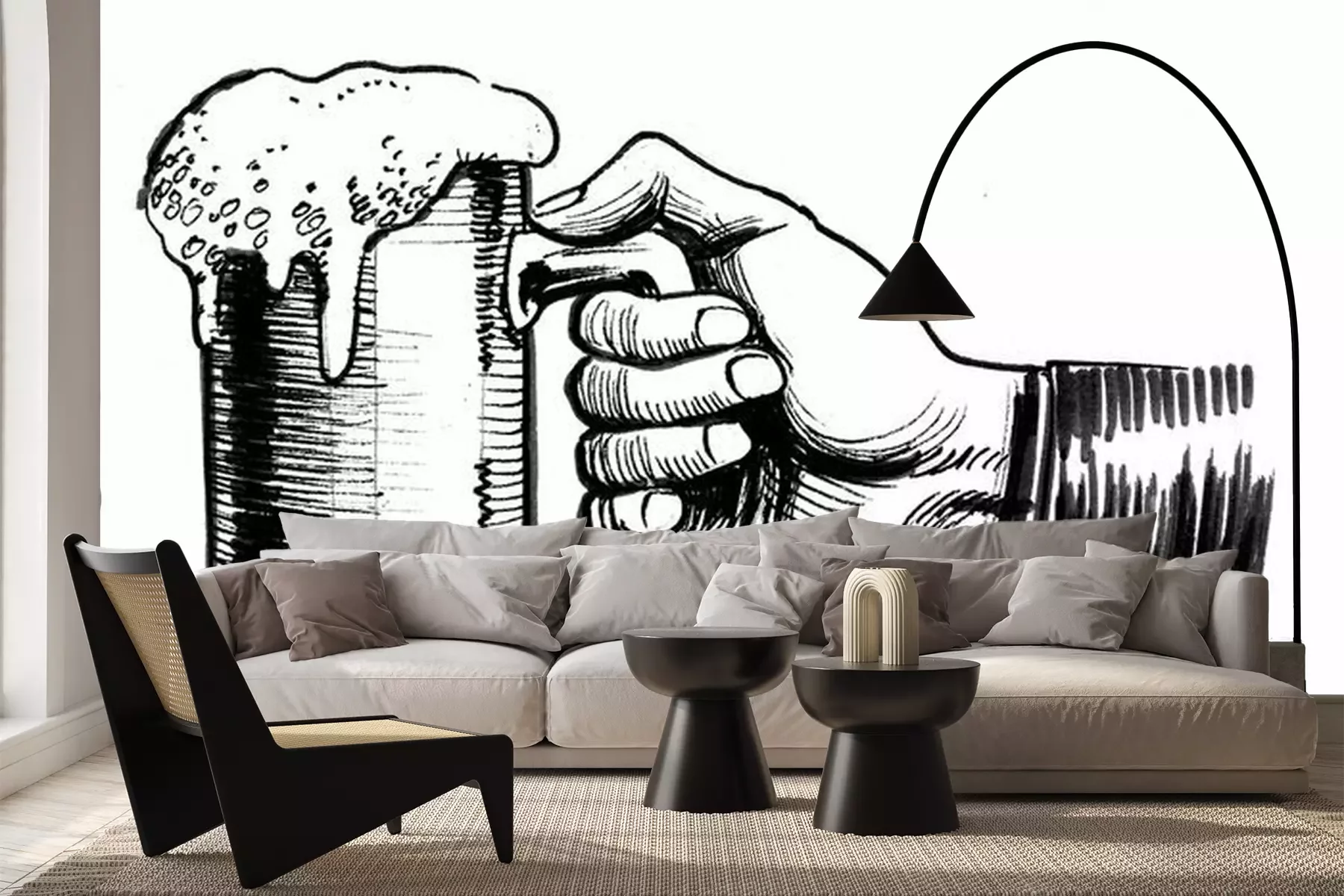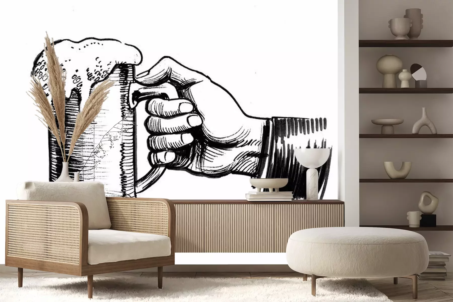Sticker  Encre noir et blanc dessin d'une main tenant une chope de bière