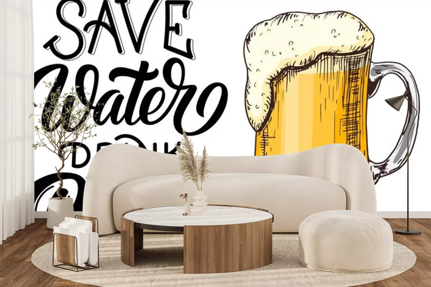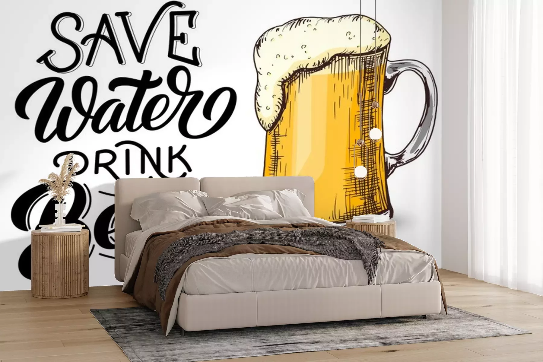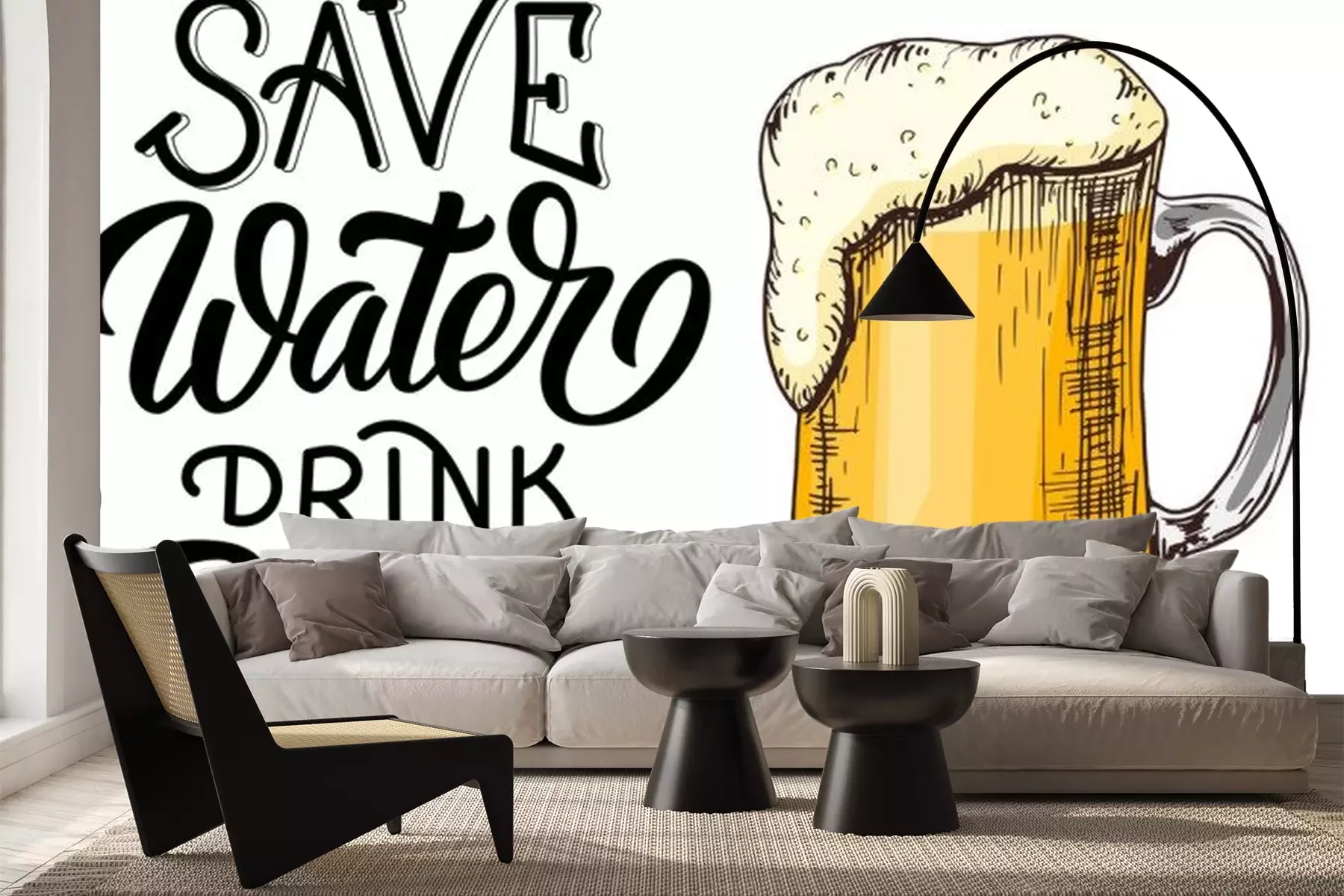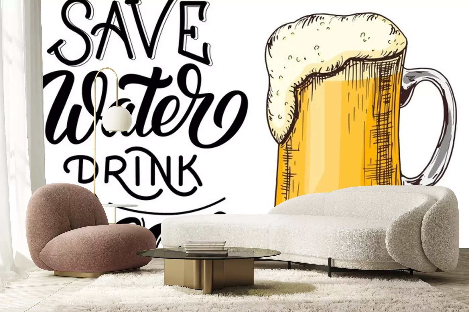 Sticker  Enregistrer l'eau potable bière lettrage à la main, calligraphie vintage, écriture de brosse sur fond blanc avec croquis de mug brouillon. Illustration de boisson de vecteur.